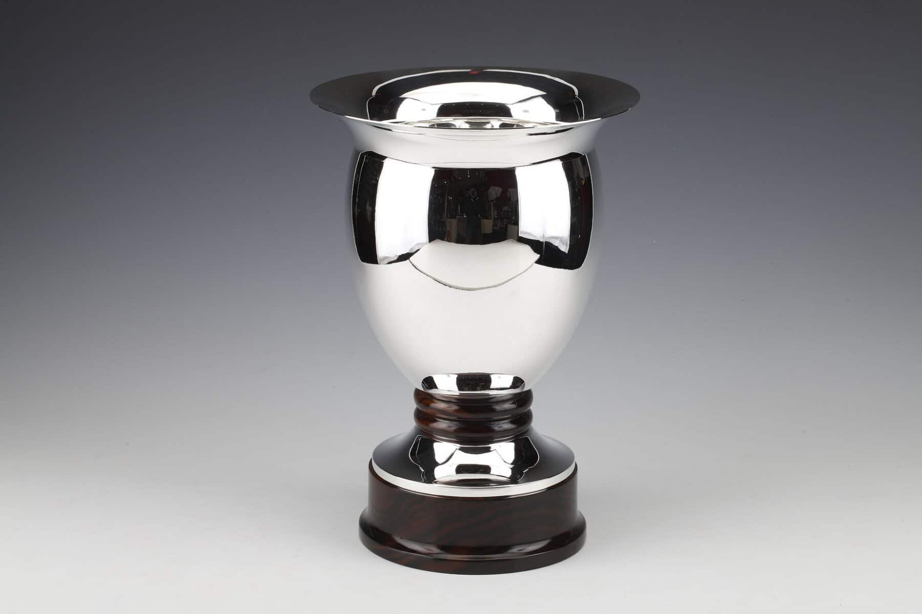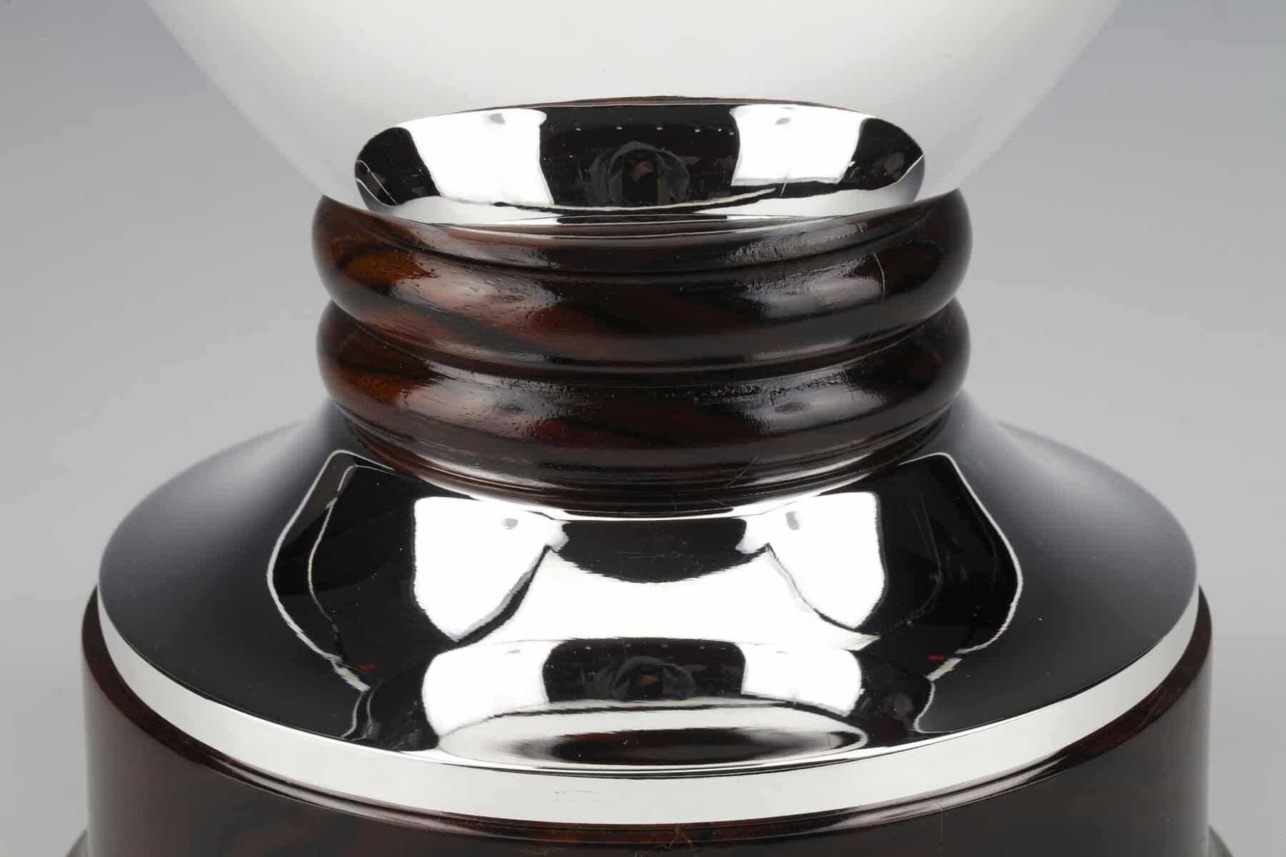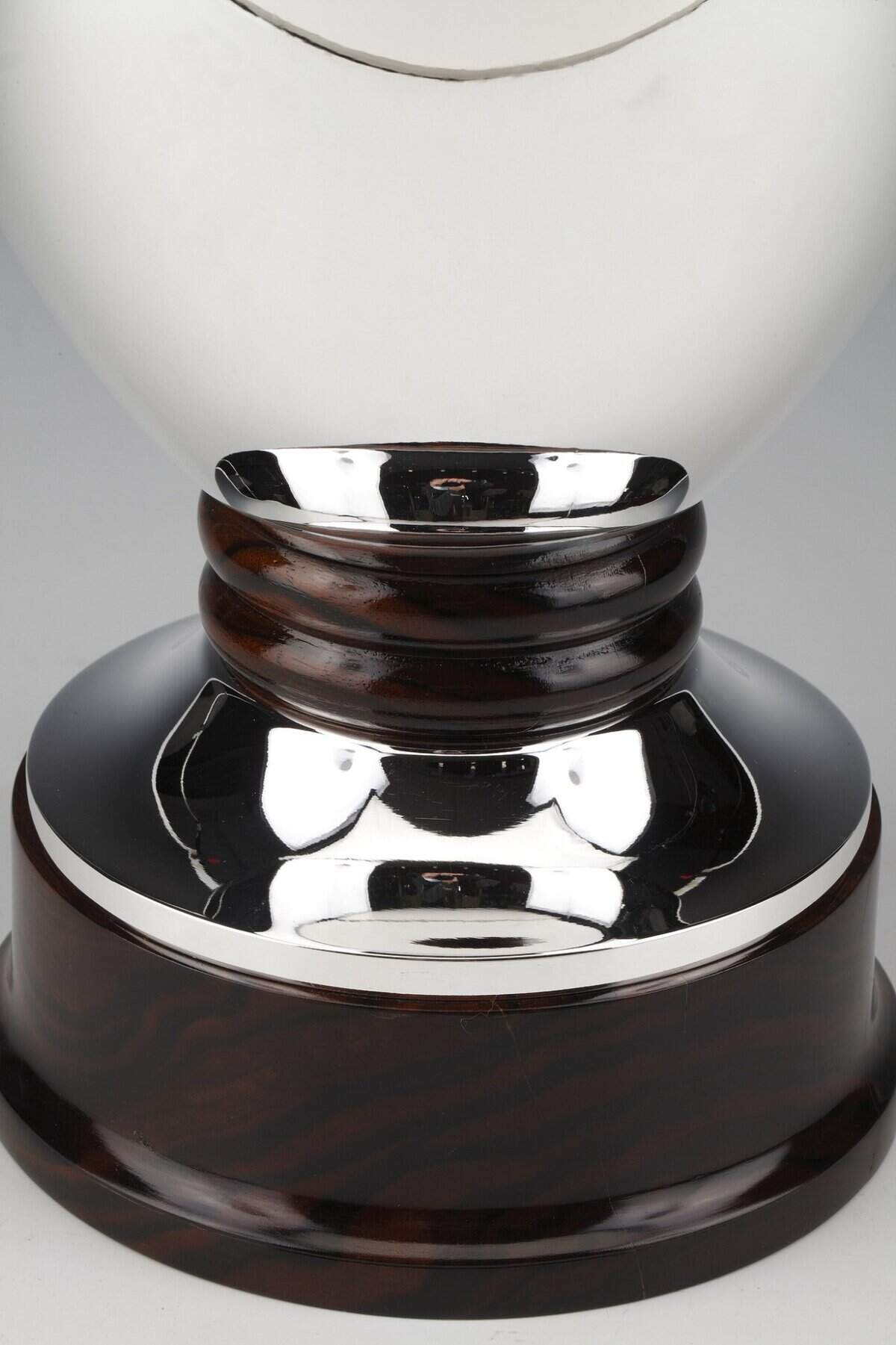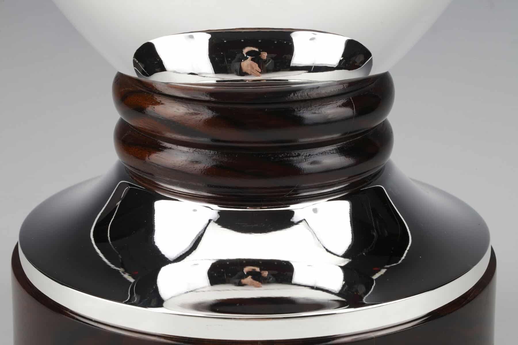 Vase en argent massif de forme ovoïde d’époque ART DECO, monté sur un socle en bois cerclé de deux anneaux aussi en bois. Le corps uni se termine par un col plat évasé.