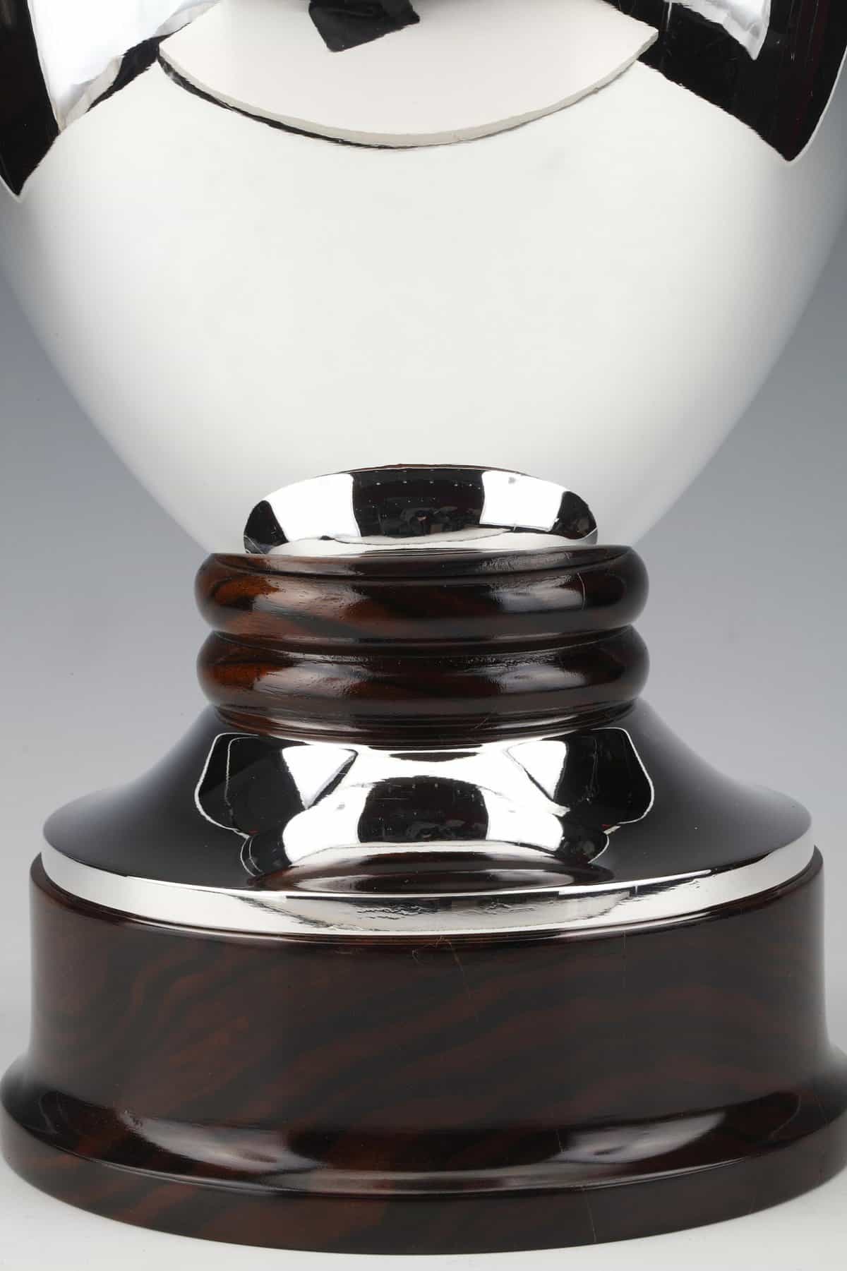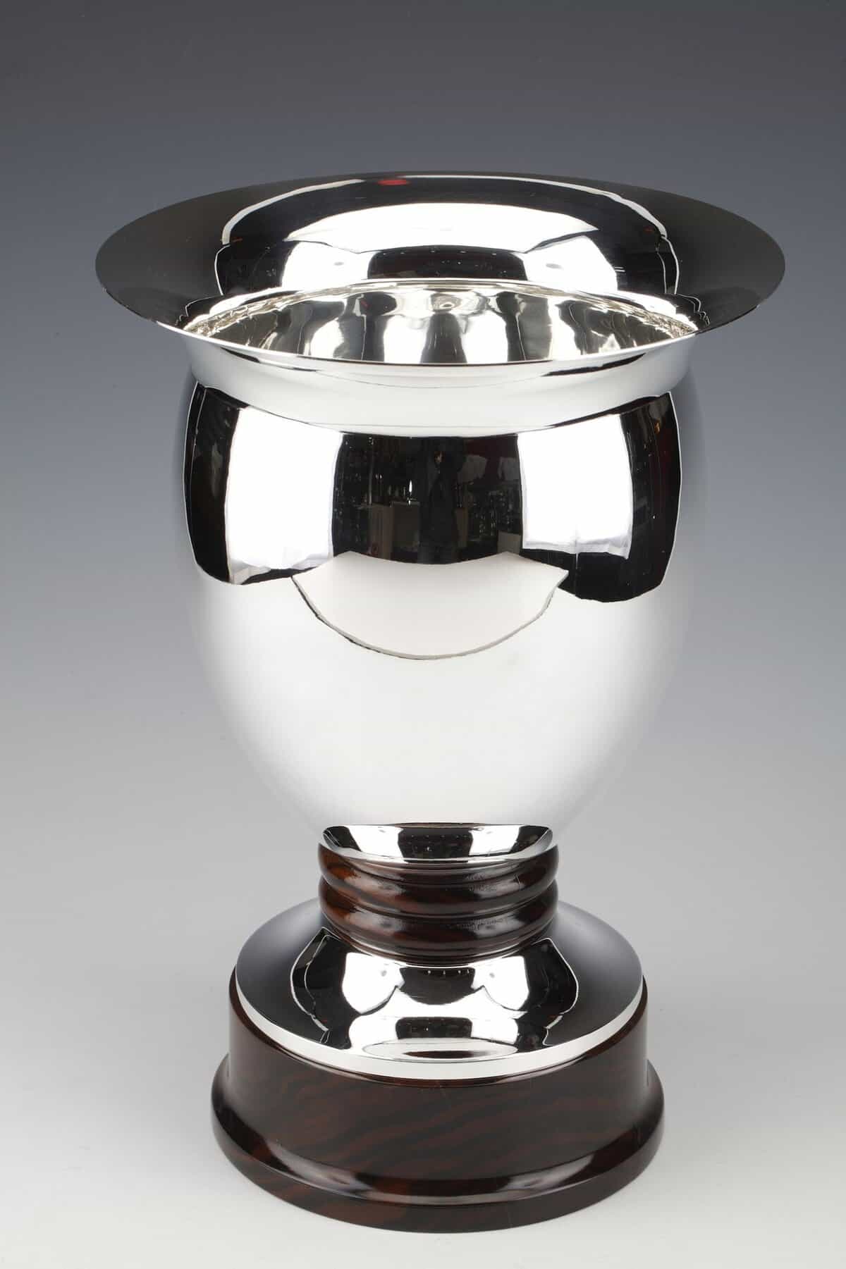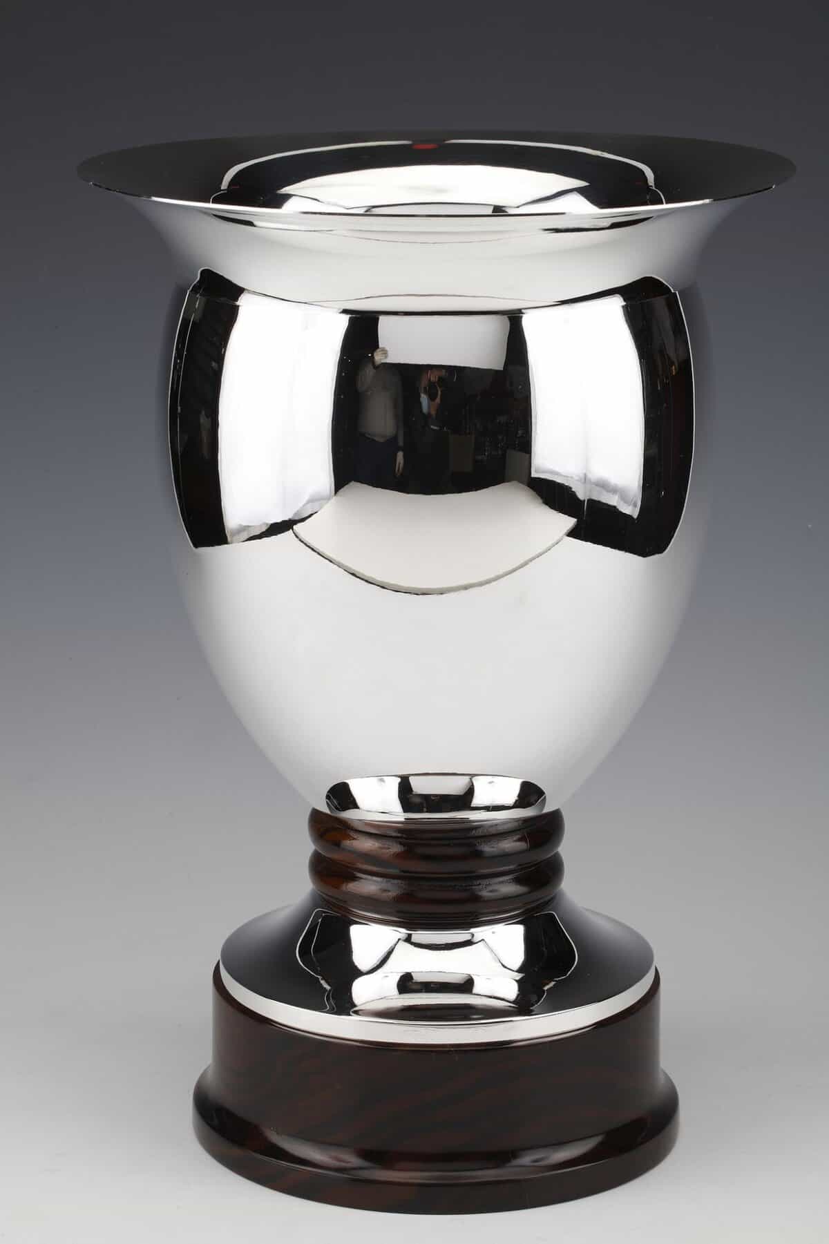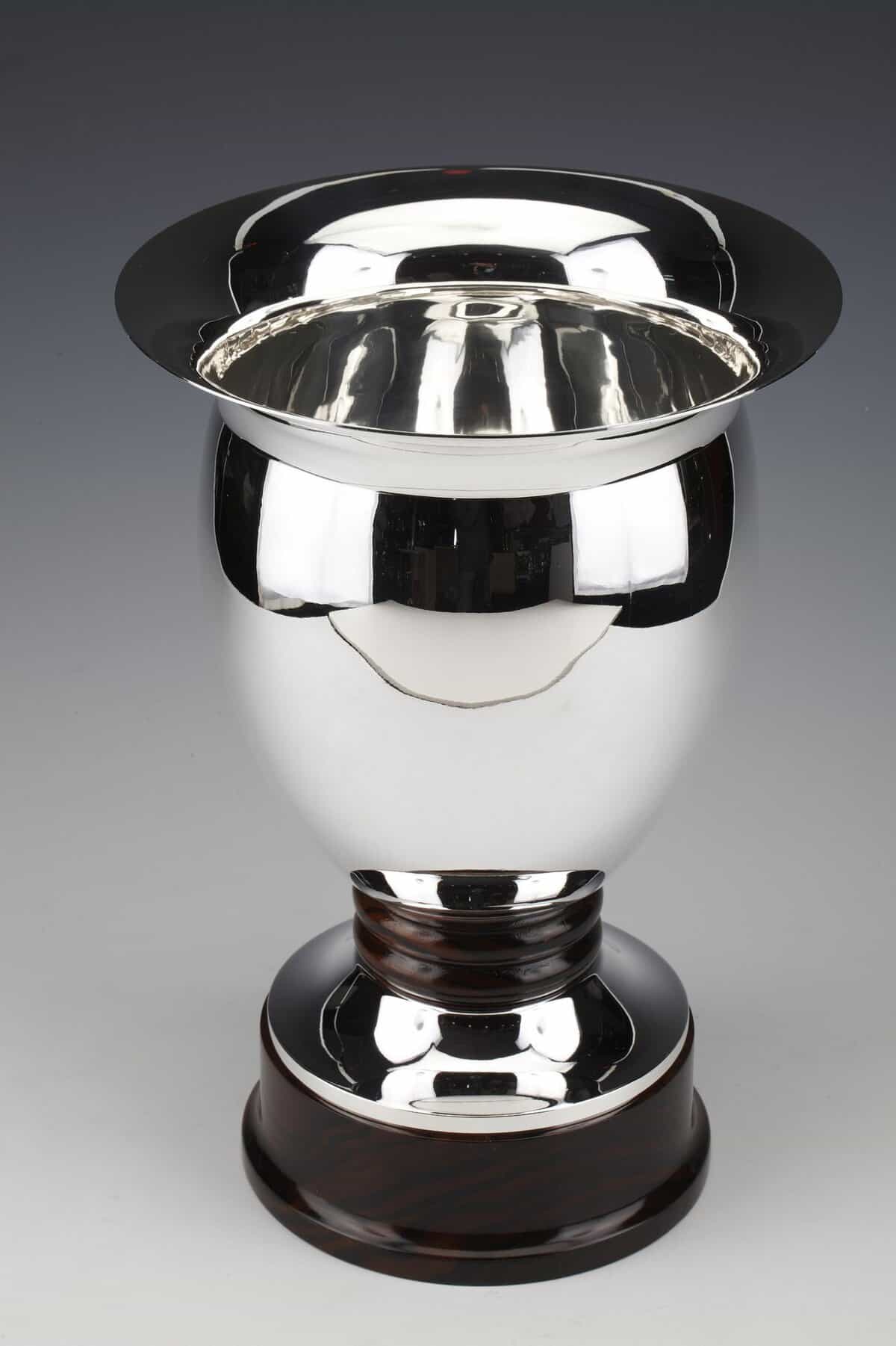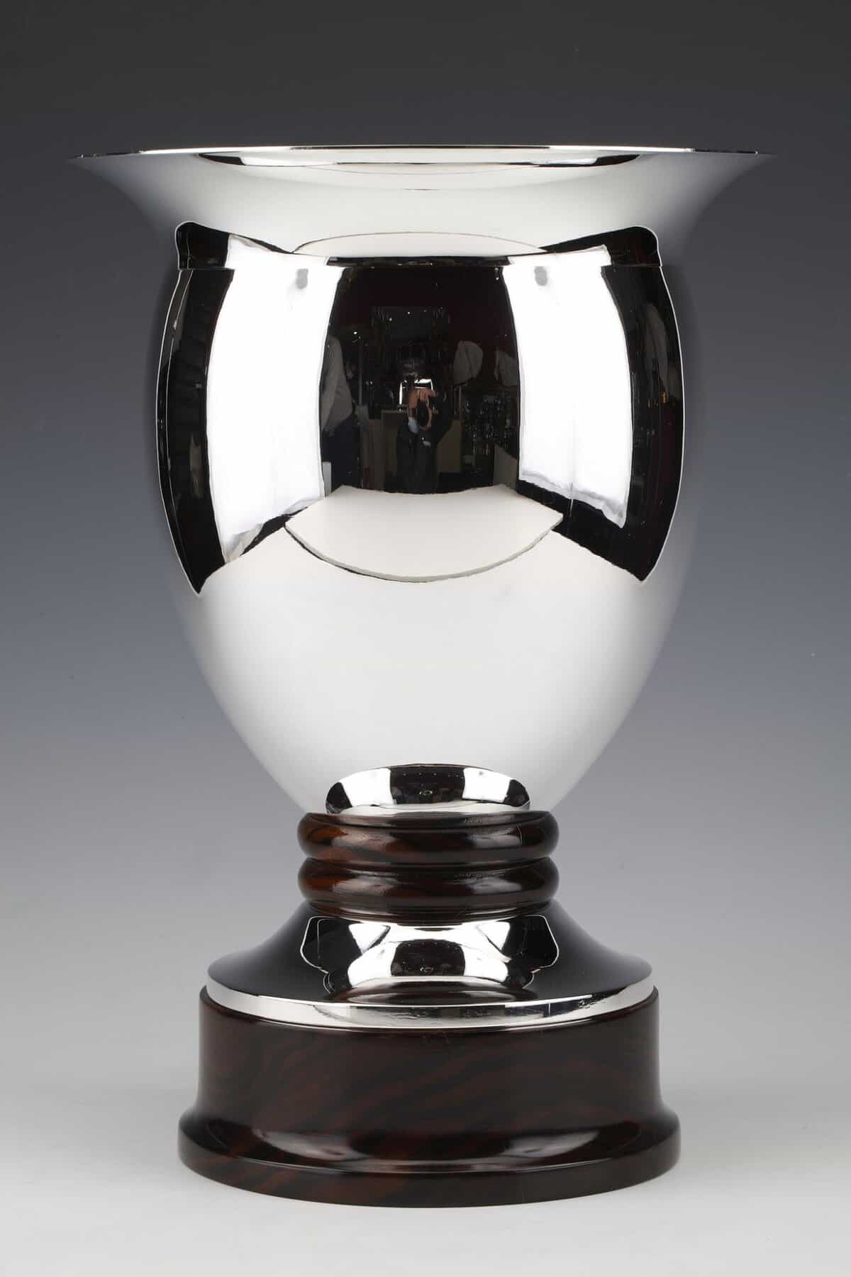 Vase en argent massif de forme ovoïde d’époque ART DECO, monté sur un socle en bois cerclé de deux anneaux aussi en bois. Le corps uni se termine par un col plat évasé.