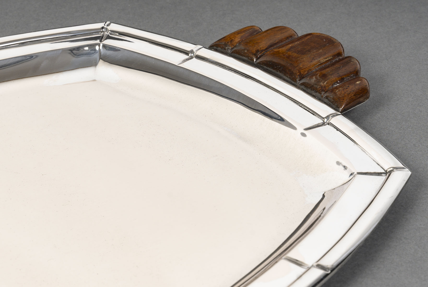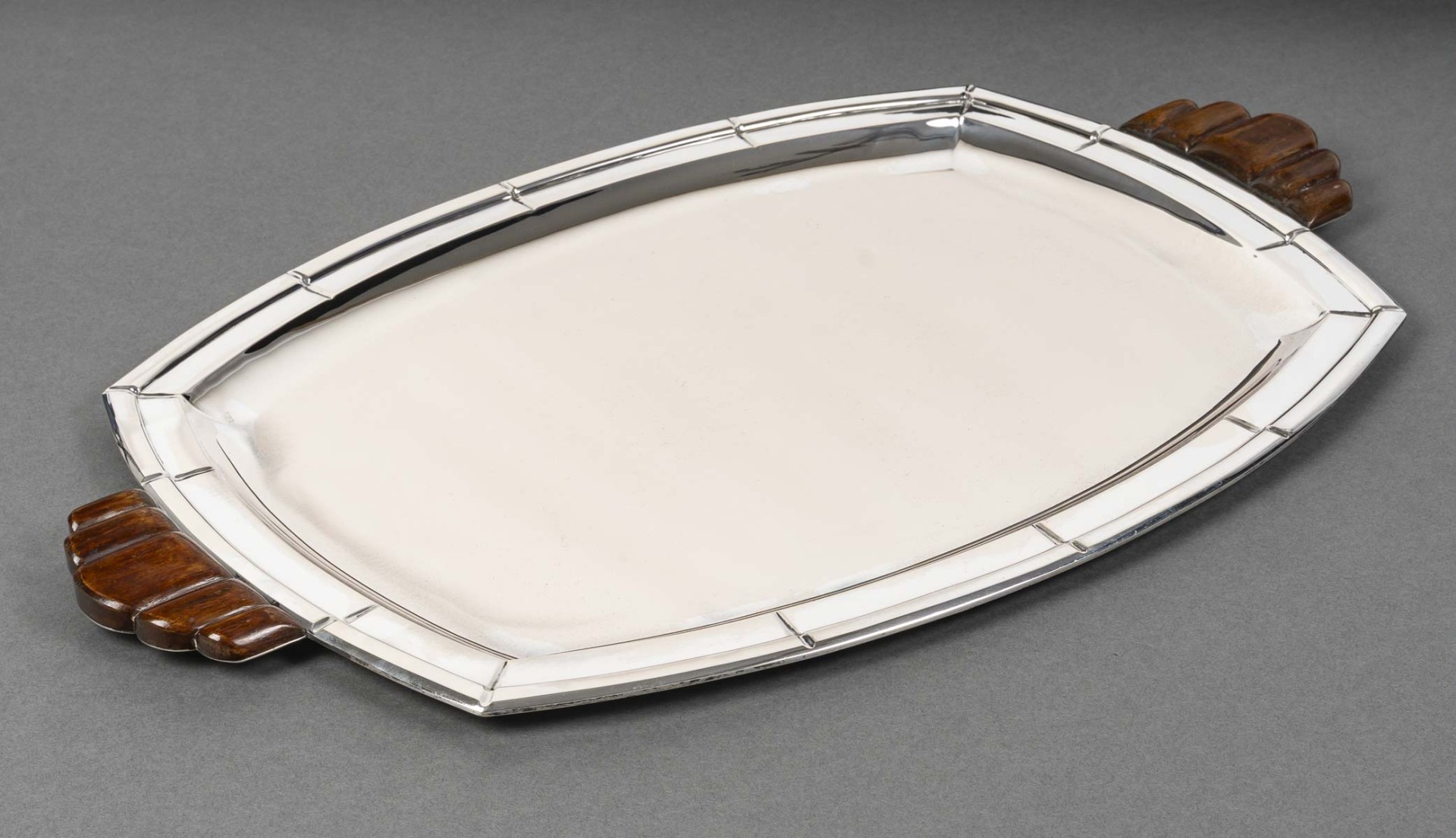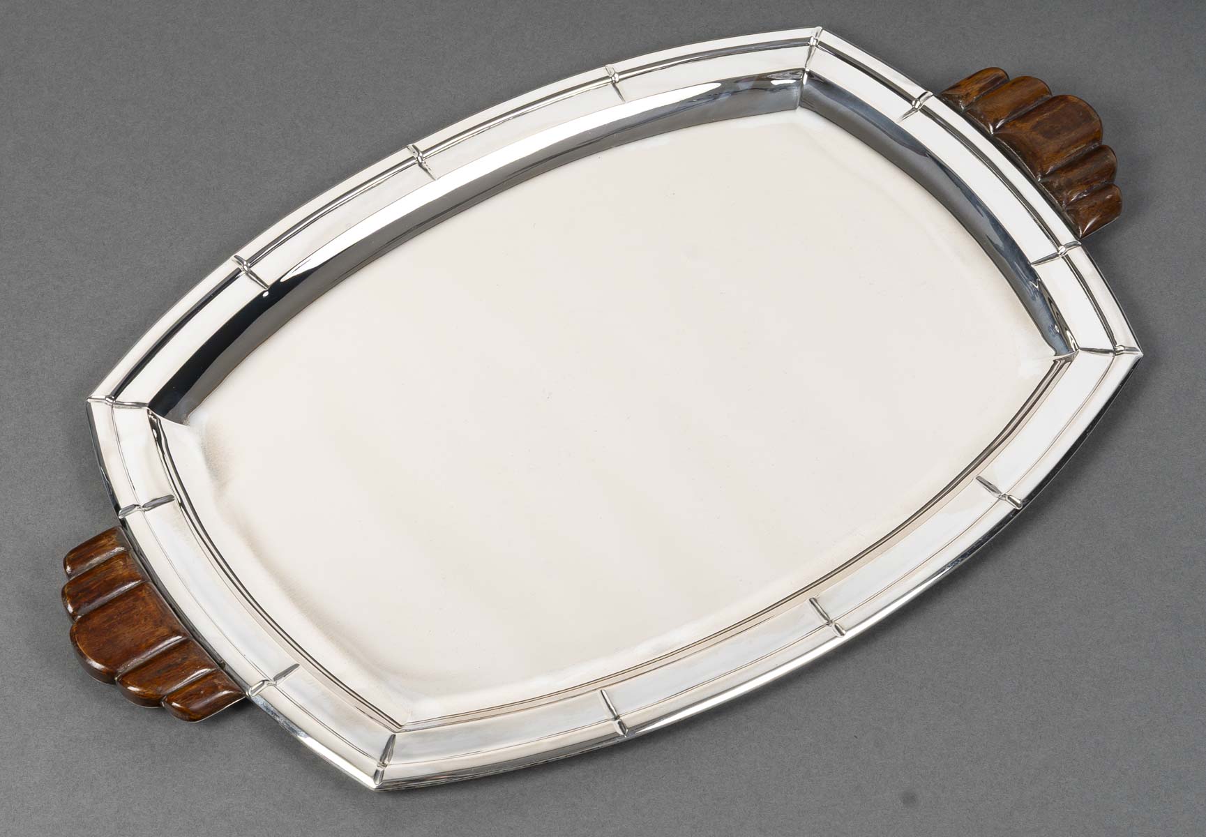 Grand plateau de forme ovale à contours géométriques, monture en argent massif soulignée de filets nervurés. Les anses latérales sculptées en bois, à décor nervuré en éventail, apportent un contraste raffiné entre la brillance du métal et la chaleur de l’essence. Travail belge de l’orfèvre Albert Charlent, actif dans la première moitié du XXᵉ siècle. Pièce élégante et représentative du style Art Déco belge, alliant rigueur géométrique et matériaux nobles.