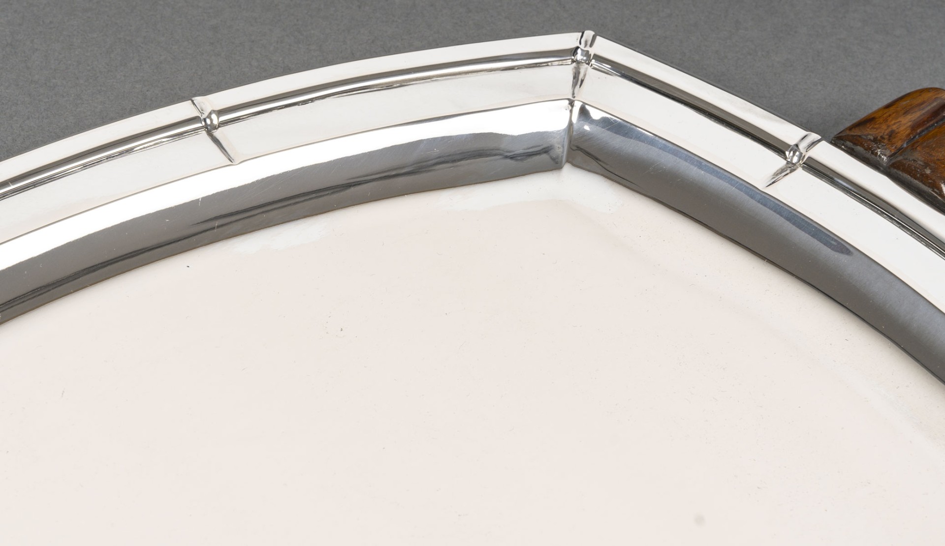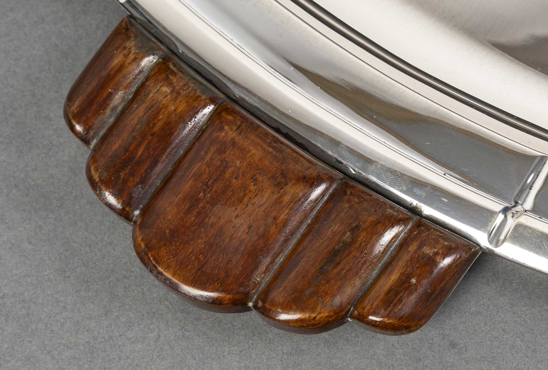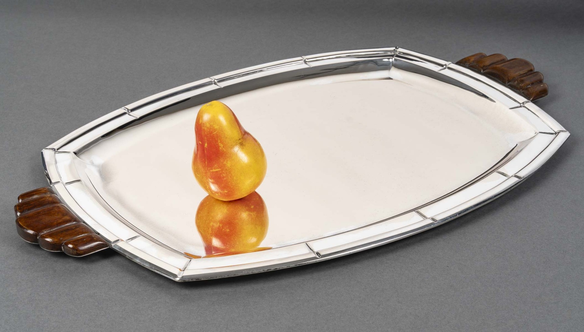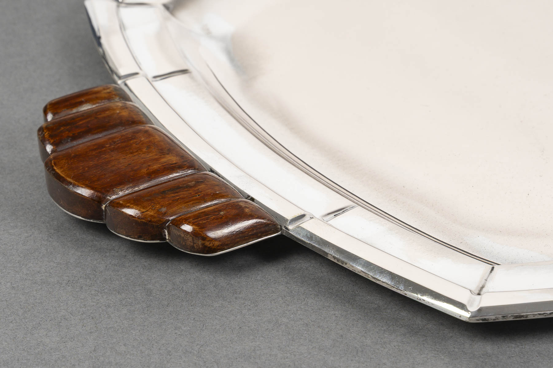 Grand plateau de forme ovale à contours géométriques, monture en argent massif soulignée de filets nervurés. Les anses latérales sculptées en bois, à décor nervuré en éventail, apportent un contraste raffiné entre la brillance du métal et la chaleur de l’essence. Travail belge de l’orfèvre Albert Charlent, actif dans la première moitié du XXᵉ siècle. Pièce élégante et représentative du style Art Déco belge, alliant rigueur géométrique et matériaux nobles.