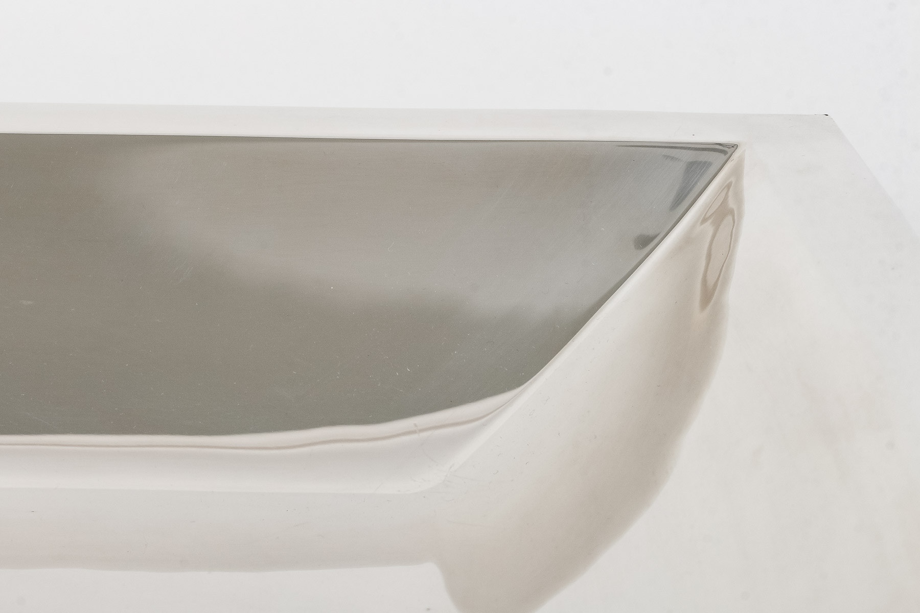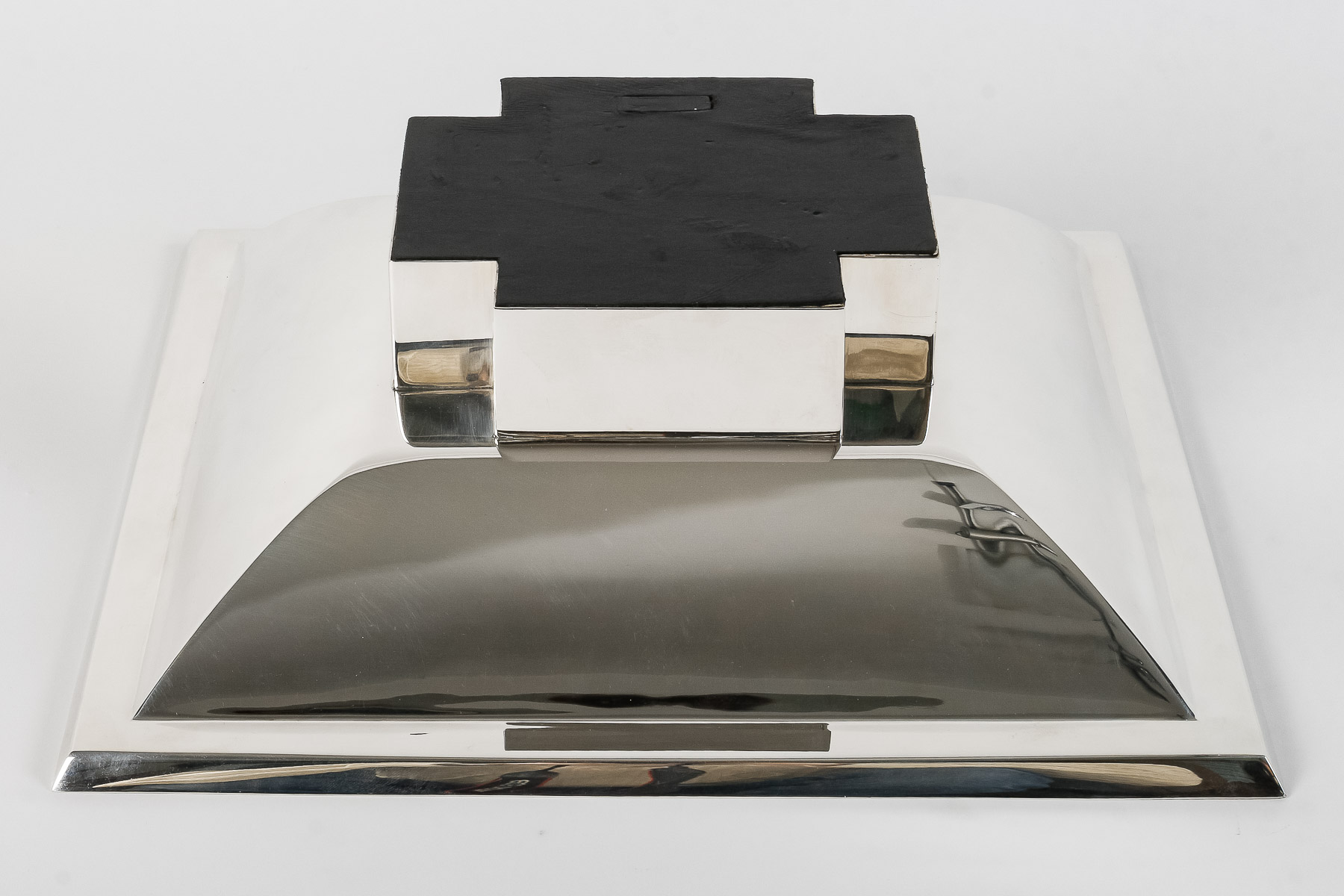Important CENTRE DE TABLE « double carré » modèle créé en 2004 épreuve numérotée 12/30. Le piètement est en forme d’une croix dans le mouvement « constructiviste » sur laquelle est posée une coupe carrée creuse à doucine.