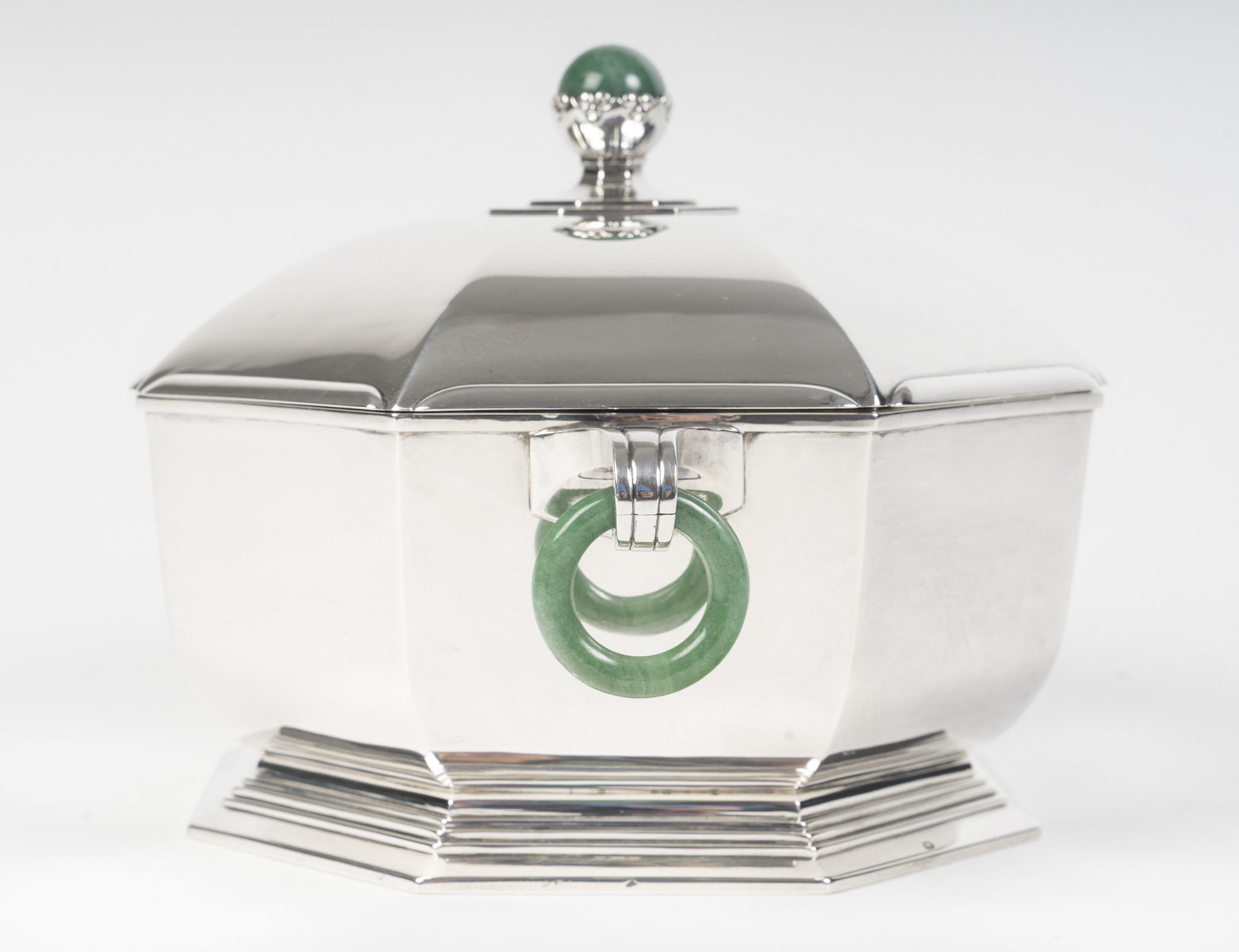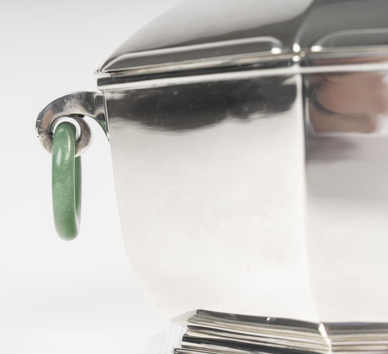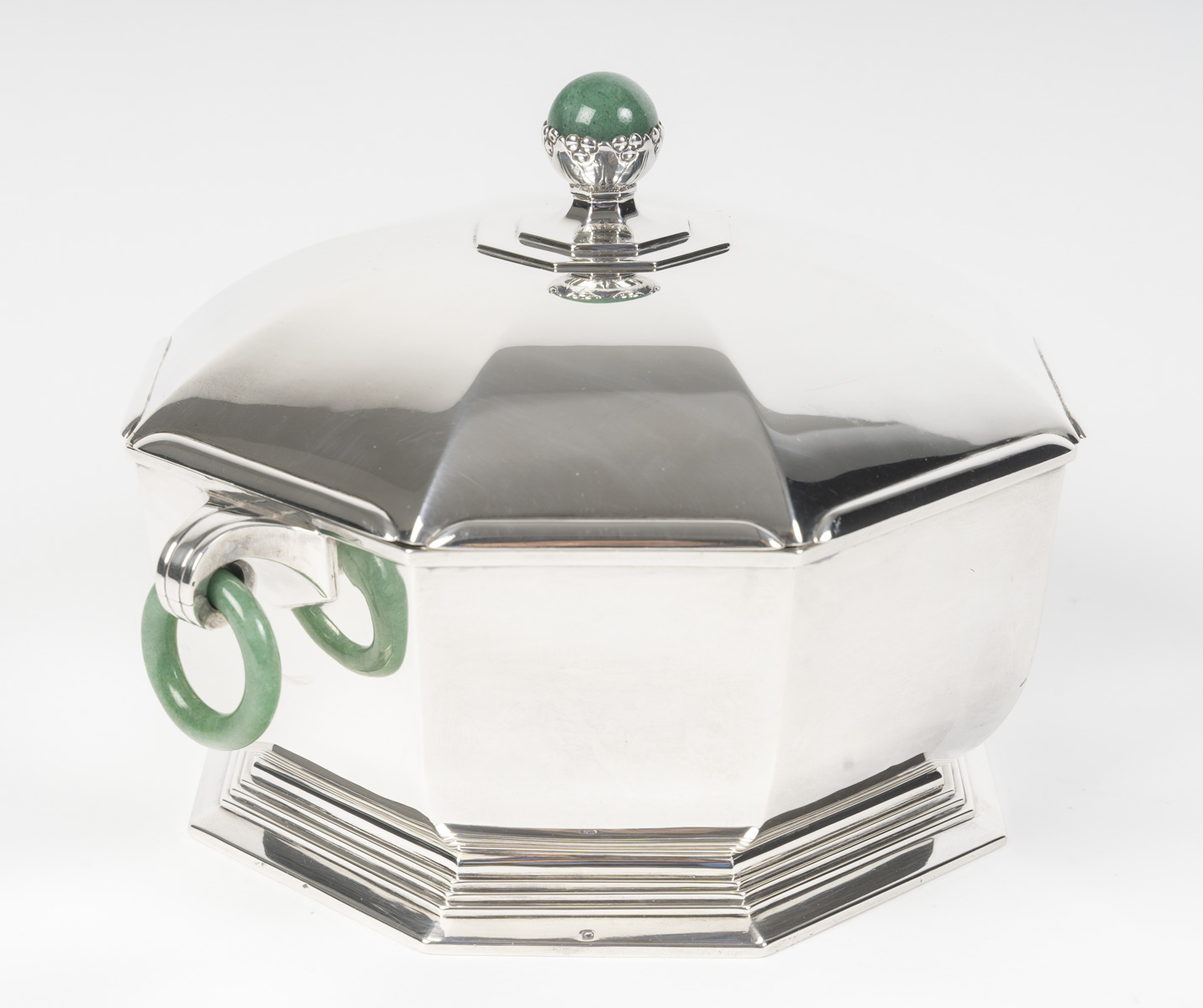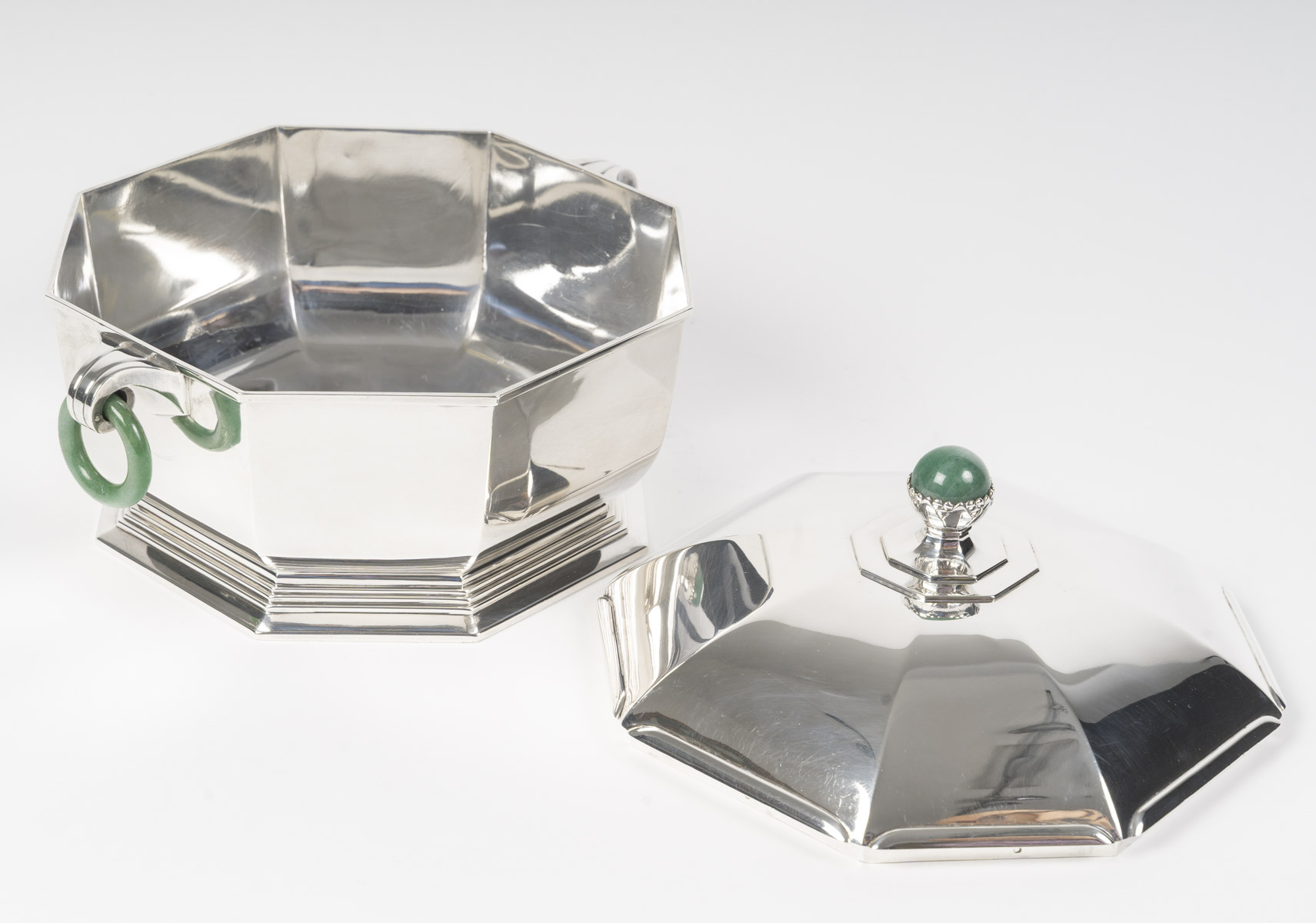 Légumier couvert en argent massif de forme ronde octogonale posé sur une base à gradins, le corps à pans coupés est flanqué de deux anses anneau en jade, le couvercle à doucine également à pans coupés est surmonté d’une prise représentée par une boule de jade sertie d’argent ;