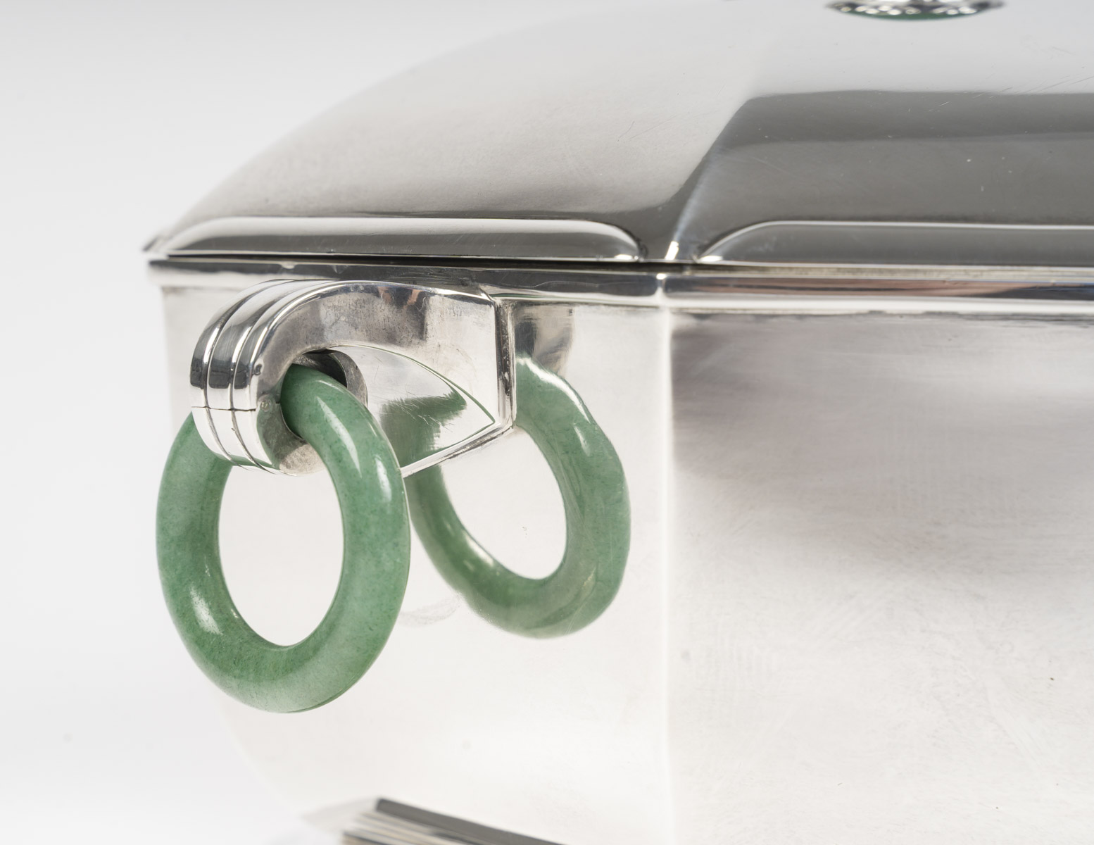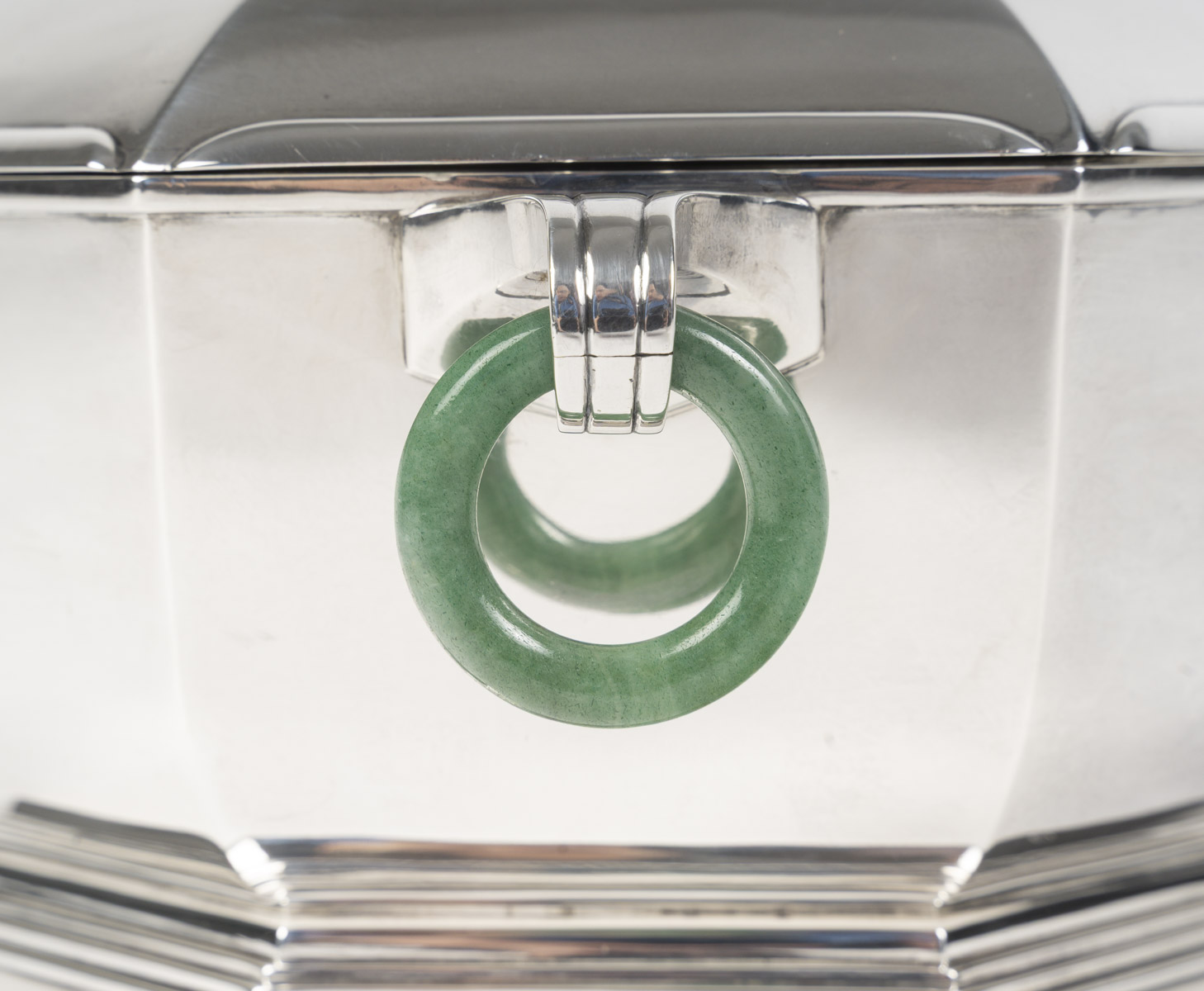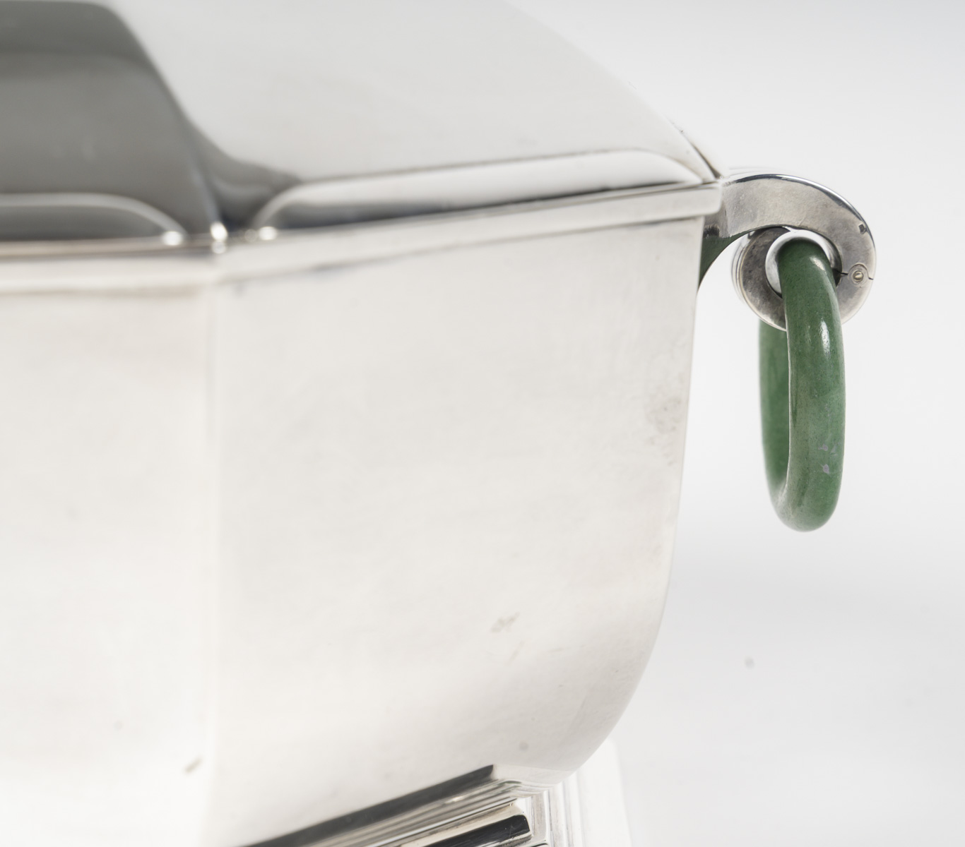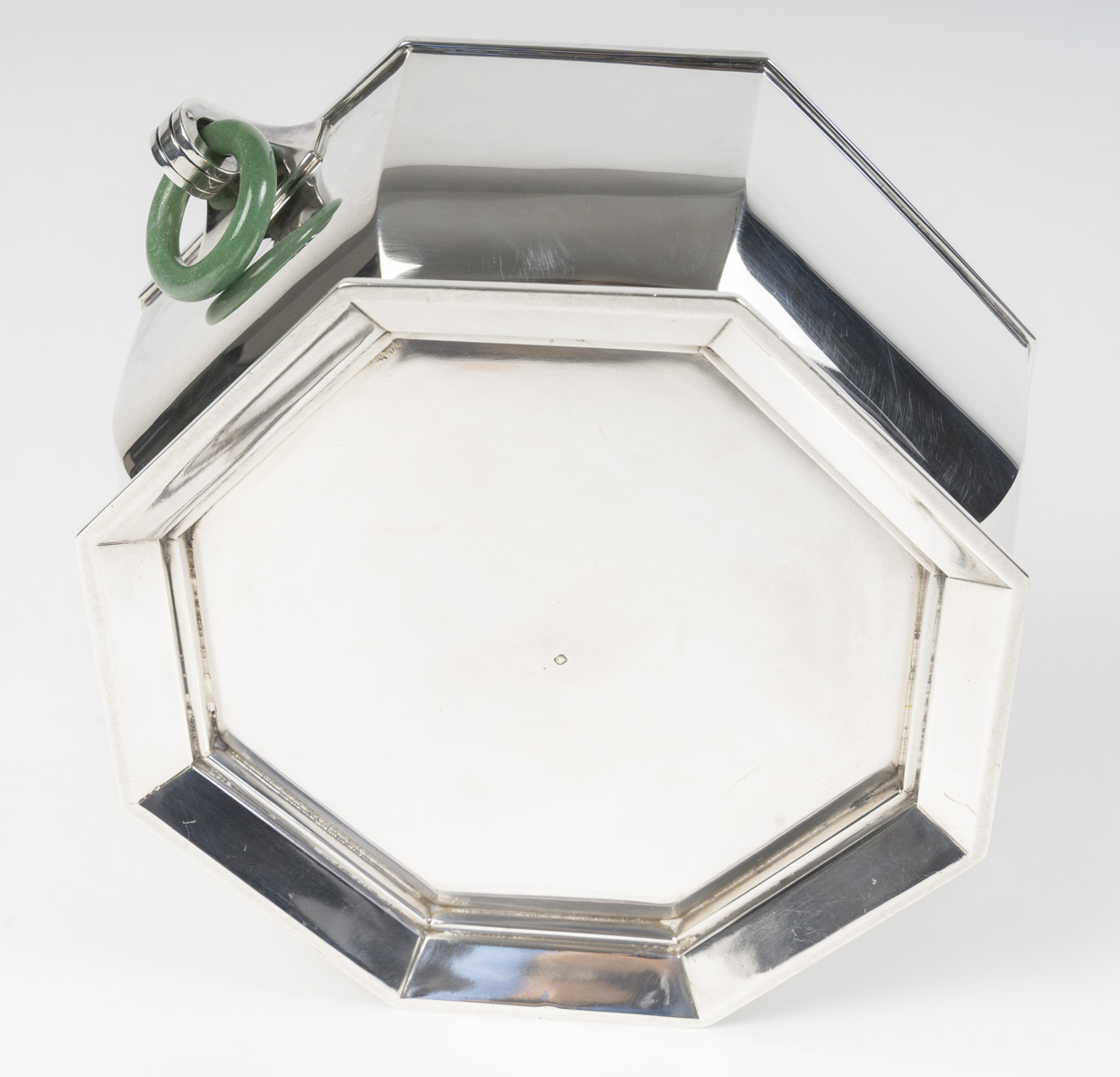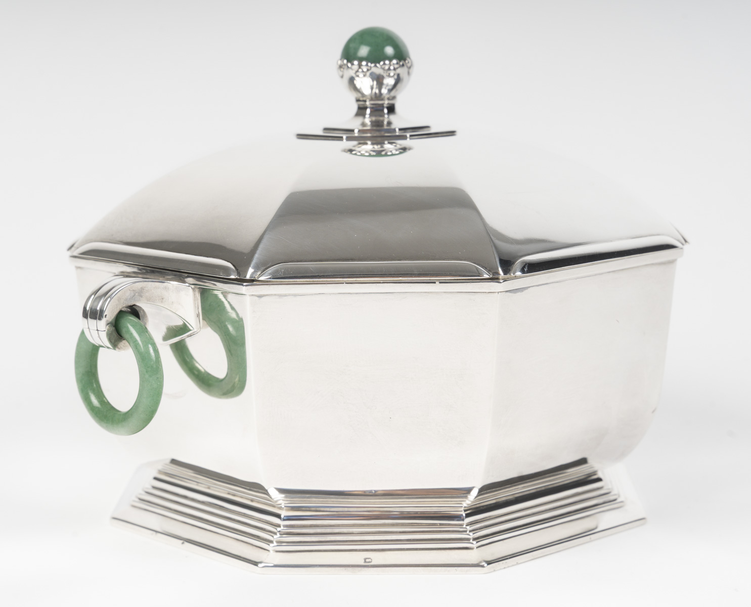 Légumier couvert en argent massif de forme ronde octogonale posé sur une base à gradins, le corps à pans coupés est flanqué de deux anses anneau en jade, le couvercle à doucine également à pans coupés est surmonté d’une prise représentée par une boule de jade sertie d’argent ;