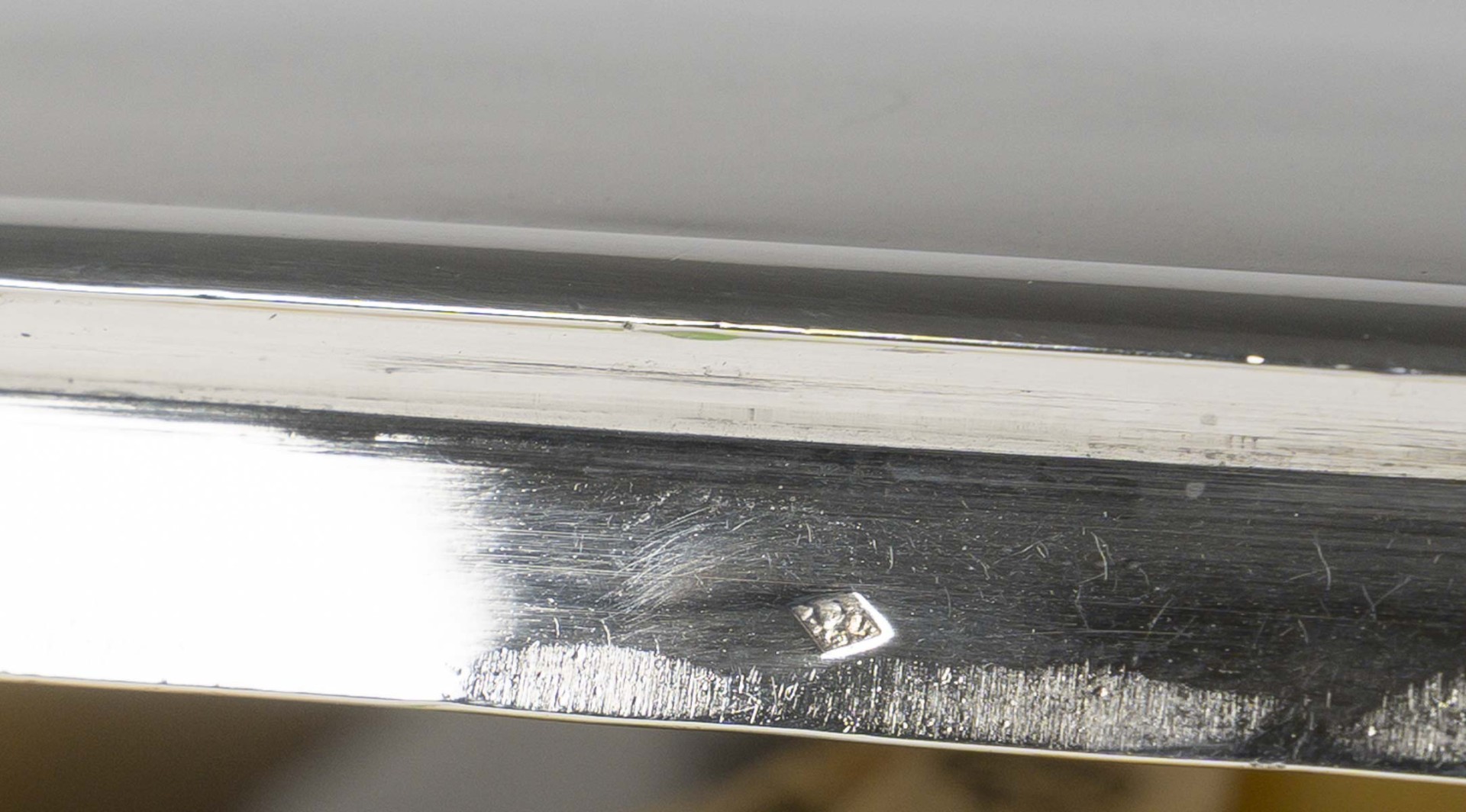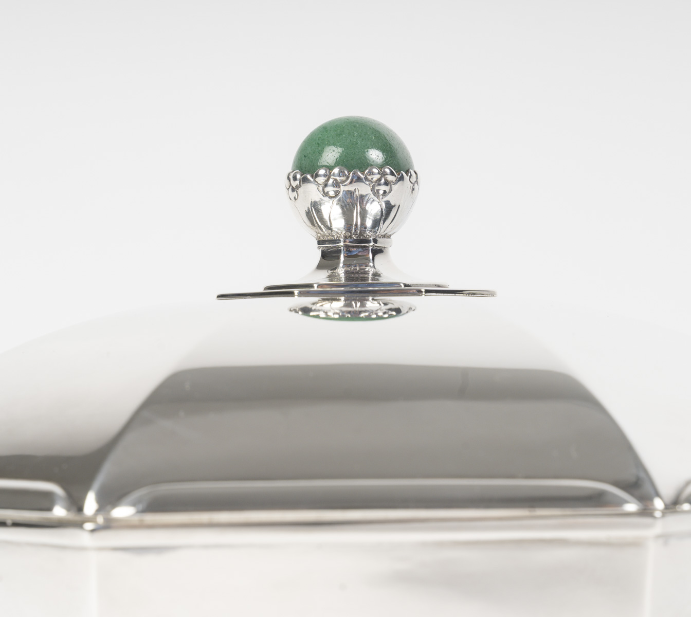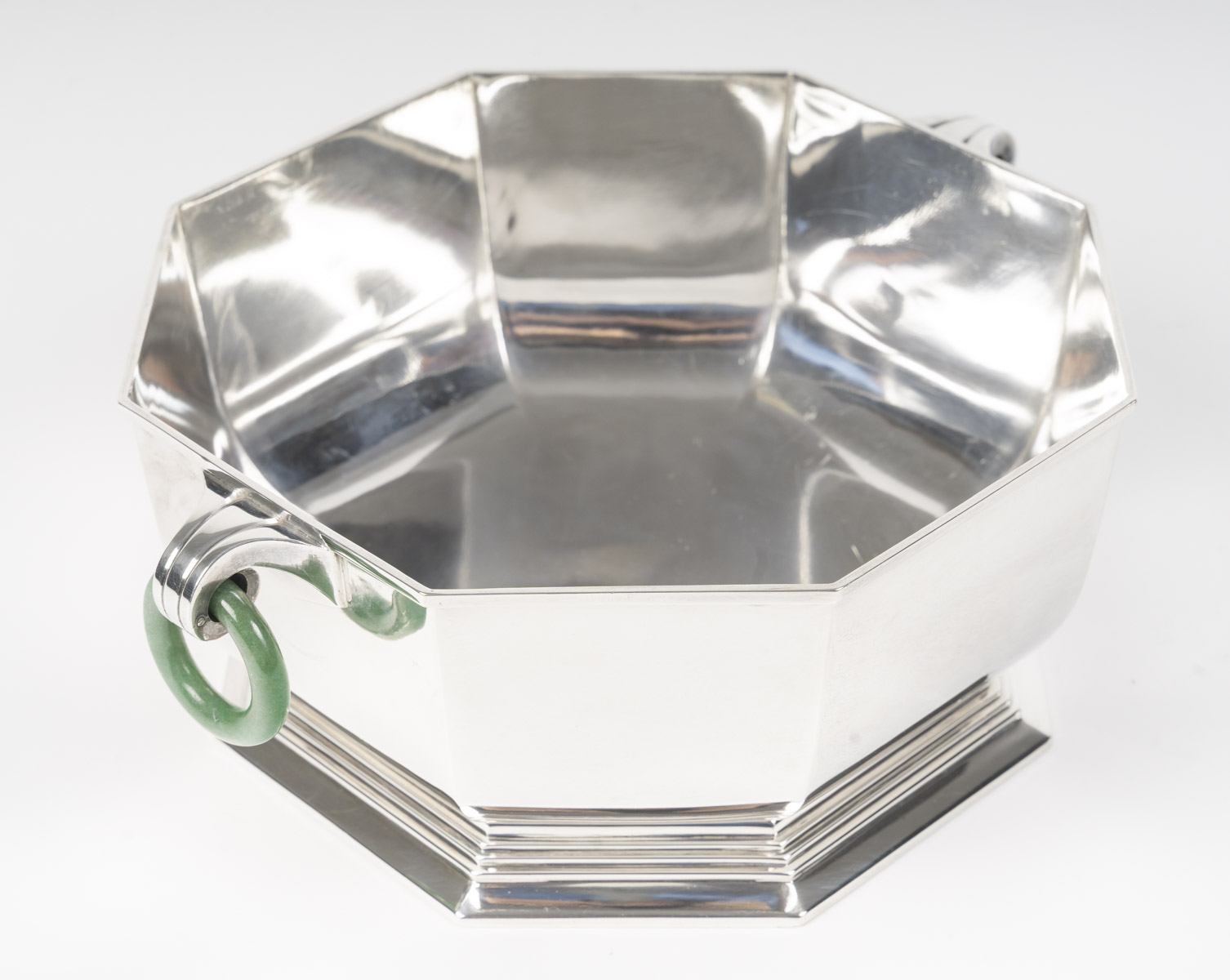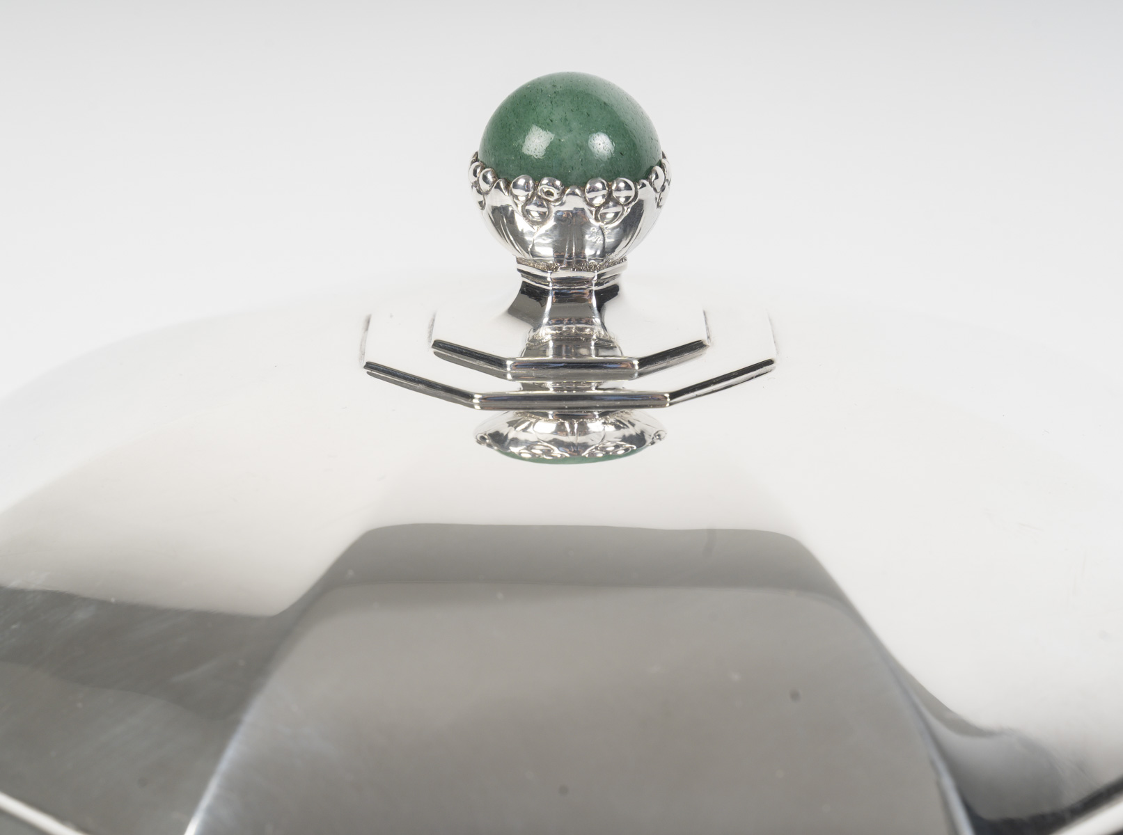 Légumier couvert en argent massif de forme ronde octogonale posé sur une base à gradins, le corps à pans coupés est flanqué de deux anses anneau en jade, le couvercle à doucine également à pans coupés est surmonté d’une prise représentée par une boule de jade sertie d’argent ;