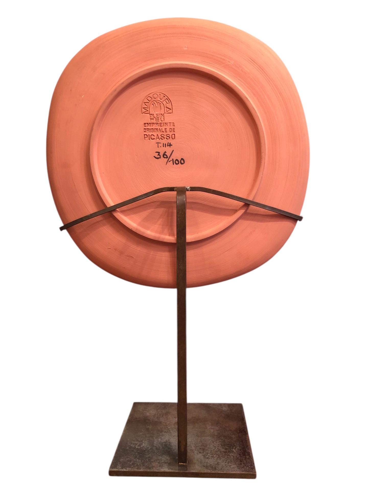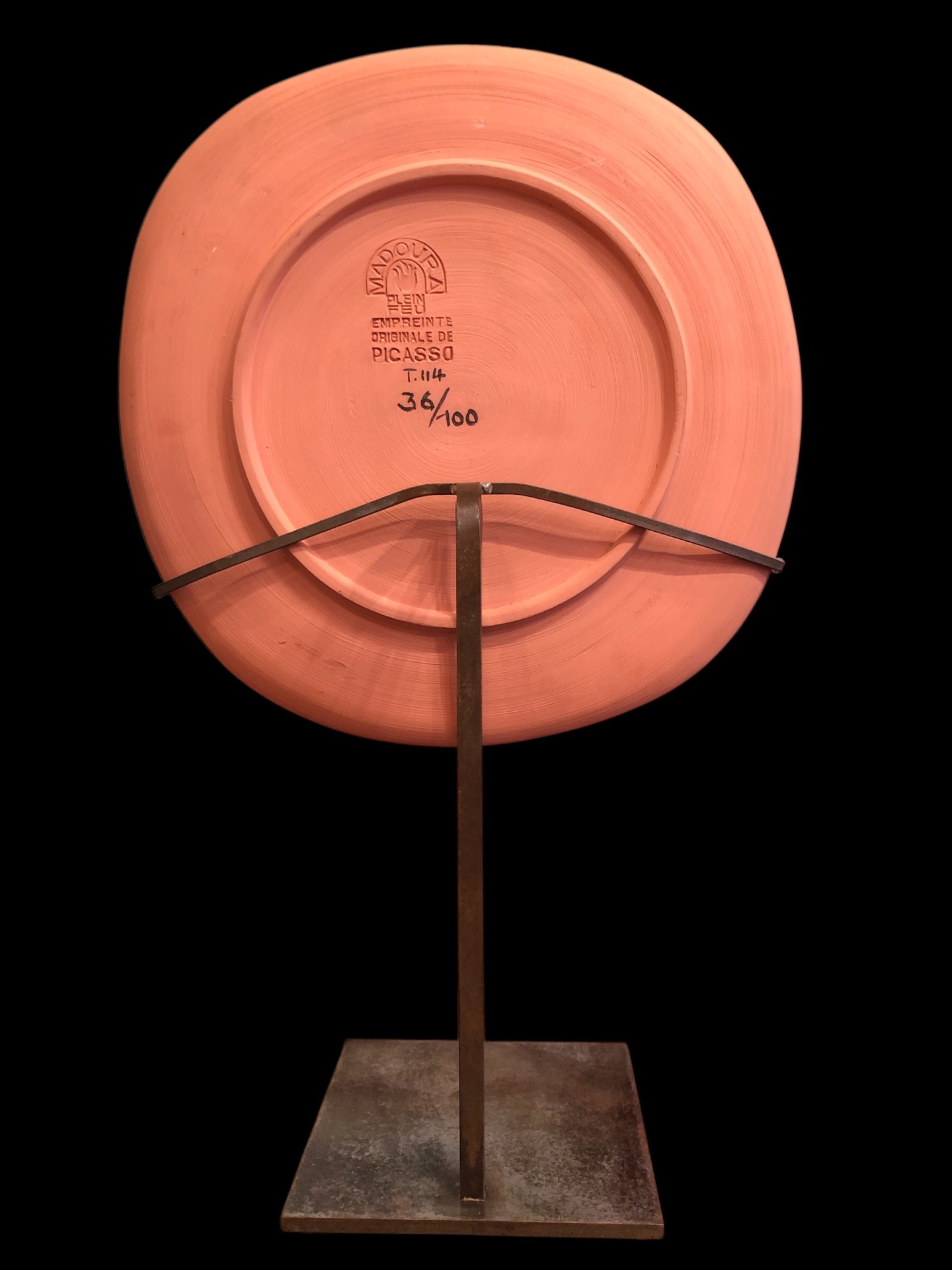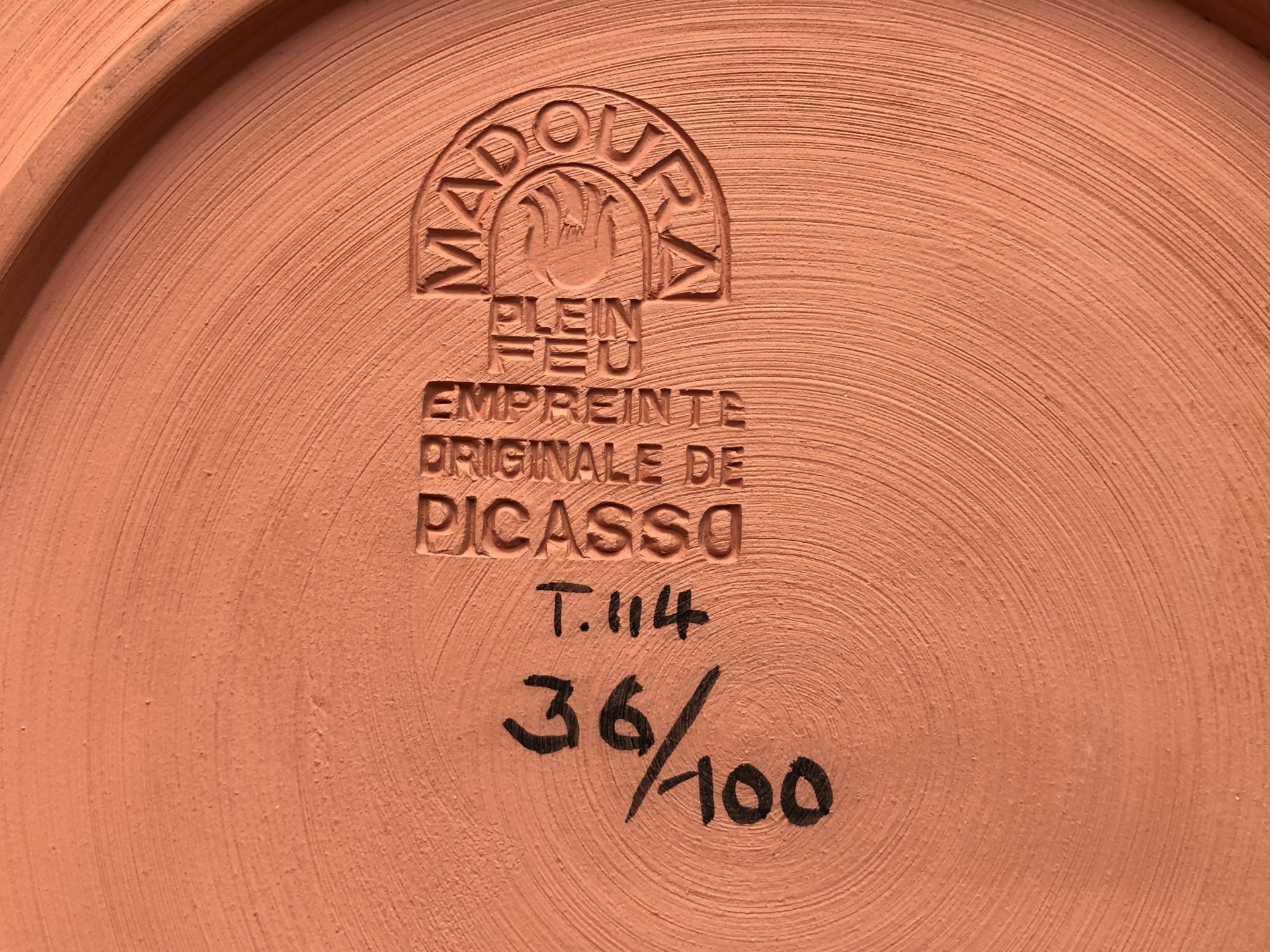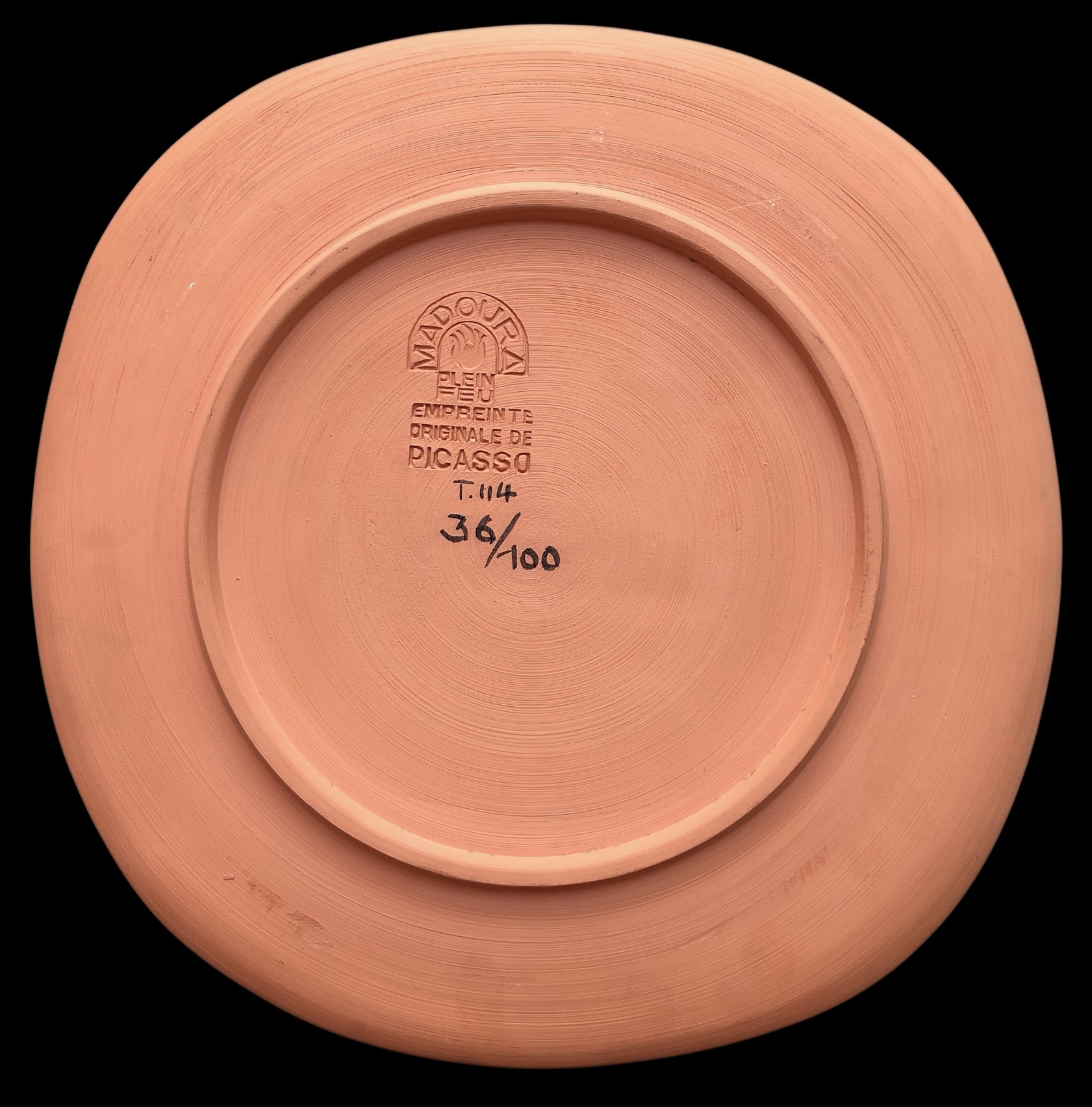 Cachets Madoura plein feu et empreinte originale de Picasso au revers, numéroté 36/100 et portant la marque d’atelier T.II4.