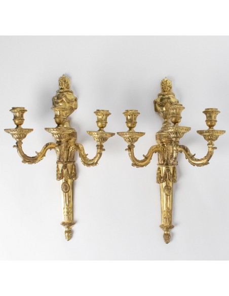 Paire d’appliques à trois bras de lumière en bronze doré à décor d’une urne à l’antique et de guirlandes de laurier.