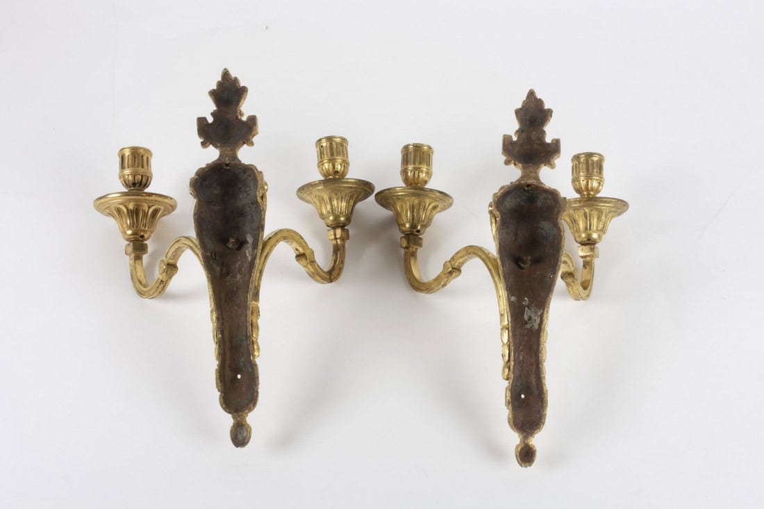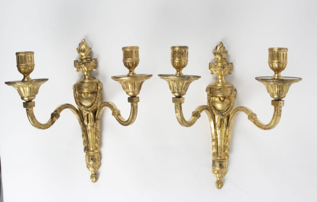 Paire d’appliques à deux bras de lumière d’époque Louis XVI en bronze ciselé et doré à décor de laurier et pot à feu.
