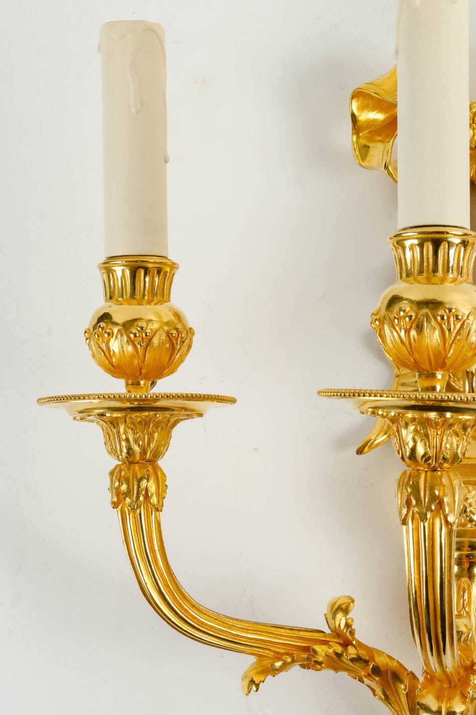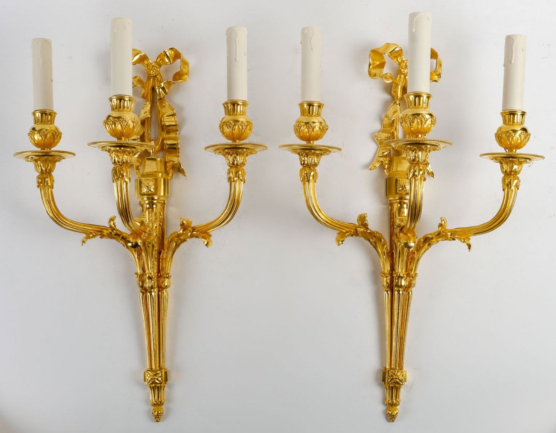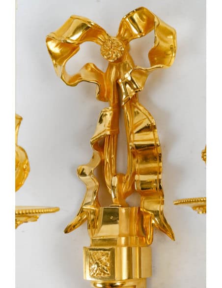 Paire de très belles et grandes appliques de style Louis XVI en bronze doré à trois bras de lumière à décor de feuillages, guirlandes et d’un noeud rubané. Remise en état. Redorées 24 carats.
