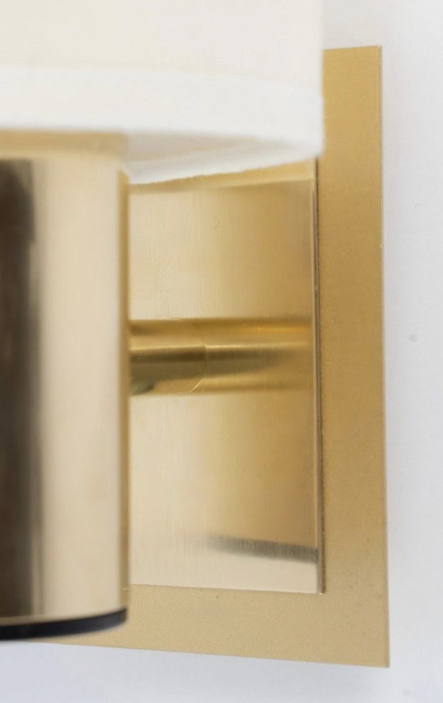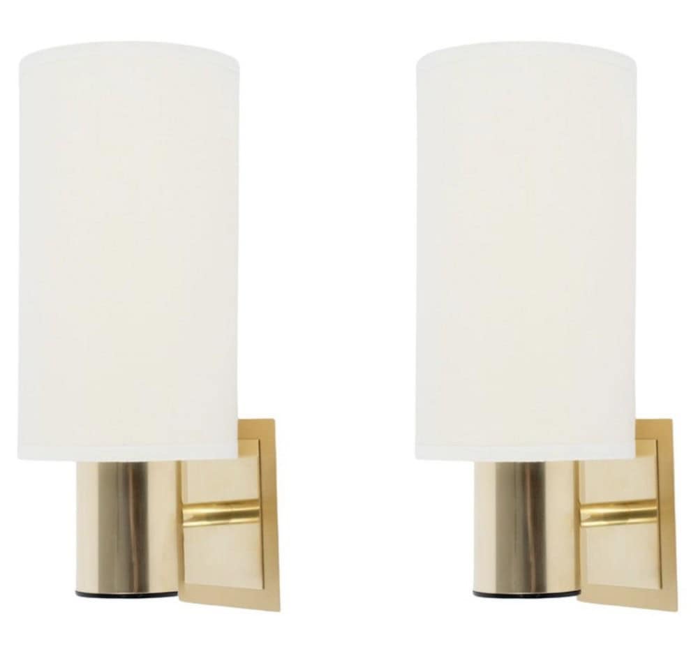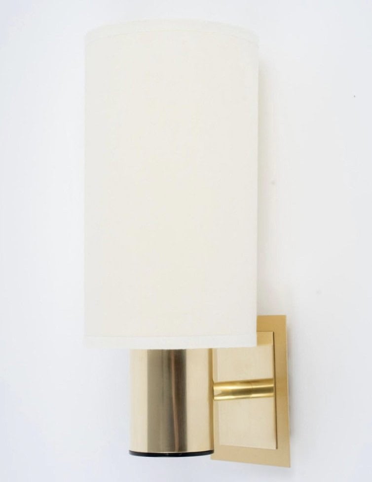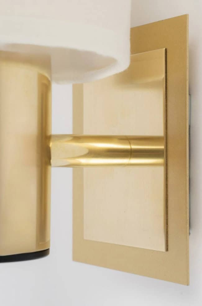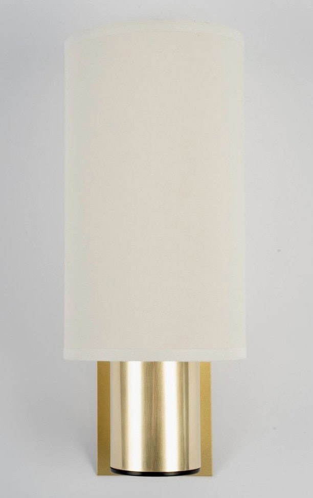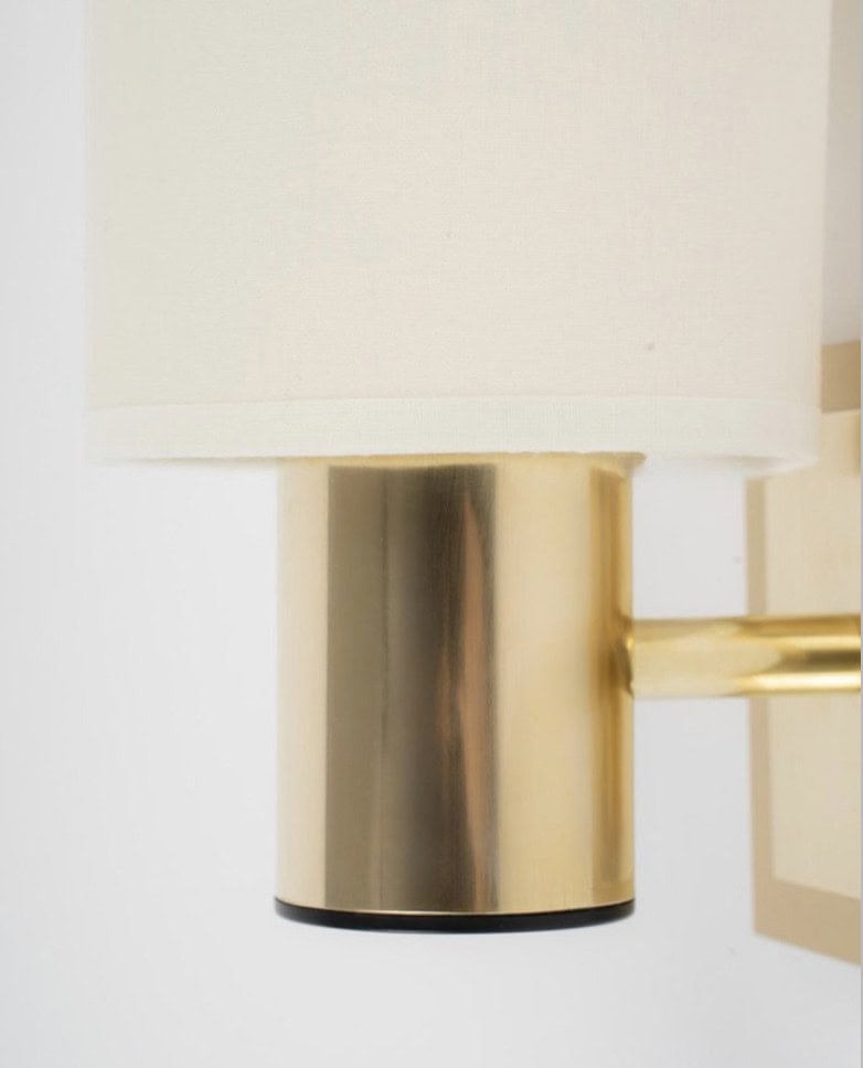 Au centre de l’applique murale, un petit bras soutient un cylindre en laiton doré, souligné dans sa partie inférieure par une base noire. Dans sa partie supérieure, l’applique murale est équipée d’un abat-jour cylindrique identique en coton blanc cassé.