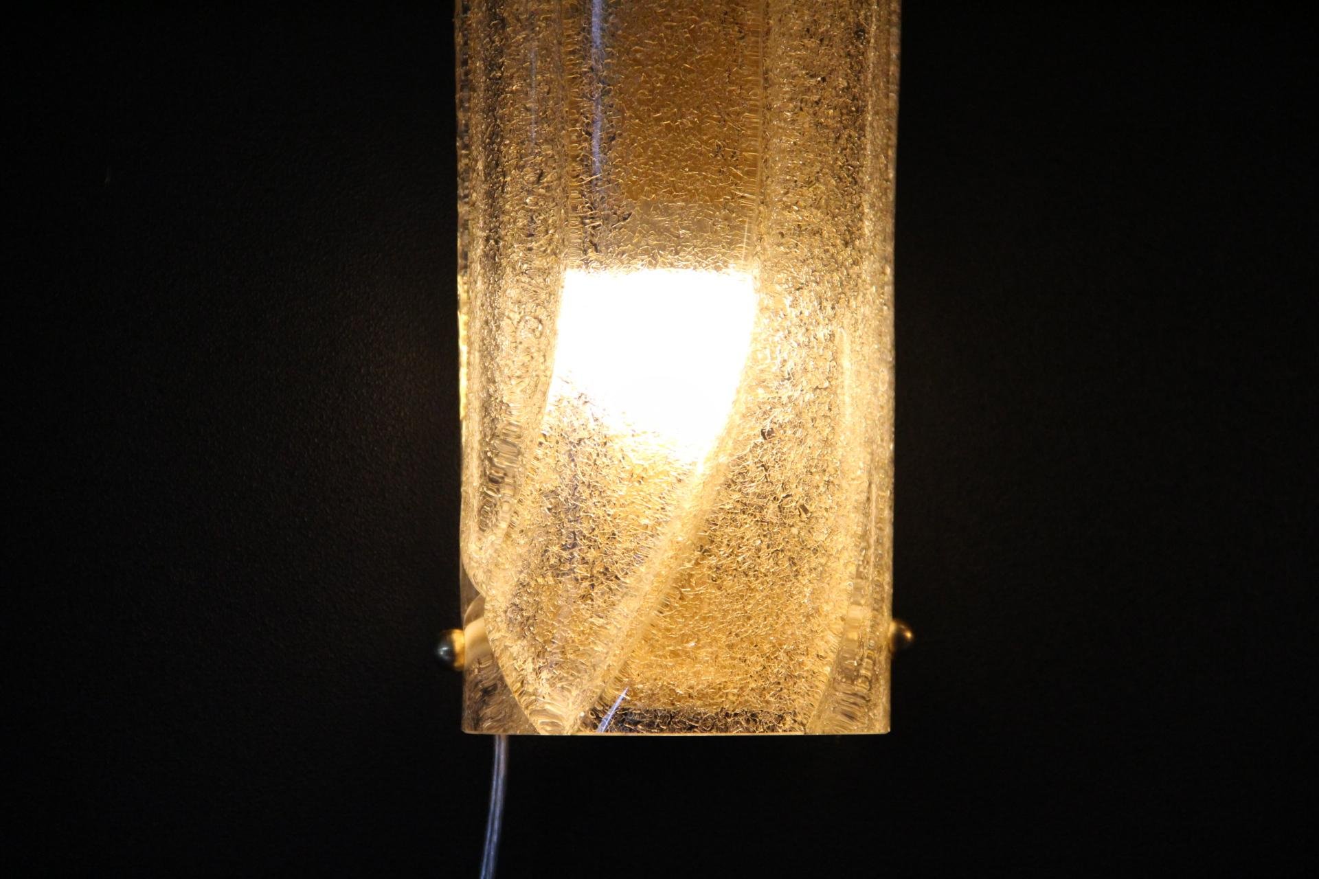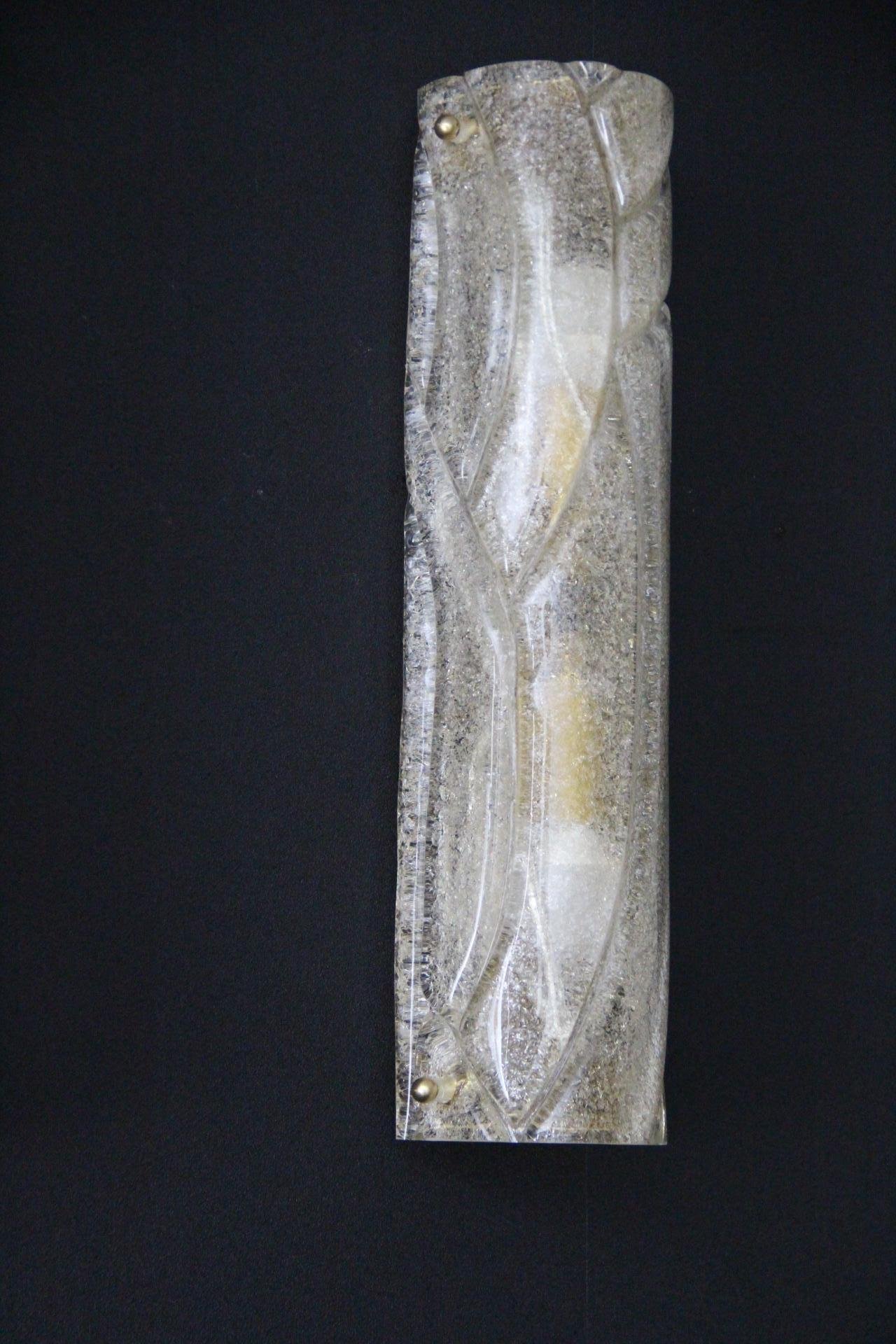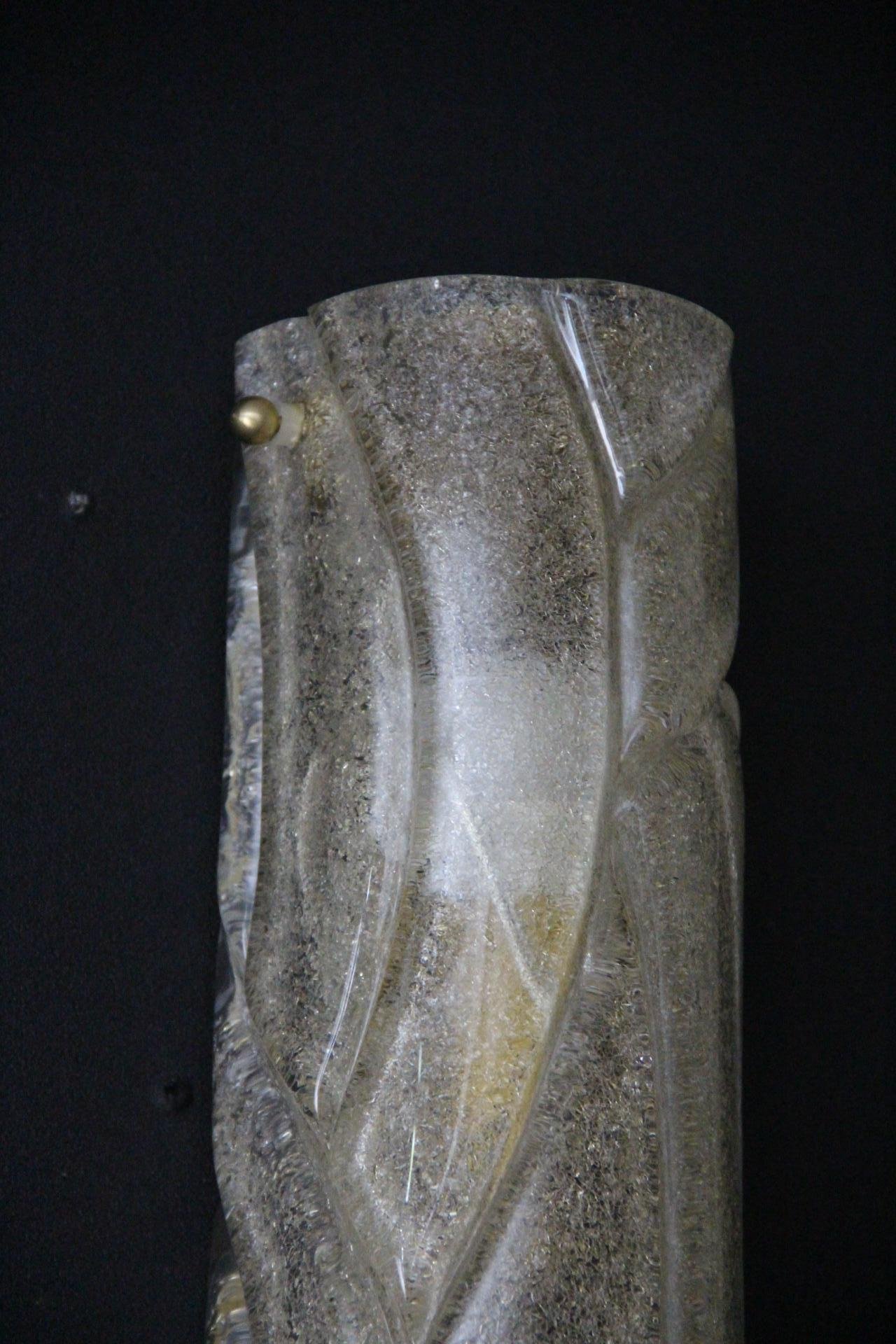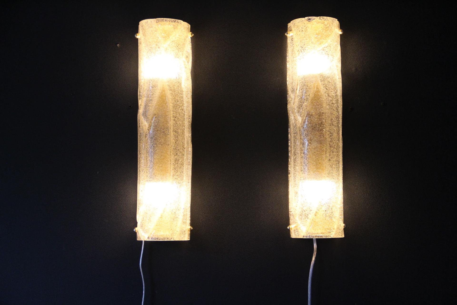 Cette très belle paire d’appliques a été conçue et réalisée individuellement à Murano . Le verre texturé se reflète contre la plaque de laiton à l’arrière pour offrir une lumière et une couleur très agréables. Ces appliques présentent une belle forme drapée avec de nombreux détails, comme tous ses flocons blancs capturés à l’intérieur du verre. Leur forme est simple et tellement élégante ! Elles sont typiquement de style Mazzega. Cette paire d’appliques donne une lumière chaleureuse et agréable et apporte une touche luxueuse à tous les styles d’intérieurs. Elles sont câblées pour les États-Unis et l’Europe et fonctionnent avec 110 ou 220 volts. 2 ampoules par lumière sont nécessaires. Le fil électrique que vous pouvez voir sur les photos est uniquement pour la démonstration afin de montrer qu’ils sont en état de marche….