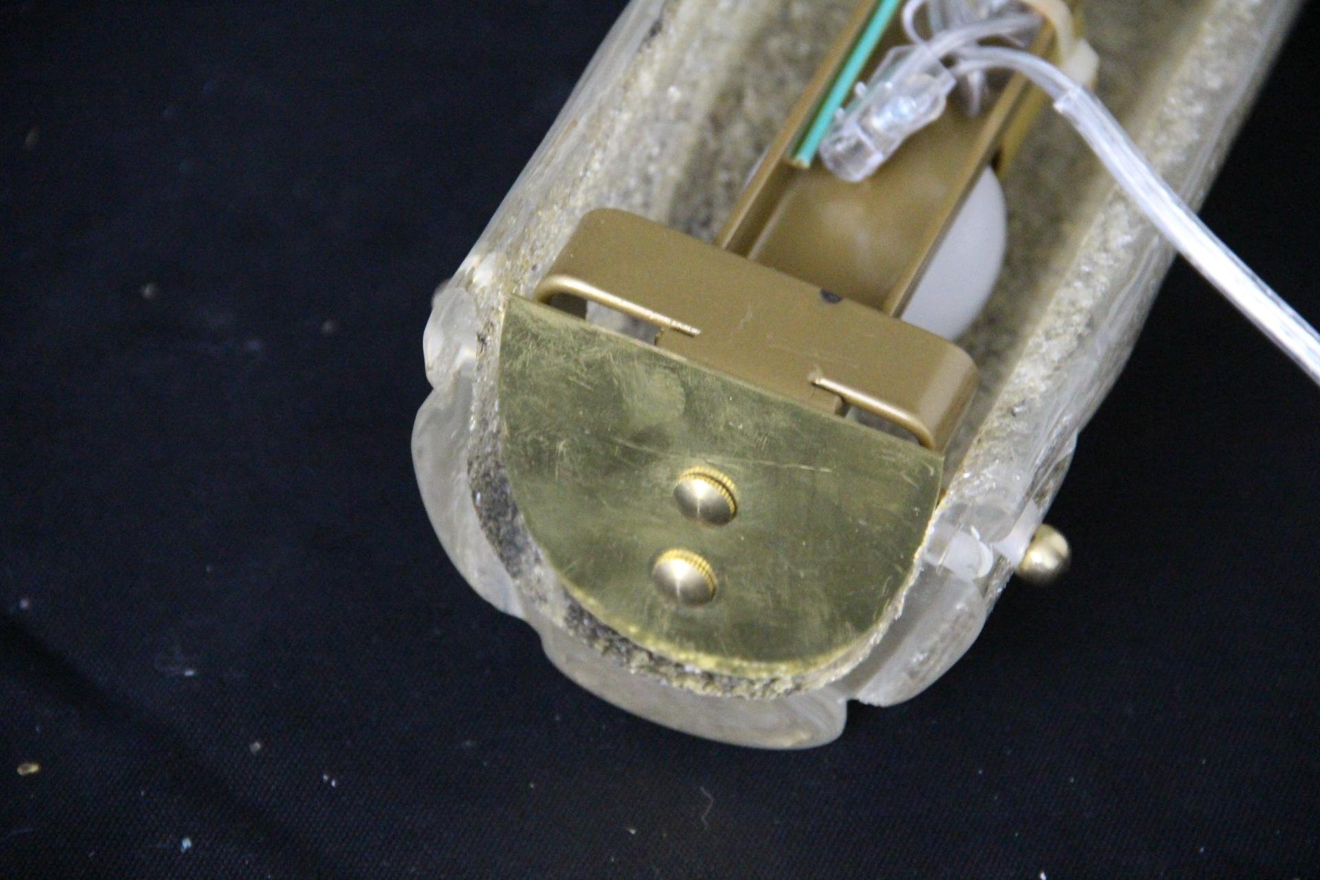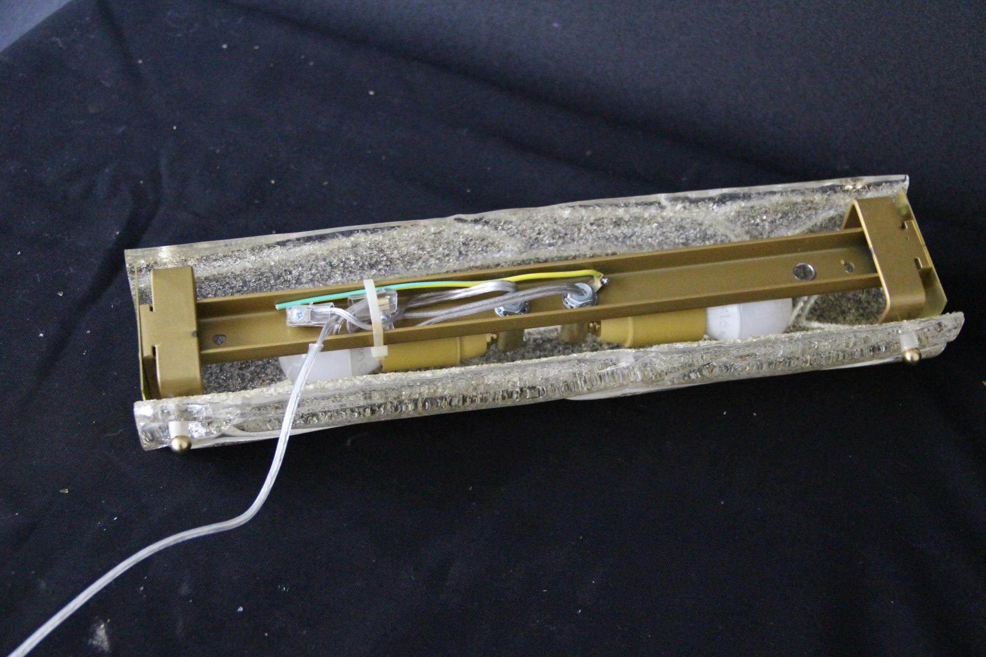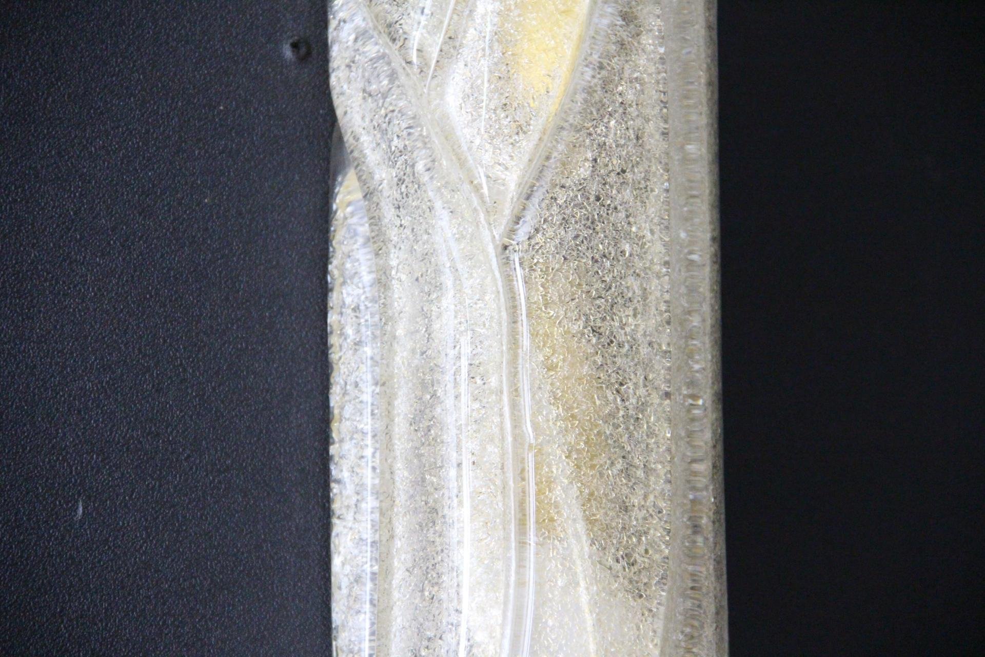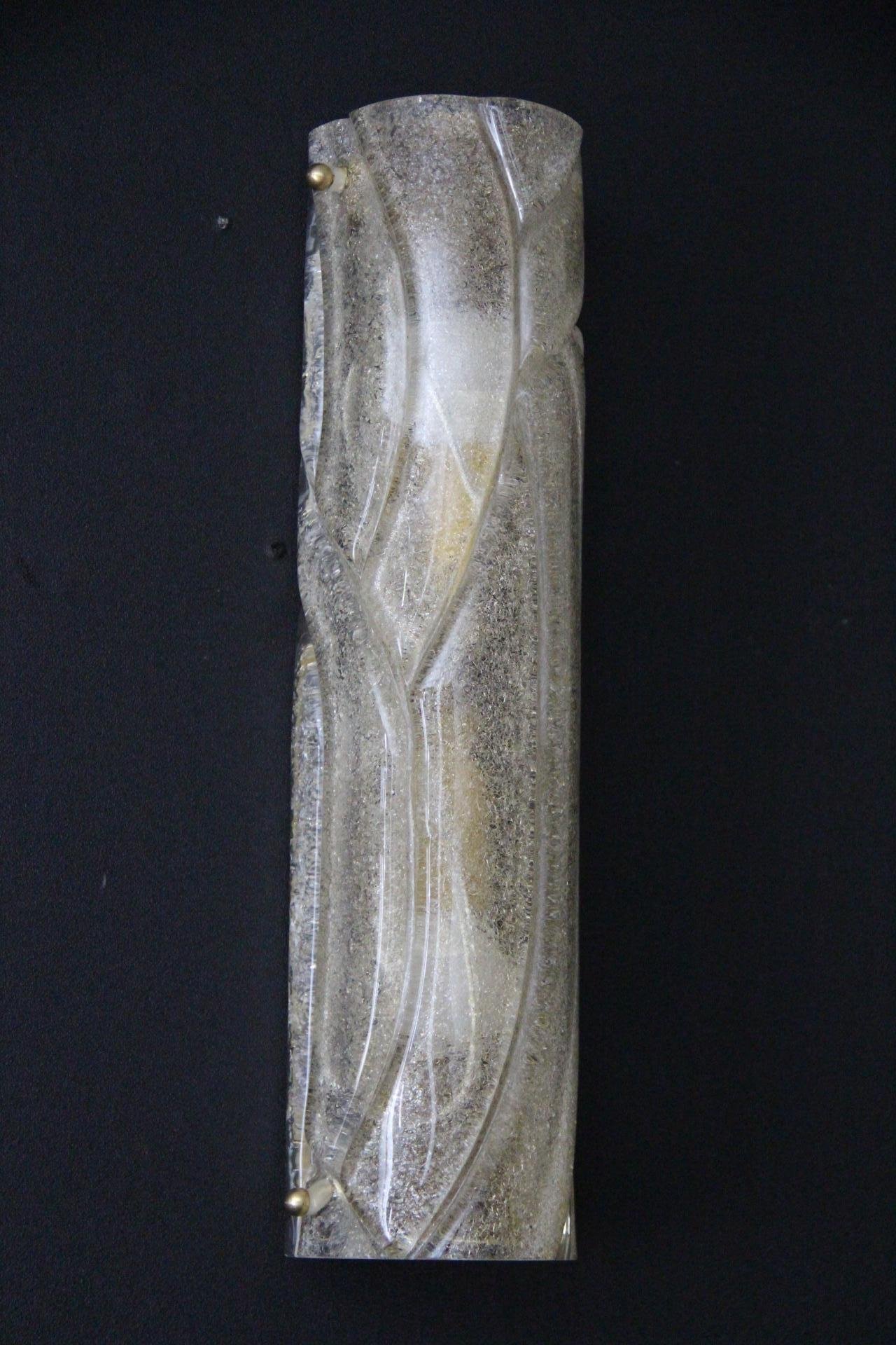 Cette très belle paire d’appliques a été conçue et réalisée individuellement à Murano . Le verre texturé se reflète contre la plaque de laiton à l’arrière pour offrir une lumière et une couleur très agréables. Ces appliques présentent une belle forme drapée avec de nombreux détails, comme tous ses flocons blancs capturés à l’intérieur du verre. Leur forme est simple et tellement élégante ! Elles sont typiquement de style Mazzega. Cette paire d’appliques donne une lumière chaleureuse et agréable et apporte une touche luxueuse à tous les styles d’intérieurs. Elles sont câblées pour les États-Unis et l’Europe et fonctionnent avec 110 ou 220 volts. 2 ampoules par lumière sont nécessaires. Le fil électrique que vous pouvez voir sur les photos est uniquement pour la démonstration afin de montrer qu’ils sont en état de marche….