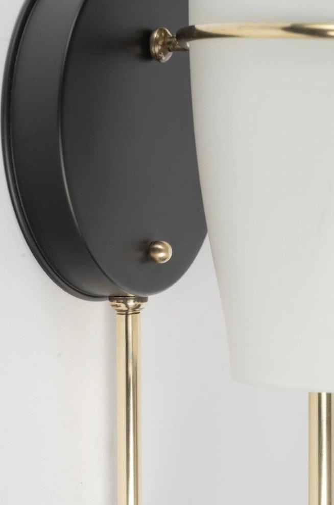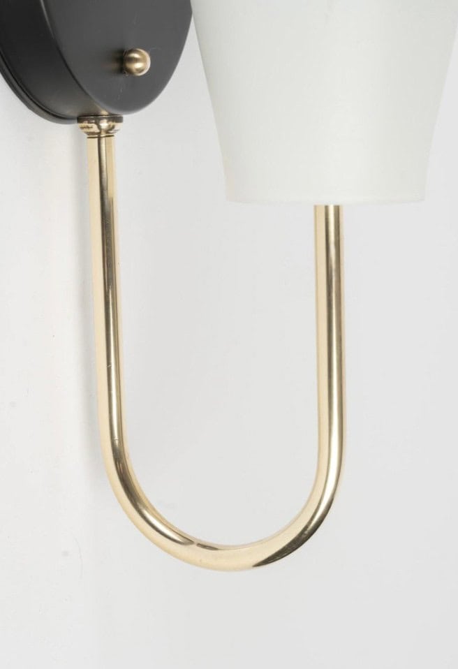 Une tige en laiton doré incurvée s’étend depuis la base inférieure du support mural de forme ronde de couleur noire.