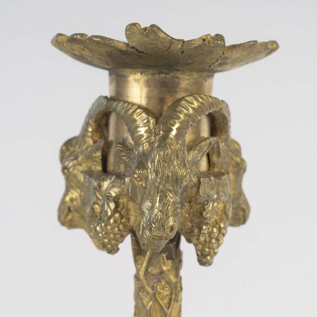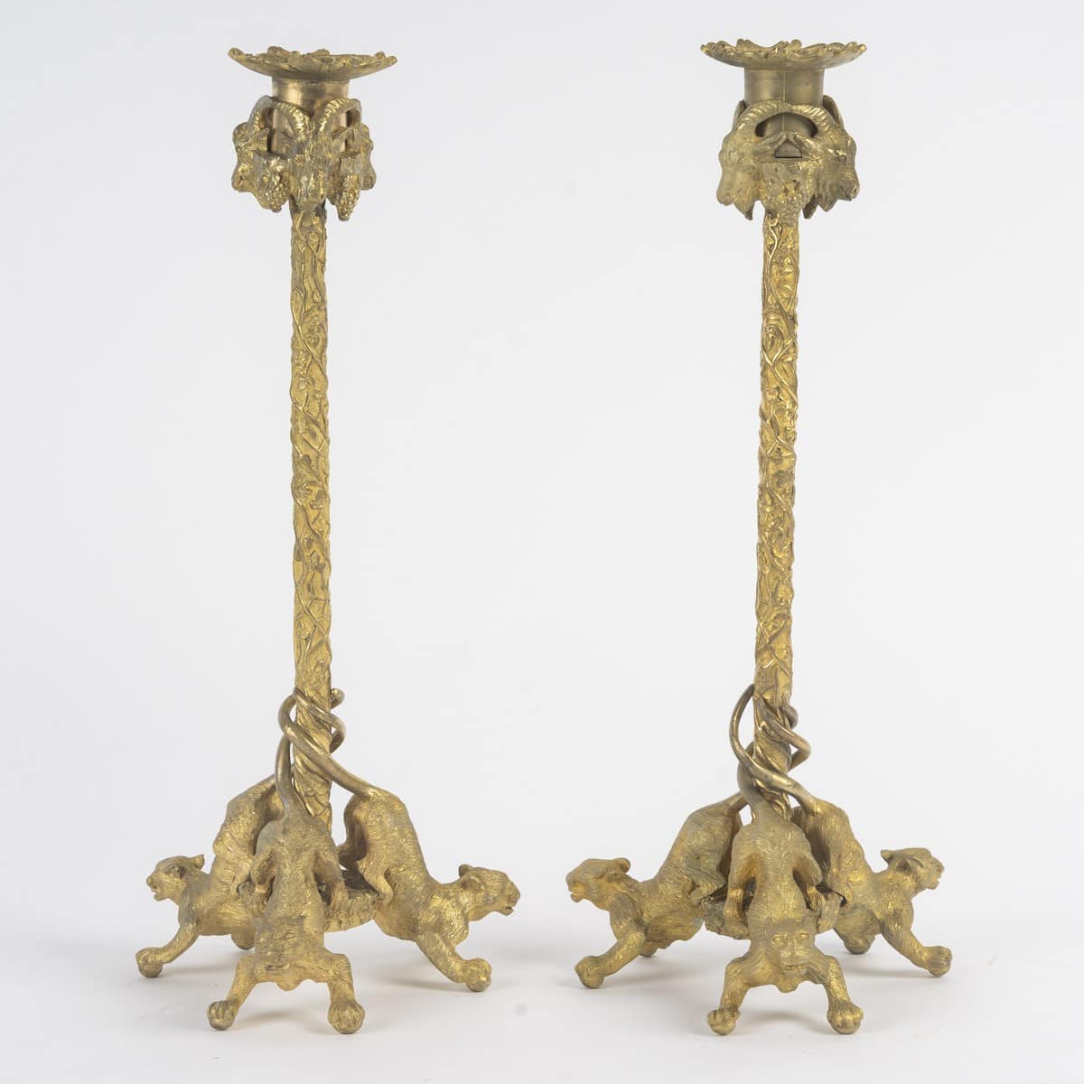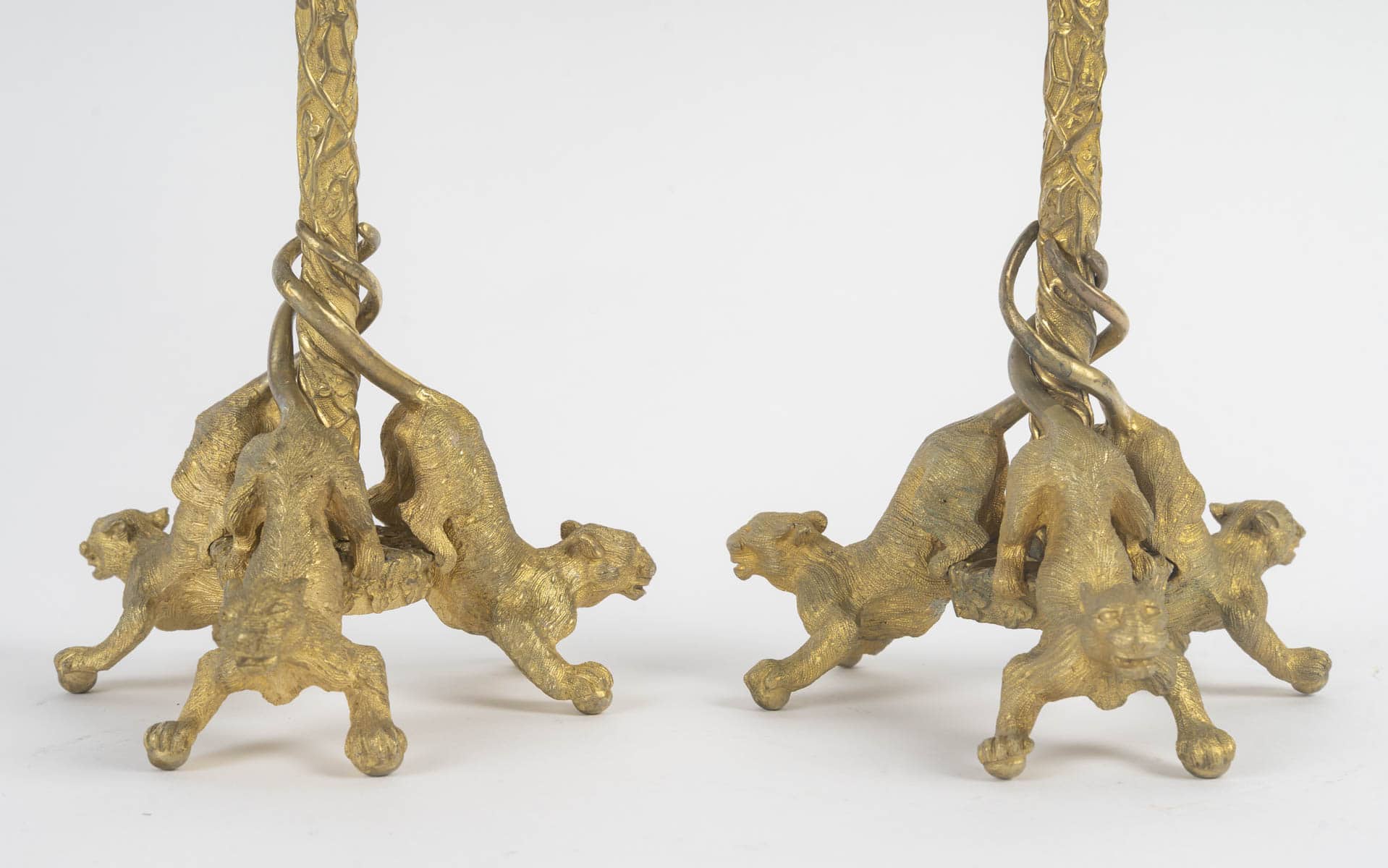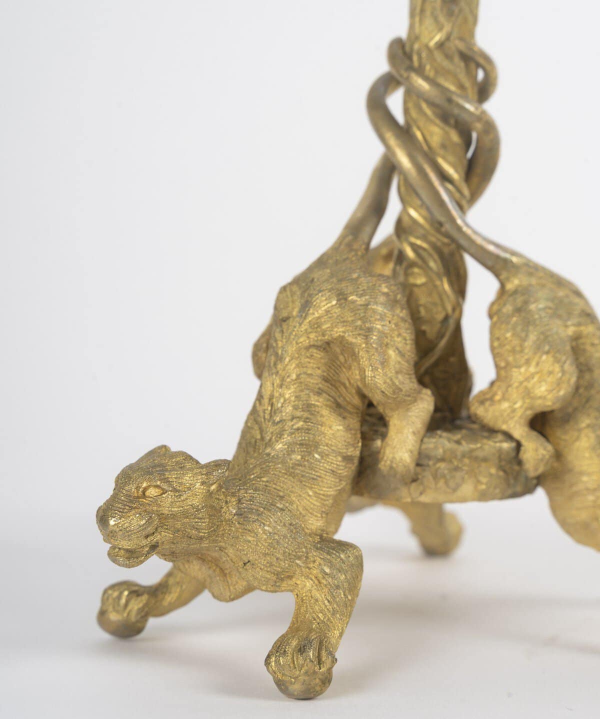 Trois chats sauvages entièrement sculptés servent de support à la tige élancée, entourée de feuilles de vigne en relief.