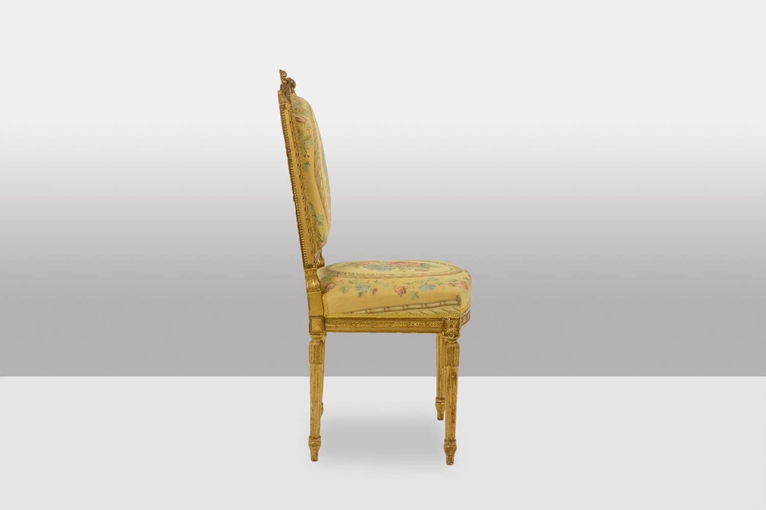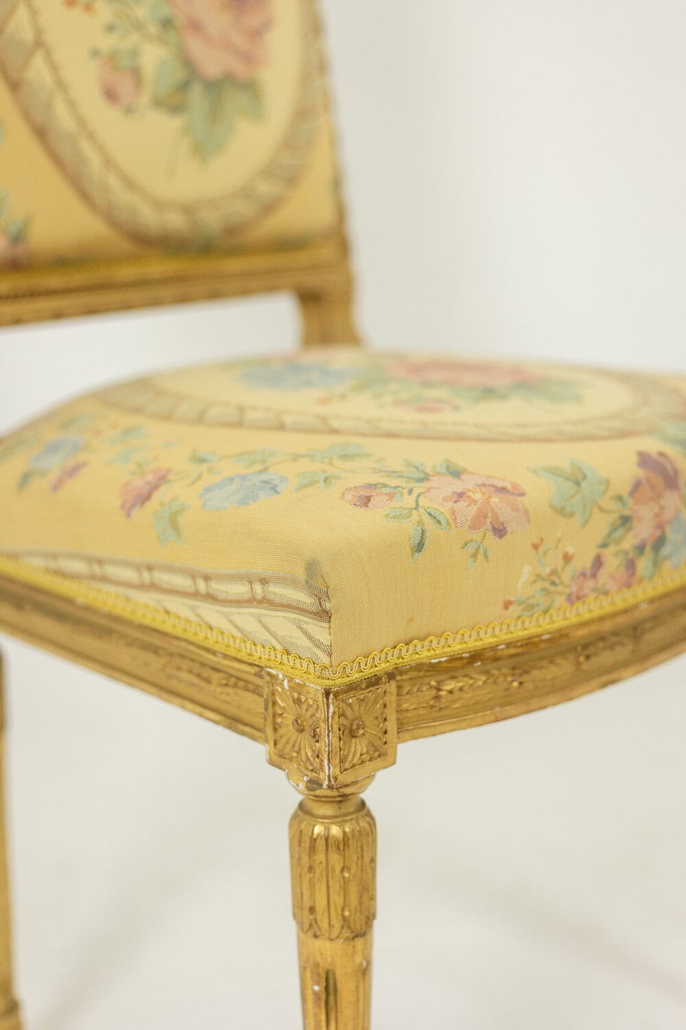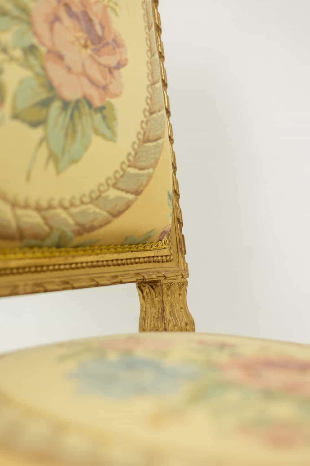 Paire de chaises d’époque Louis XVI, en bois doré et sculpté, tapisserie à décor de fleurs et de bouquet dans un médaillon.