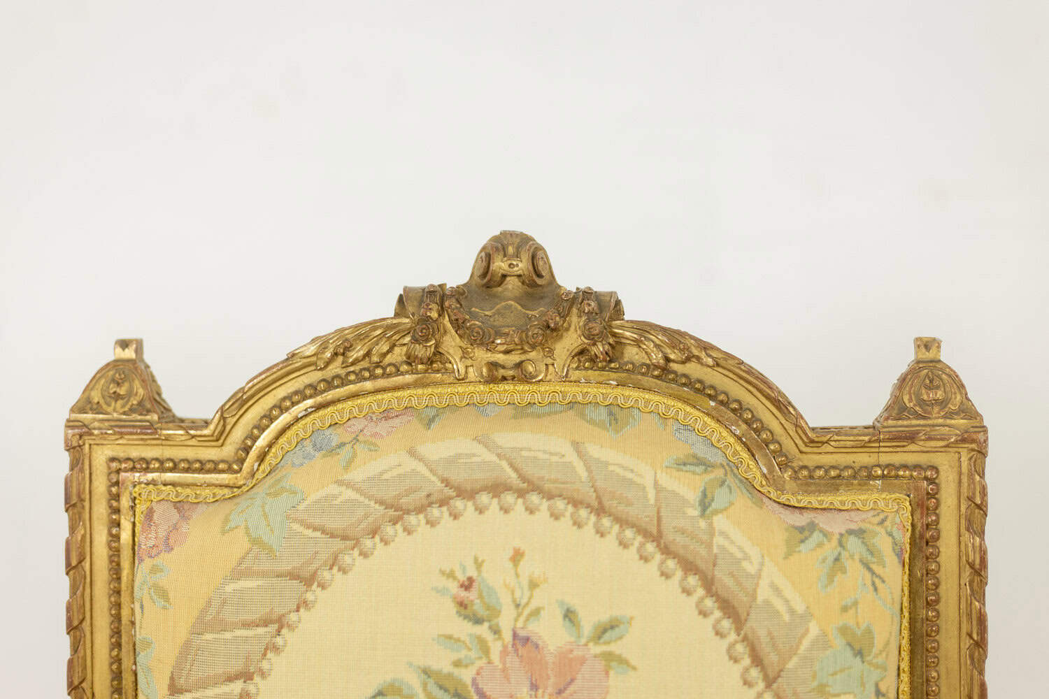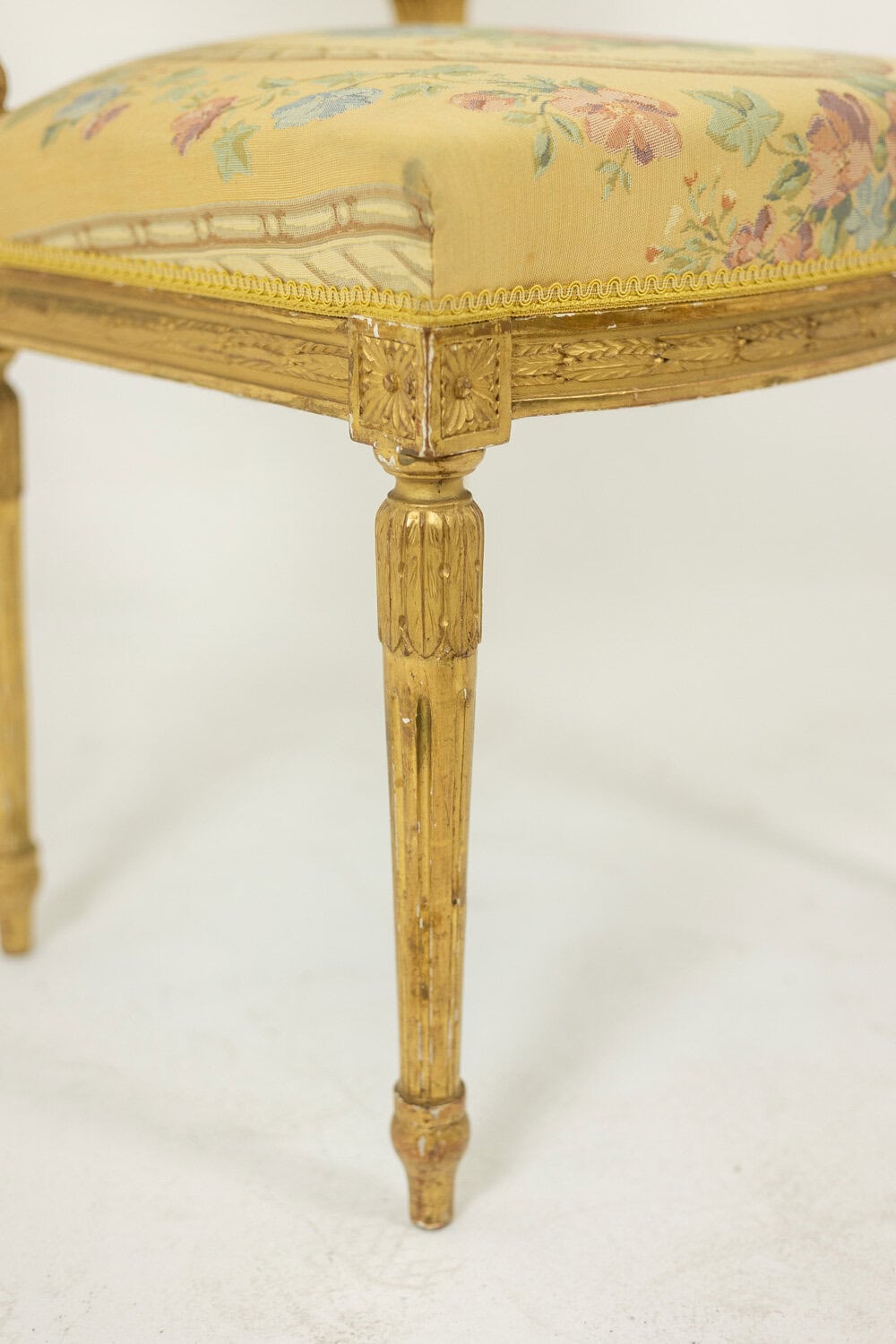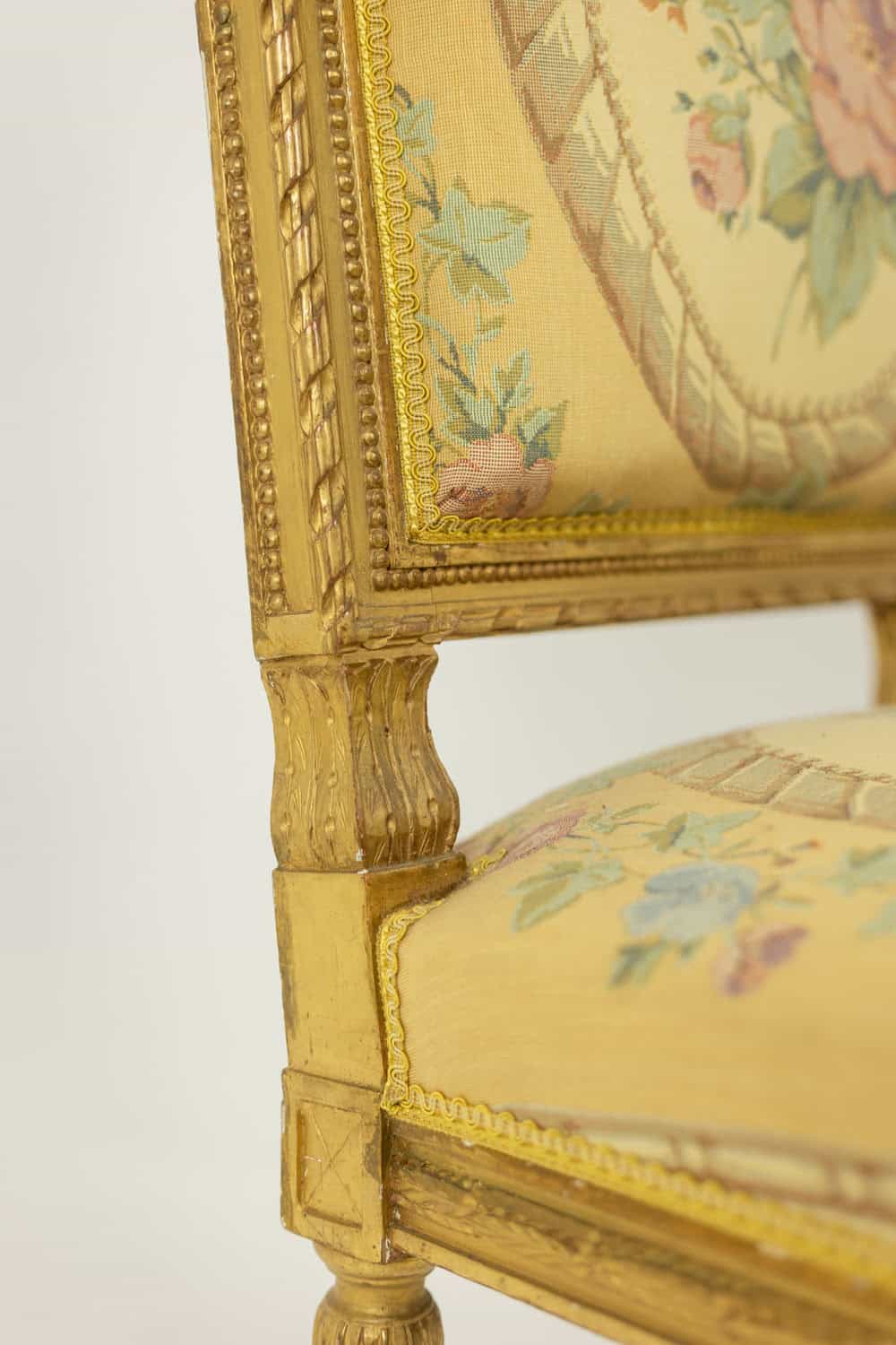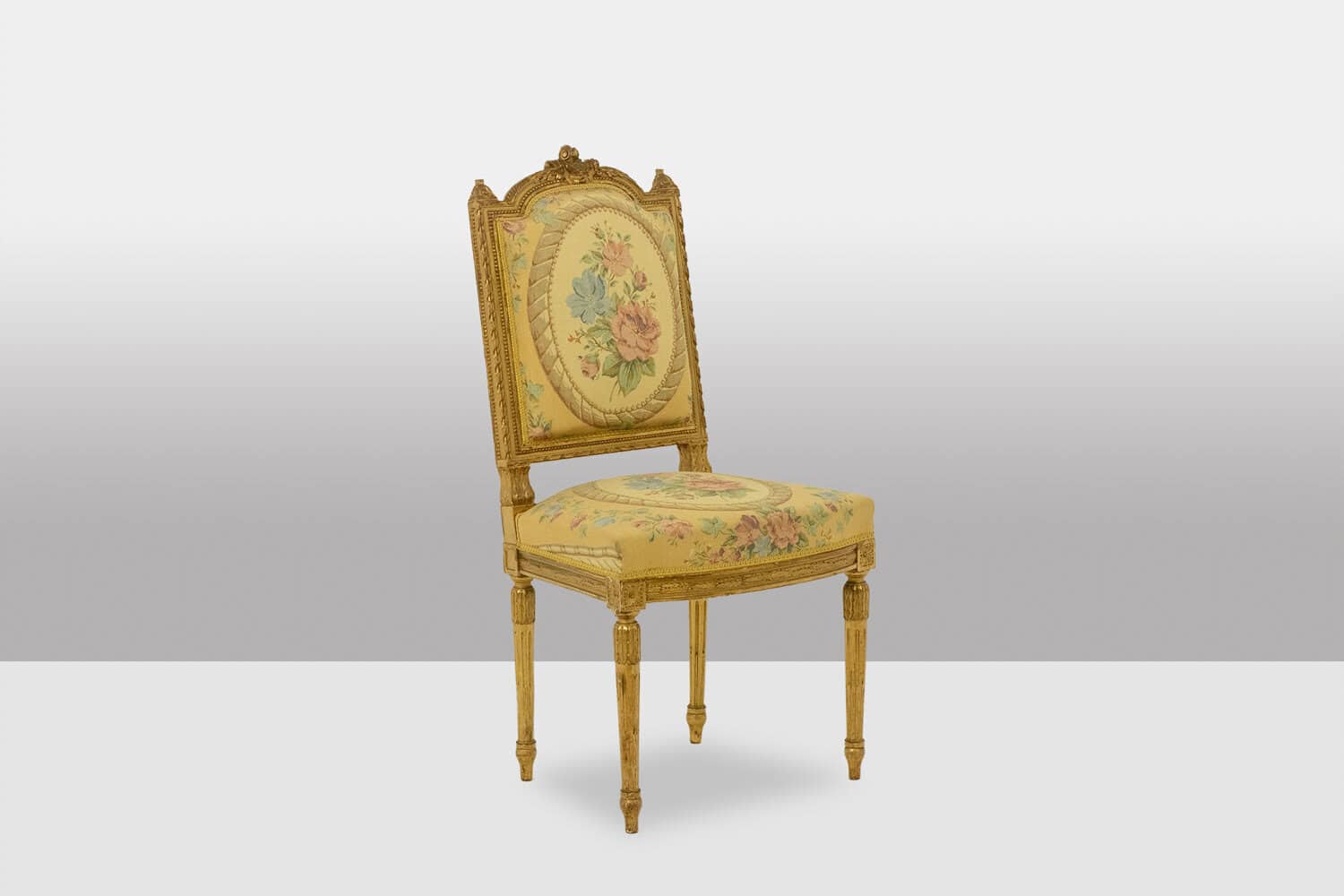 Paire de chaises d’époque Louis XVI, en bois doré et sculpté, tapisserie à décor de fleurs et de bouquet dans un médaillon.