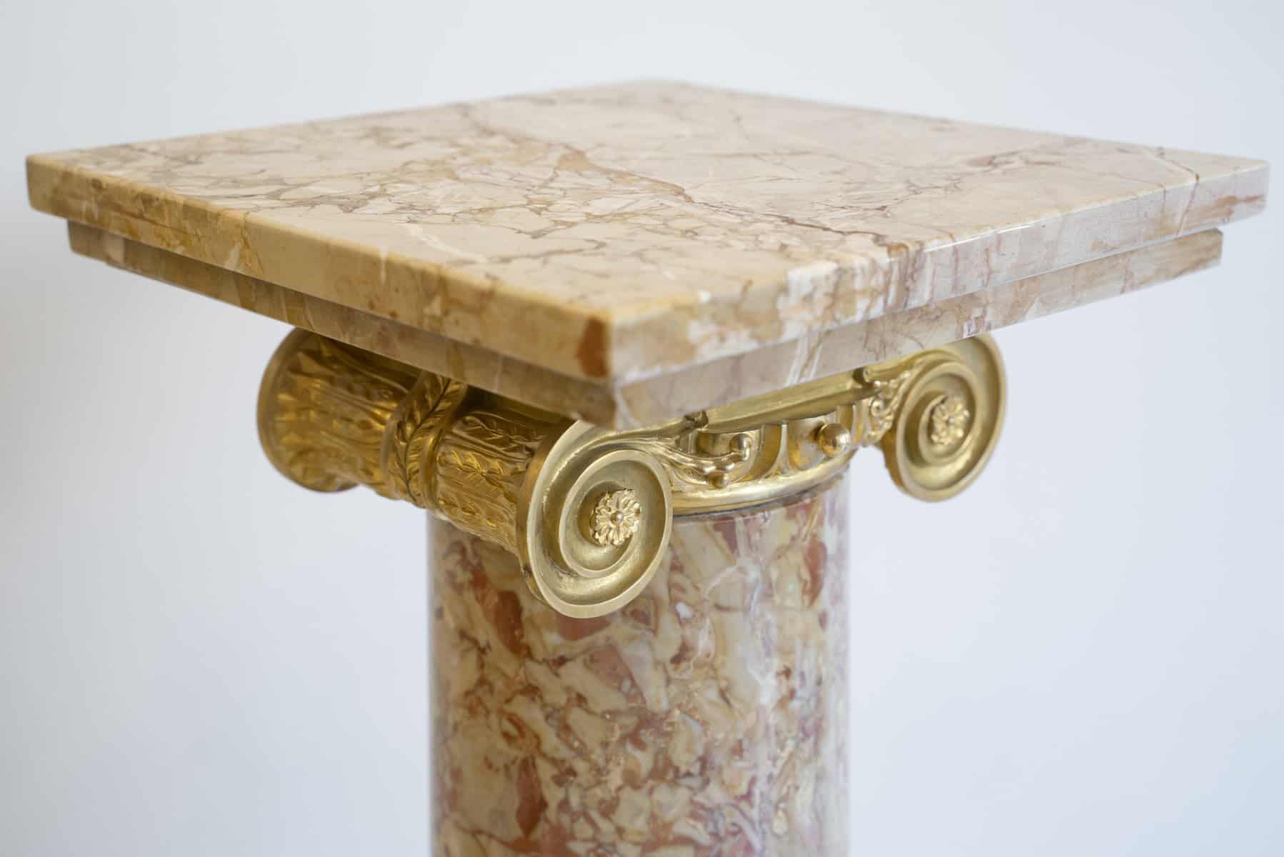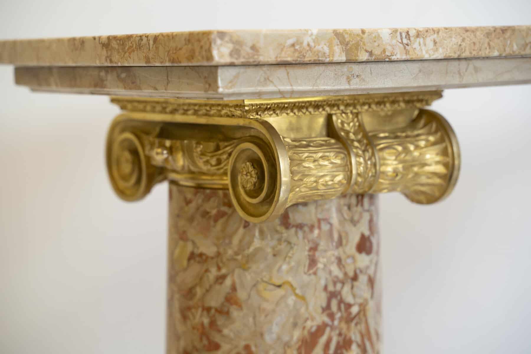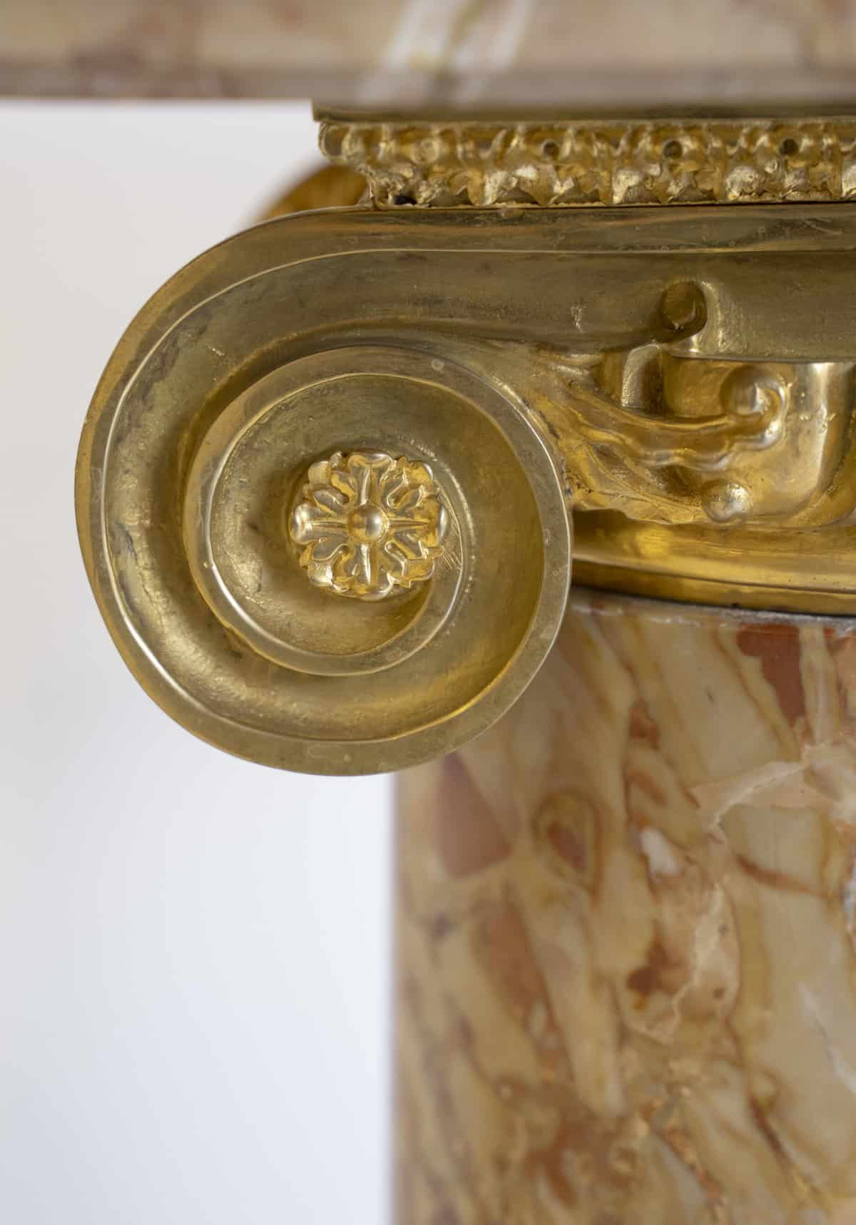 Chaque fût cylindrique, soigneusement poli, est surmonté d’un chapiteau ionique orné de volutes et d’une frise d’oves en bronze finement ciselé et doré.