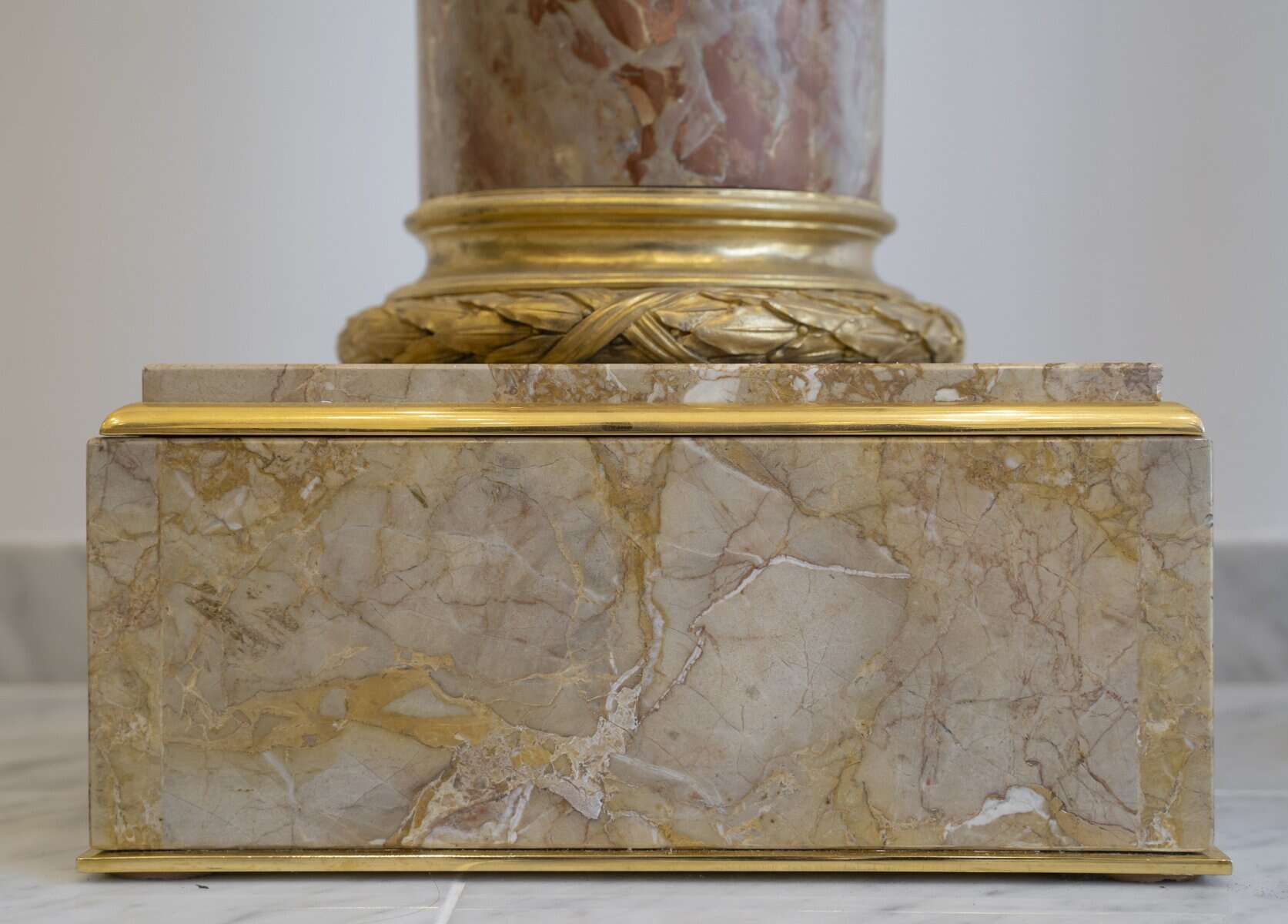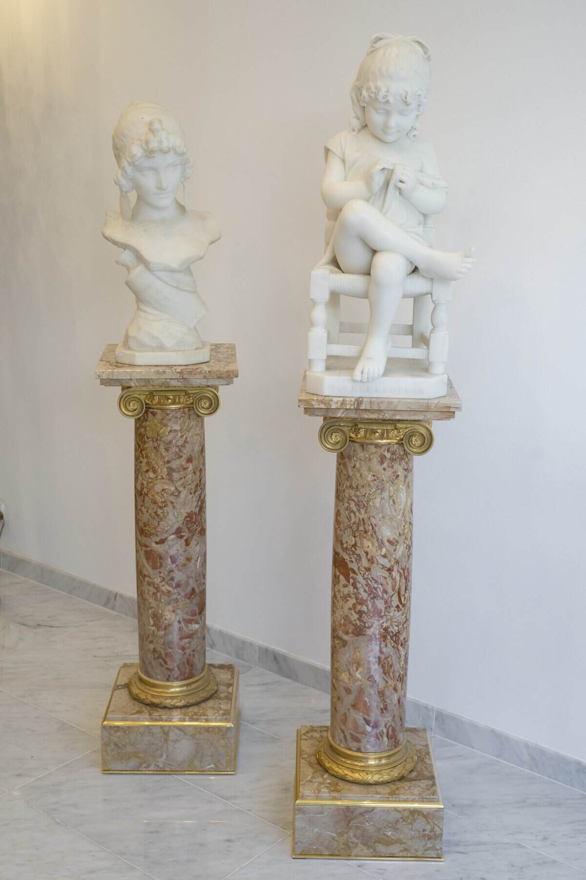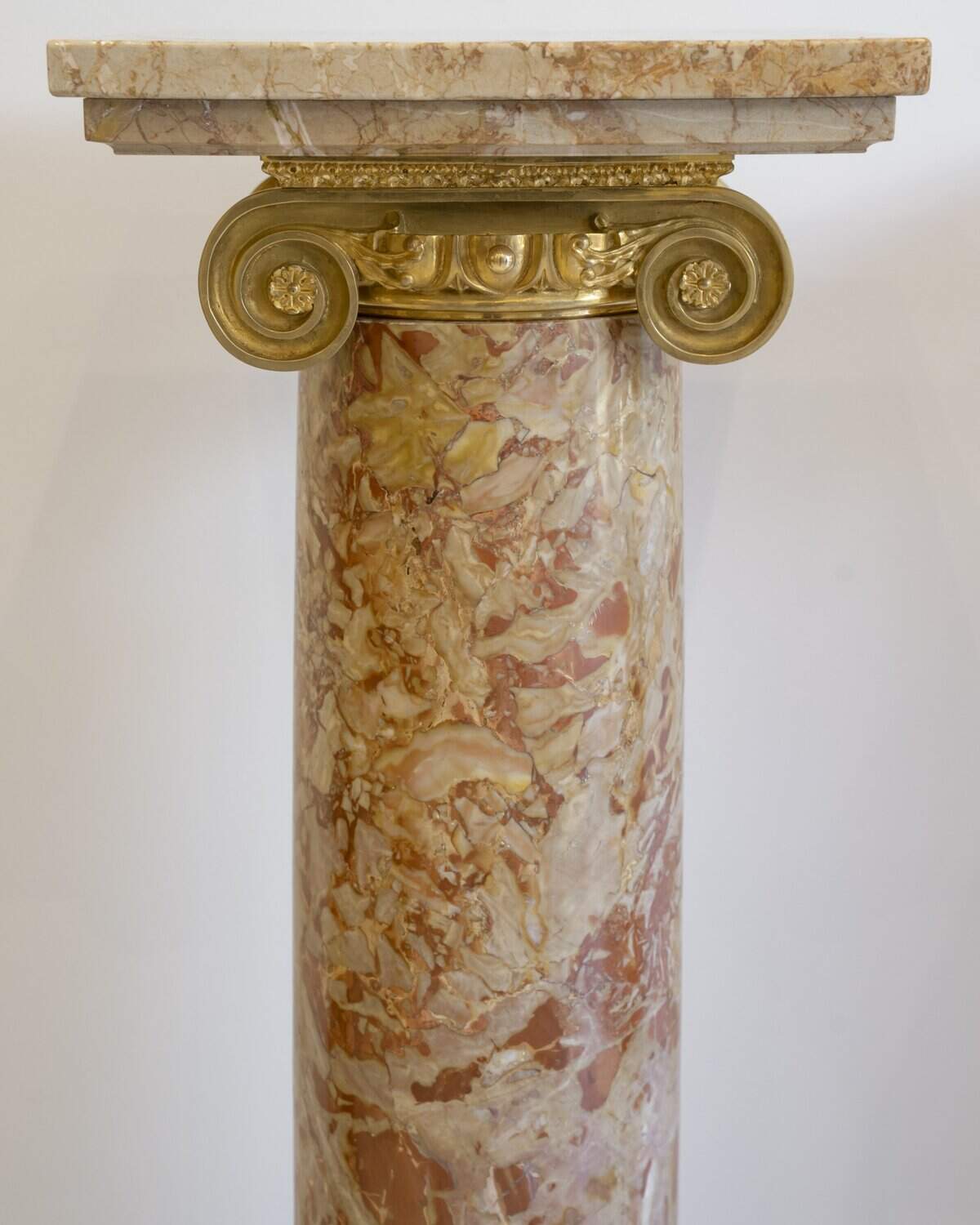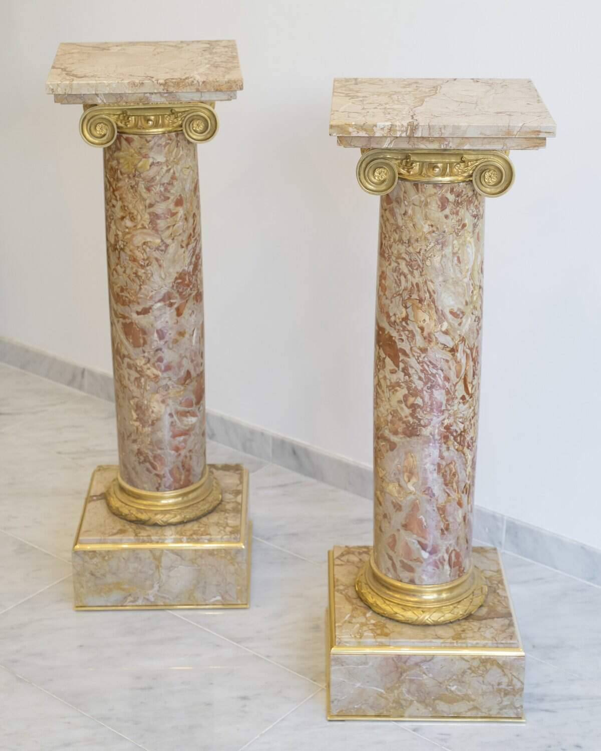Chaque fût cylindrique, soigneusement poli, est surmonté d’un chapiteau ionique orné de volutes et d’une frise d’oves en bronze finement ciselé et doré.