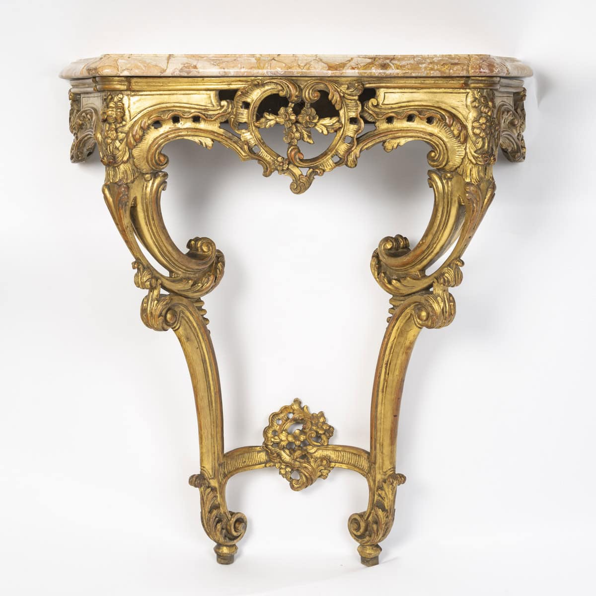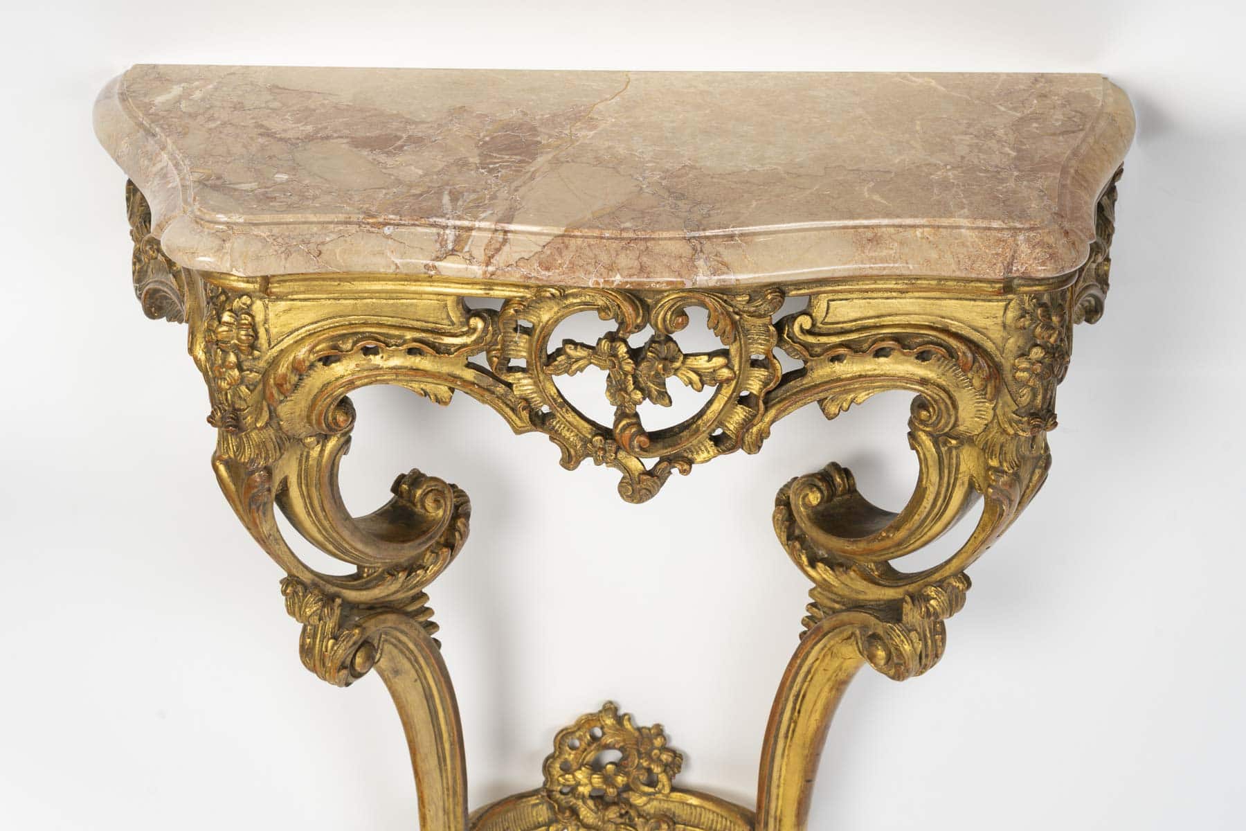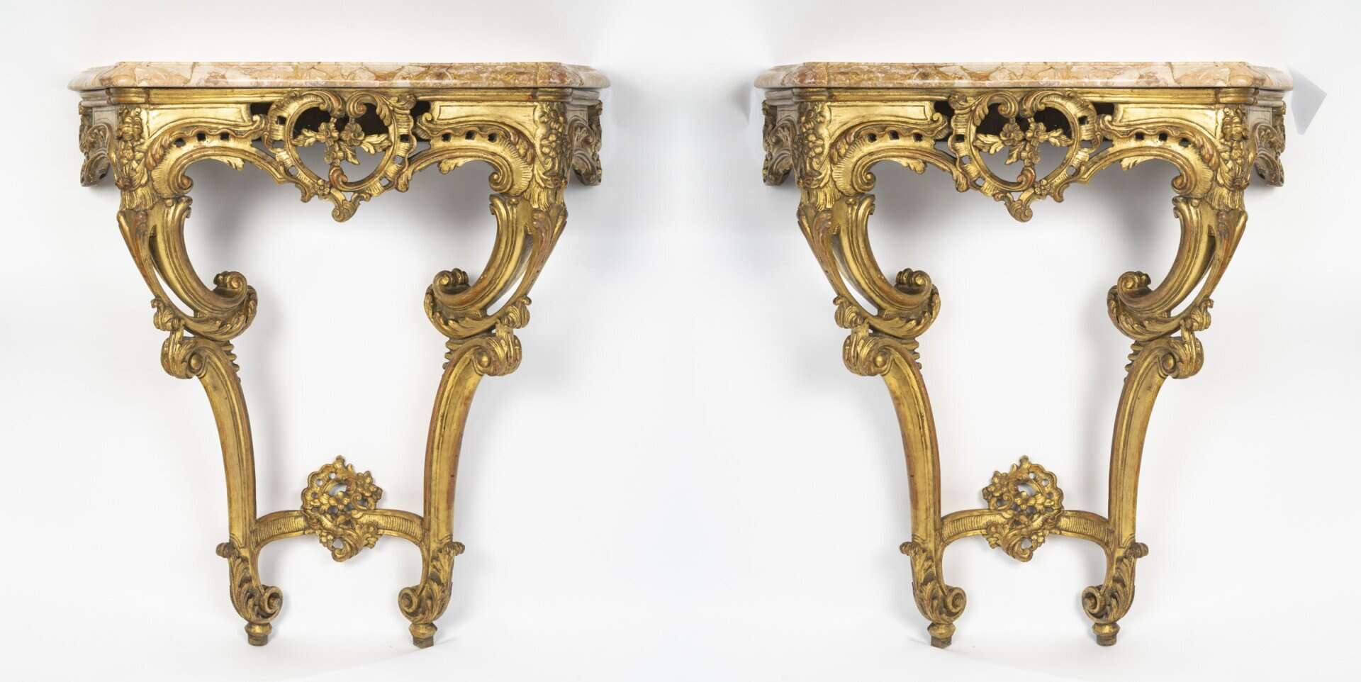 Paire de consoles en bois doré de style Louis XV (1724-1774), d’époque Napolon III, XIXème siècle.