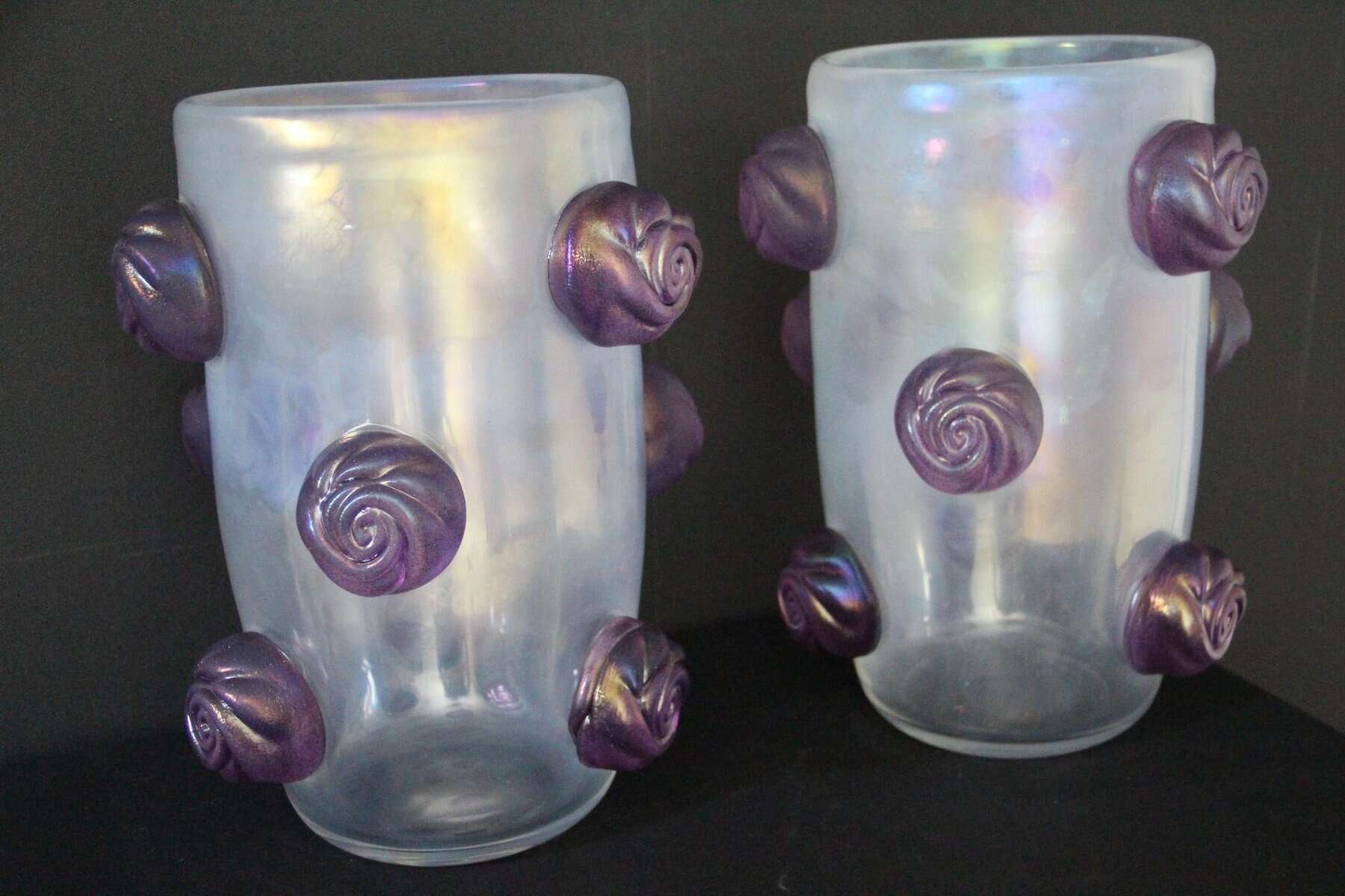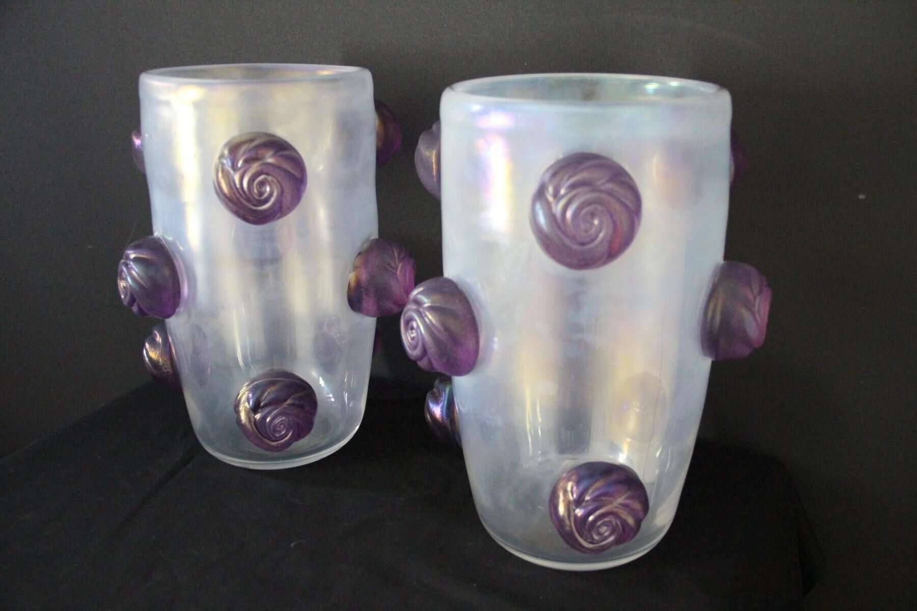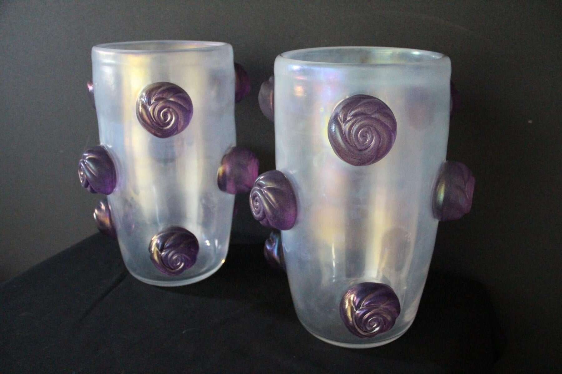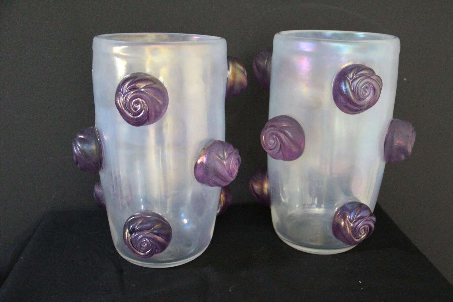 Cette paire de vases spectaculaires a une couleur nacrée irisée très inhabituelle qui passe du gris profond à l’argent clair en fonction des couleurs environnantes et de la lumière. Cet effet spécial est dû aux inclusions de poussière d’argent dans le verre. De plus, ils ont été entièrement réalisés à la main à Venise, y compris chaque rose en verre violet pour un effet très vivant… Chaque vase pèse environ 15 kg. Ces vases sont bien plus beaux en vrai que sur les photos… Ils s’adaptent à tous les styles d’intérieurs, qu’il s’agisse de l’art déco, du classique, du milieu du siècle, du moderne ou du contemporain. Tous deux sont signés à la main Cenedese Murano. Comme ils sont assez grands, ils sont parfaits comme objets décoratifs architecturaux ou comme veritables oeuvres d’art.