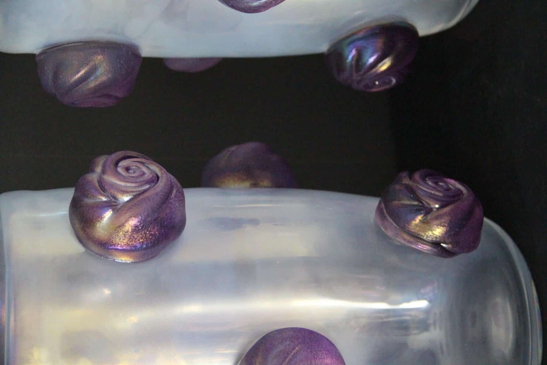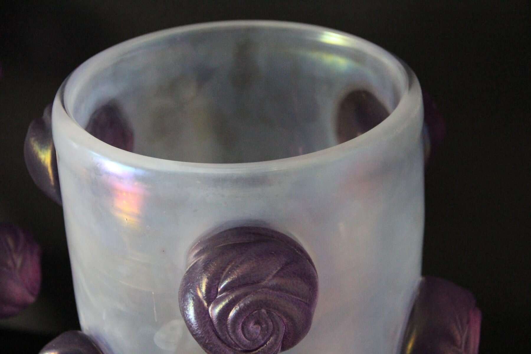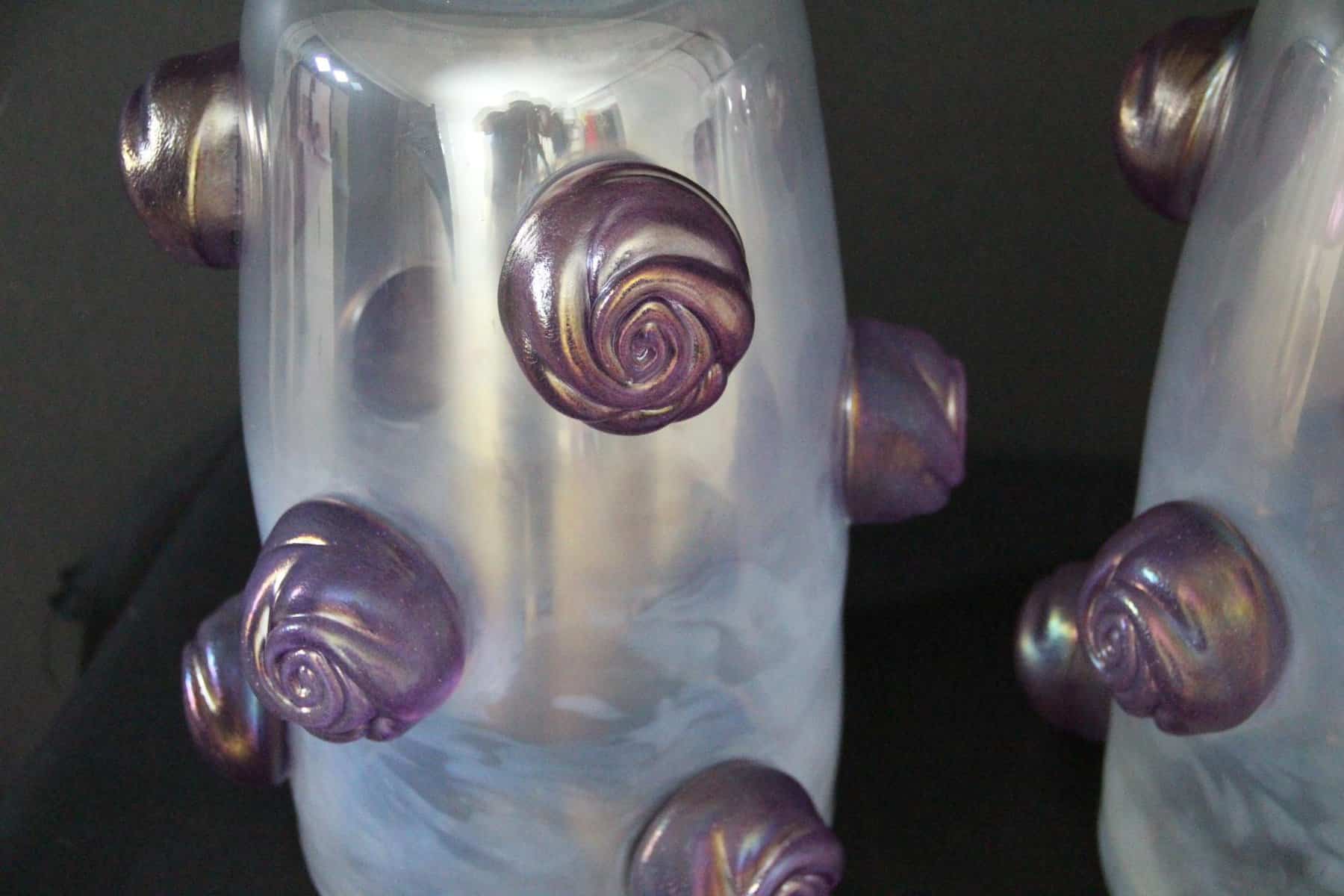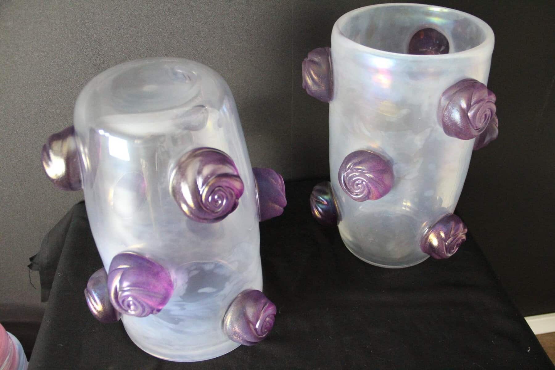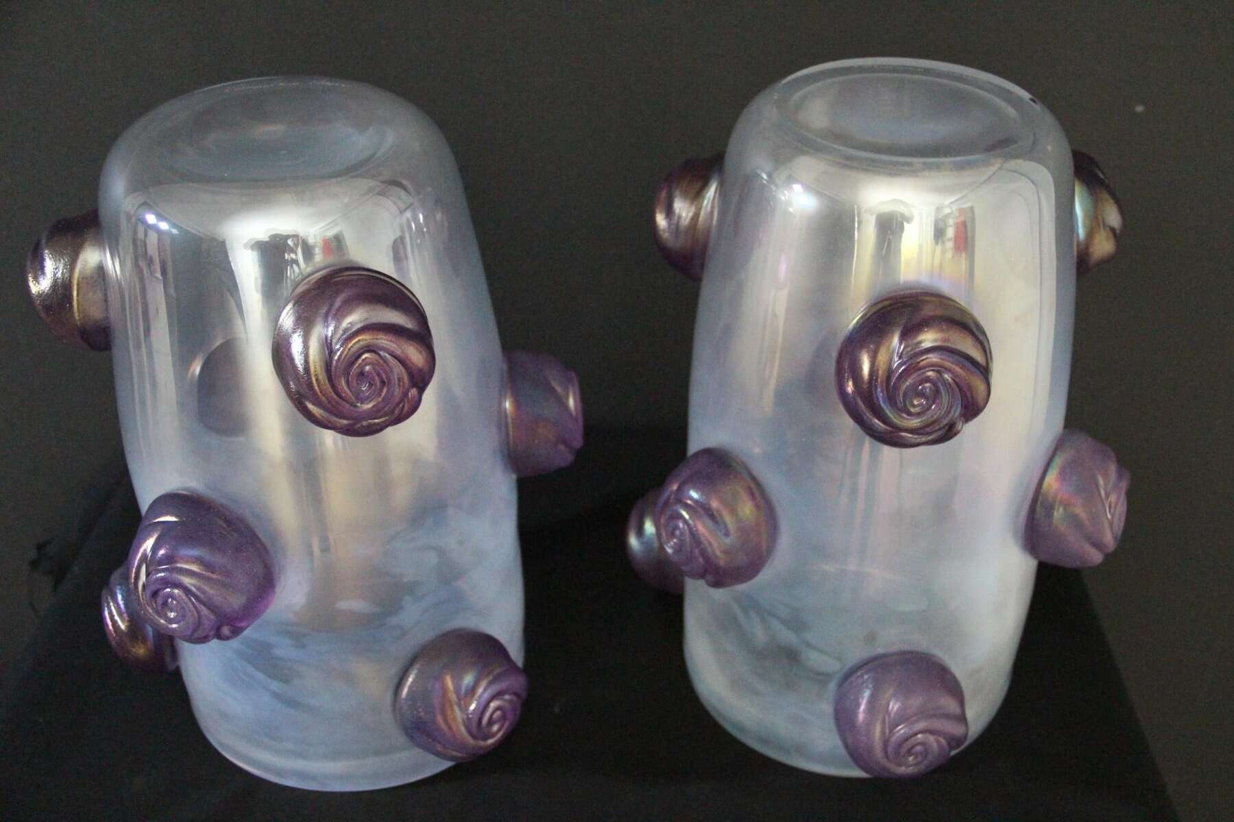 Cette paire de vases spectaculaires a une couleur nacrée irisée très inhabituelle qui passe du gris profond à l’argent clair en fonction des couleurs environnantes et de la lumière. Cet effet spécial est dû aux inclusions de poussière d’argent dans le verre. De plus, ils ont été entièrement réalisés à la main à Venise, y compris chaque rose en verre violet pour un effet très vivant… Chaque vase pèse environ 15 kg. Ces vases sont bien plus beaux en vrai que sur les photos… Ils s’adaptent à tous les styles d’intérieurs, qu’il s’agisse de l’art déco, du classique, du milieu du siècle, du moderne ou du contemporain. Tous deux sont signés à la main Cenedese Murano. Comme ils sont assez grands, ils sont parfaits comme objets décoratifs architecturaux ou comme veritables oeuvres d’art.