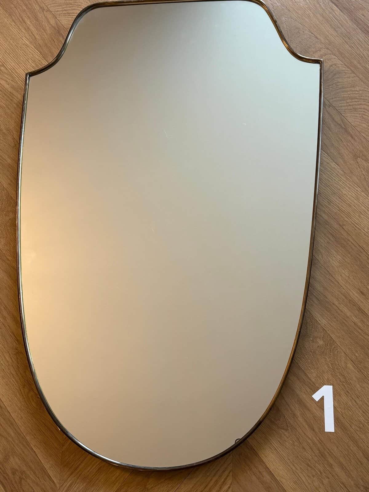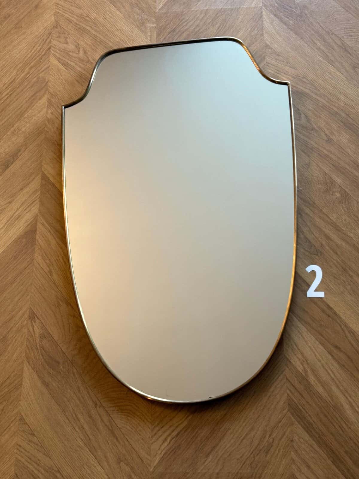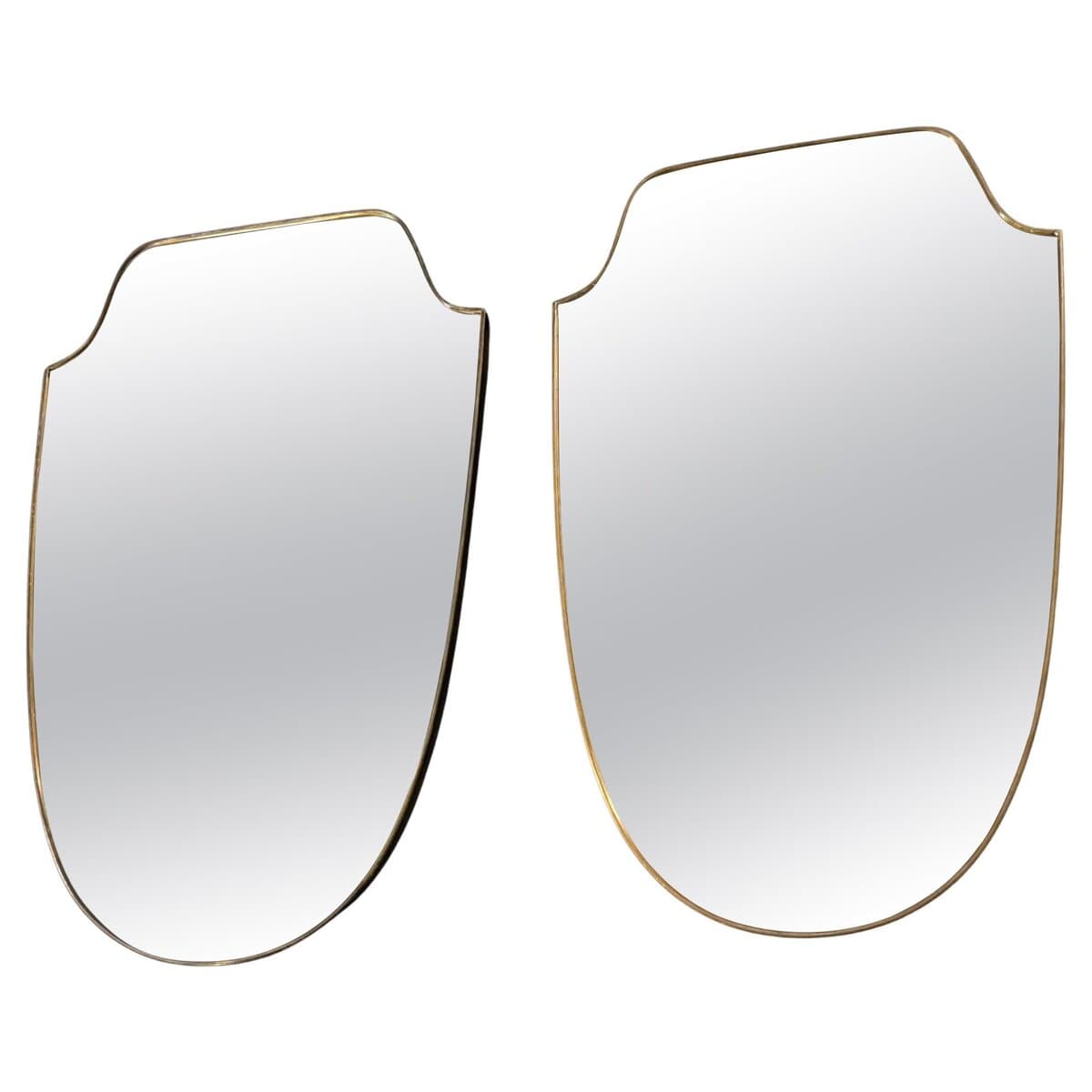 Ces miroirs très décoratifs ont été fabriqués en Italie dans les années 1950. Typiques du design de cette période, ils sont entièrement d’origine. Ils peuvent être accrochés au mur seul, par paire ou associé sà d’autres miroirs du même style pour obtenir un effet spectaculaire. Le cadre en laiton est épais et entoure tout le miroir. Sa forme incurvée, typiquement minimaliste des années 1950, est si élégante. De plus, il s’agit d’une pièce de qualité supérieure avec son épais dos tout en bois. Typique du style des créateurs italiens comme Gio Ponti ou Fontana Arte, ces miroirs muraux d’époque moderniste constitués d’un cadre en laiton façonné avec un sommet légèrement arqué et arrondi sont très chics. De plus, leur forme libre est également pleine de charme. Véritables icônes du design italien du milieu du siècle, ces miroirs sont intemporels et élégants, créant une atmosphère chic dans n’importe quel style d’intérieur. En bon état tout à fait original sur laiton patiné et verre miroir en cristal qui témoigne de son ancienneté et de son authenticité. Leur forme est assez inhabituelle et il est très rare de les trouver par paire, mais si vous souhaitez n’en acheter qu’un seul, c’est également possible.
