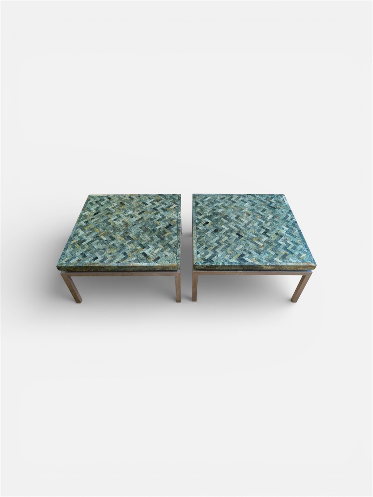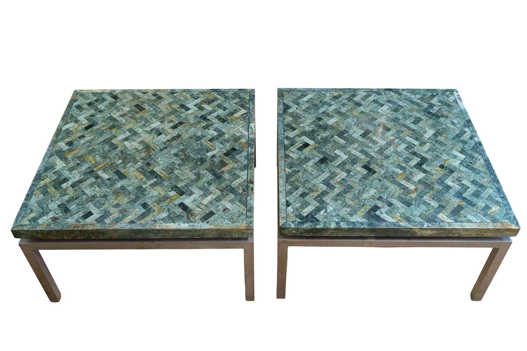 Paire de tables basses en marqueterie de marbre vert et piètement en acier brossé. En bouts de canapé ou en tables basses, en parfait état les plateaux de marbre sont de toute beauté.