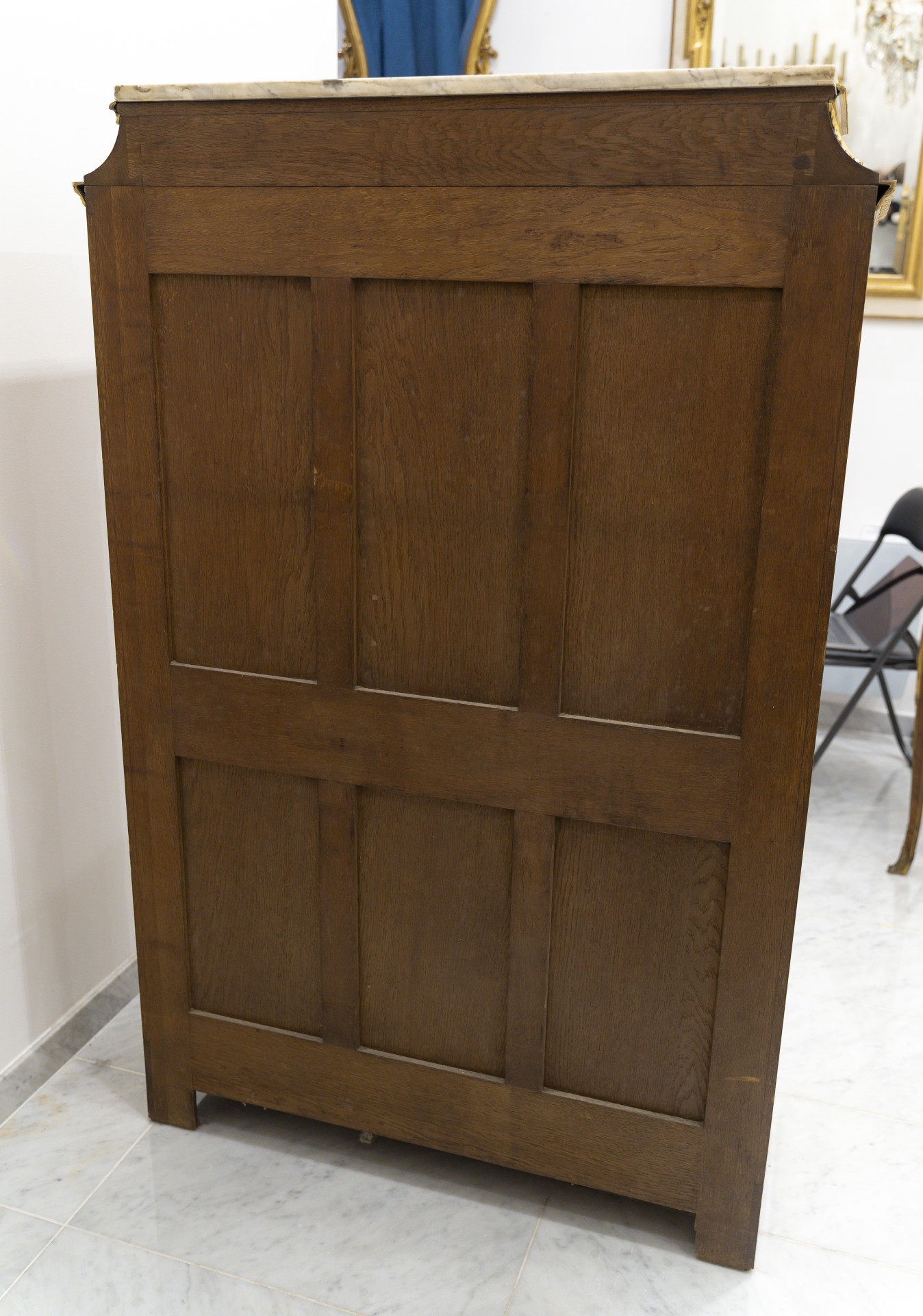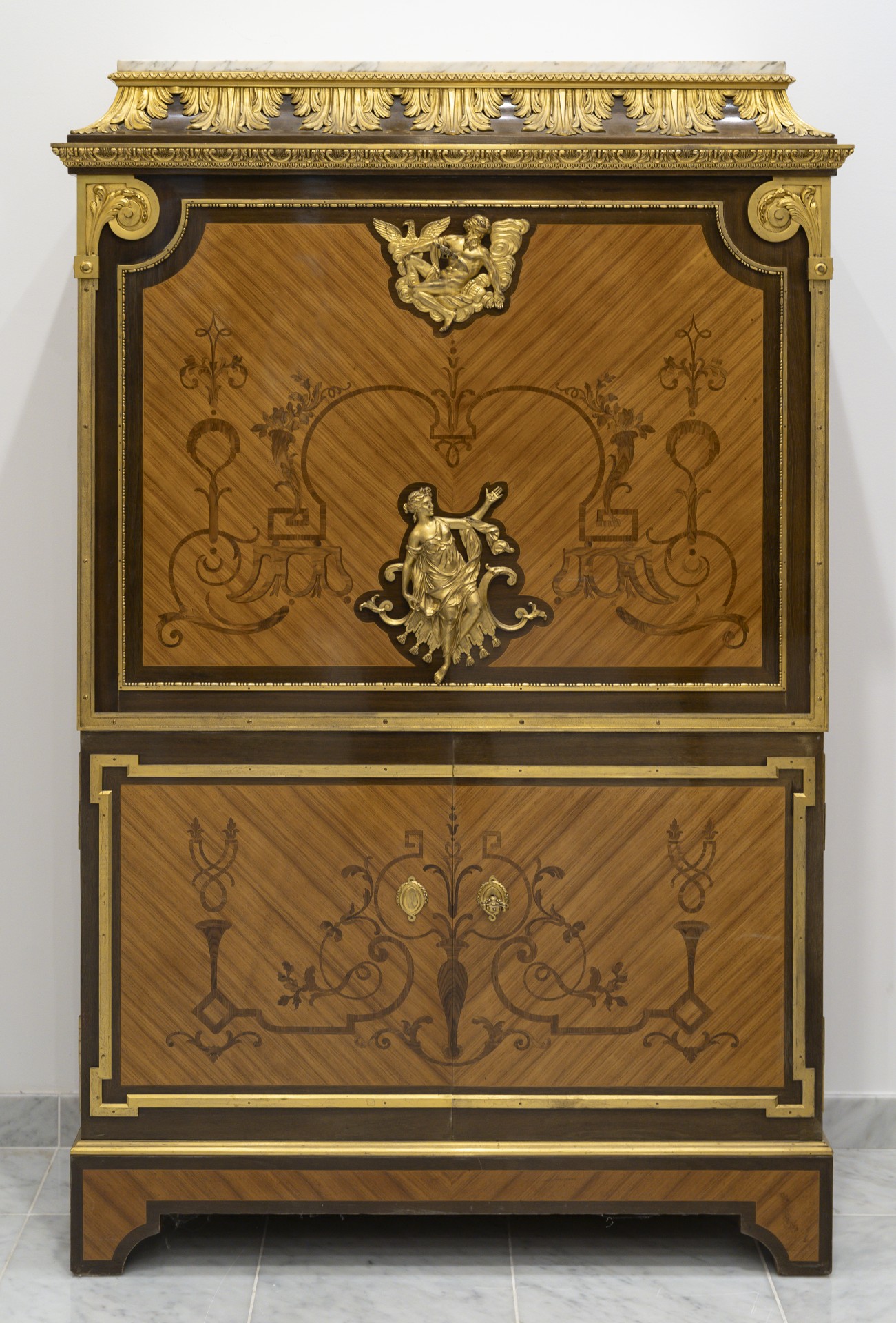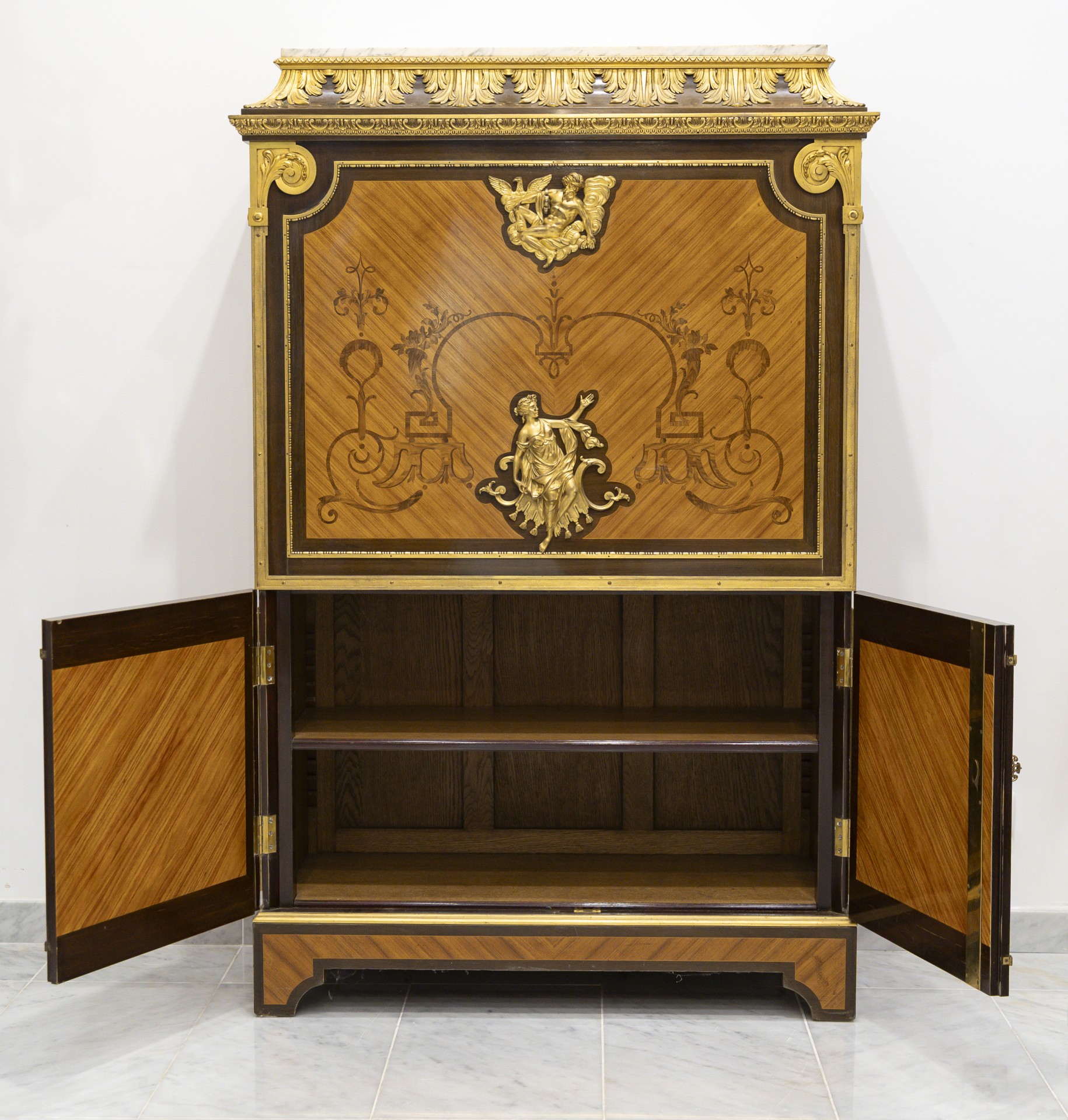 Notre secrétaire ne se contente pas d’être fonctionnel ou décoratif. Il véhicule un message de richesse, d’élégance et de prestige: Sur la partie haute du meuble, Jupiter, accompagné de son aigle majestueux, verse des pièces d’or à une femme placée au centre du panneau. La main ouverte pour les recevoir, elle incarne la Fortune, symbole de prospérité et d’abondance. Chaque détail, du bronze ciselé à la finesse de la marqueterie, souligne le savoir-faire exceptionnel de l’ébéniste et transforme ce secrétaire en véritable récit sculpté et marqueté, où art et symbole se rencontrent.