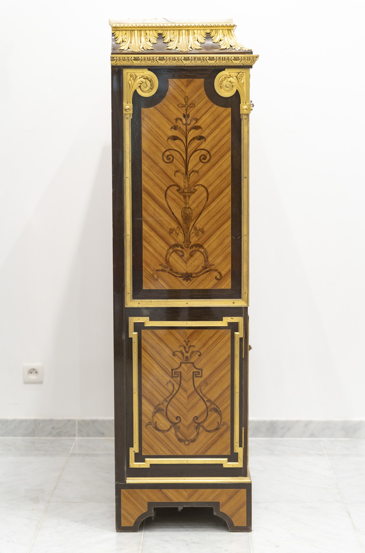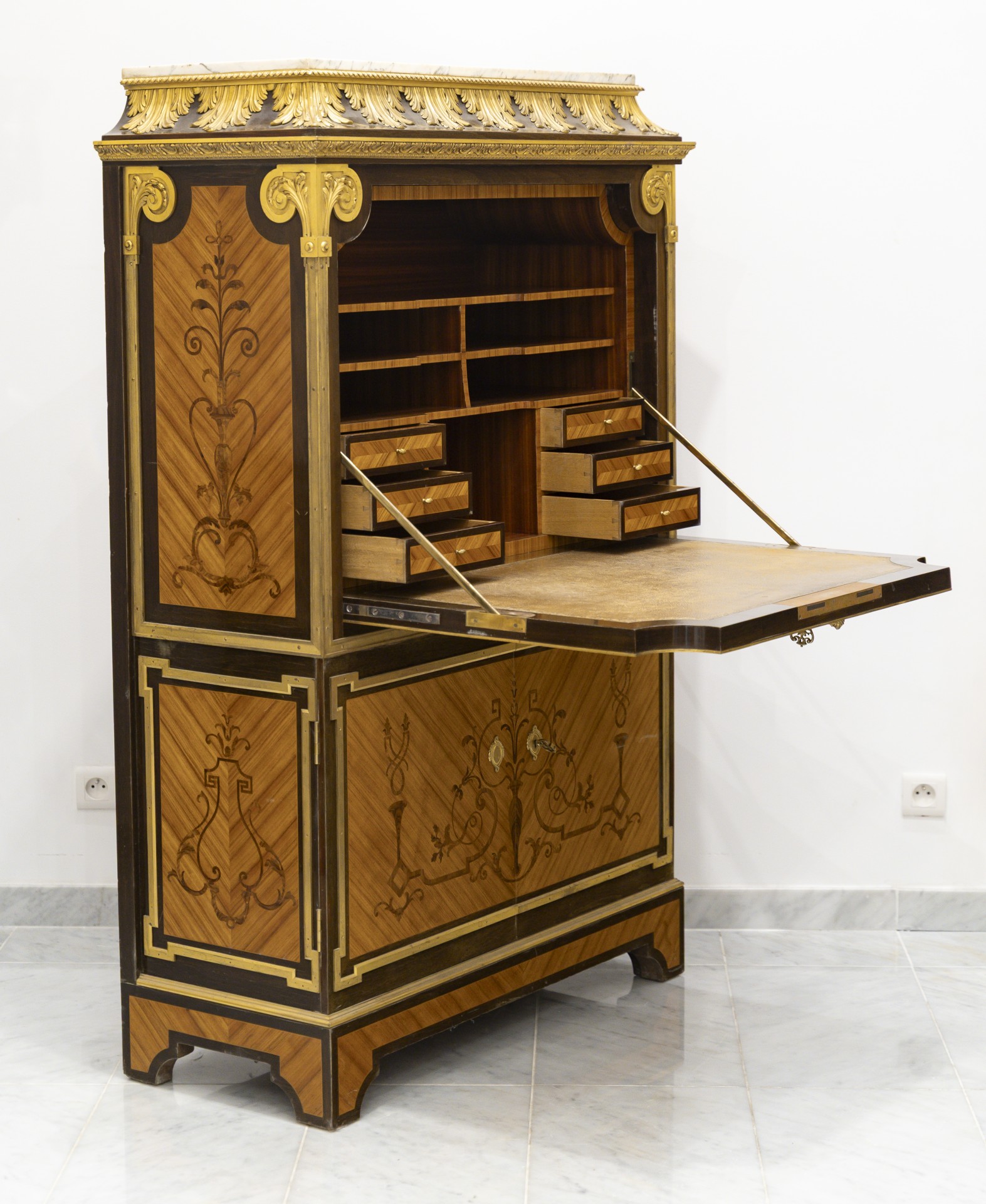 La partie basse, dissimulée derrière deux portes marquetées, propose un vaste espace de rangement avec une tablette intérieure, idéal pour les dossiers, livres ou objets volumineux. L’ensemble est soigné, parfaitement fini et reflète la qualité du travail d’ébénisterie propre aux meilleures productions parisiennes du XIXe siècle.