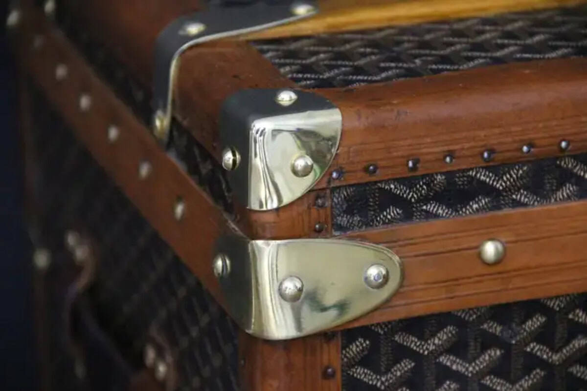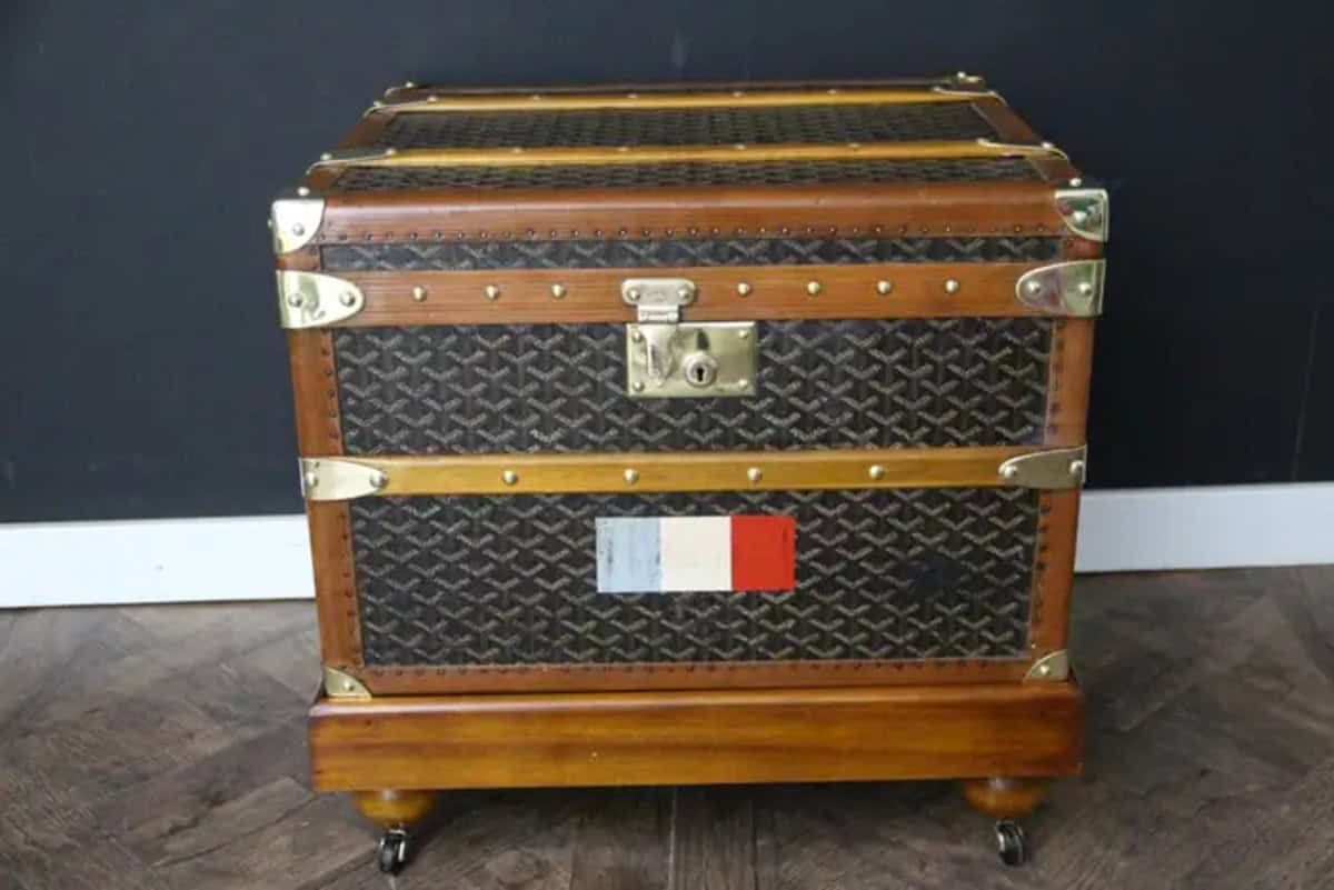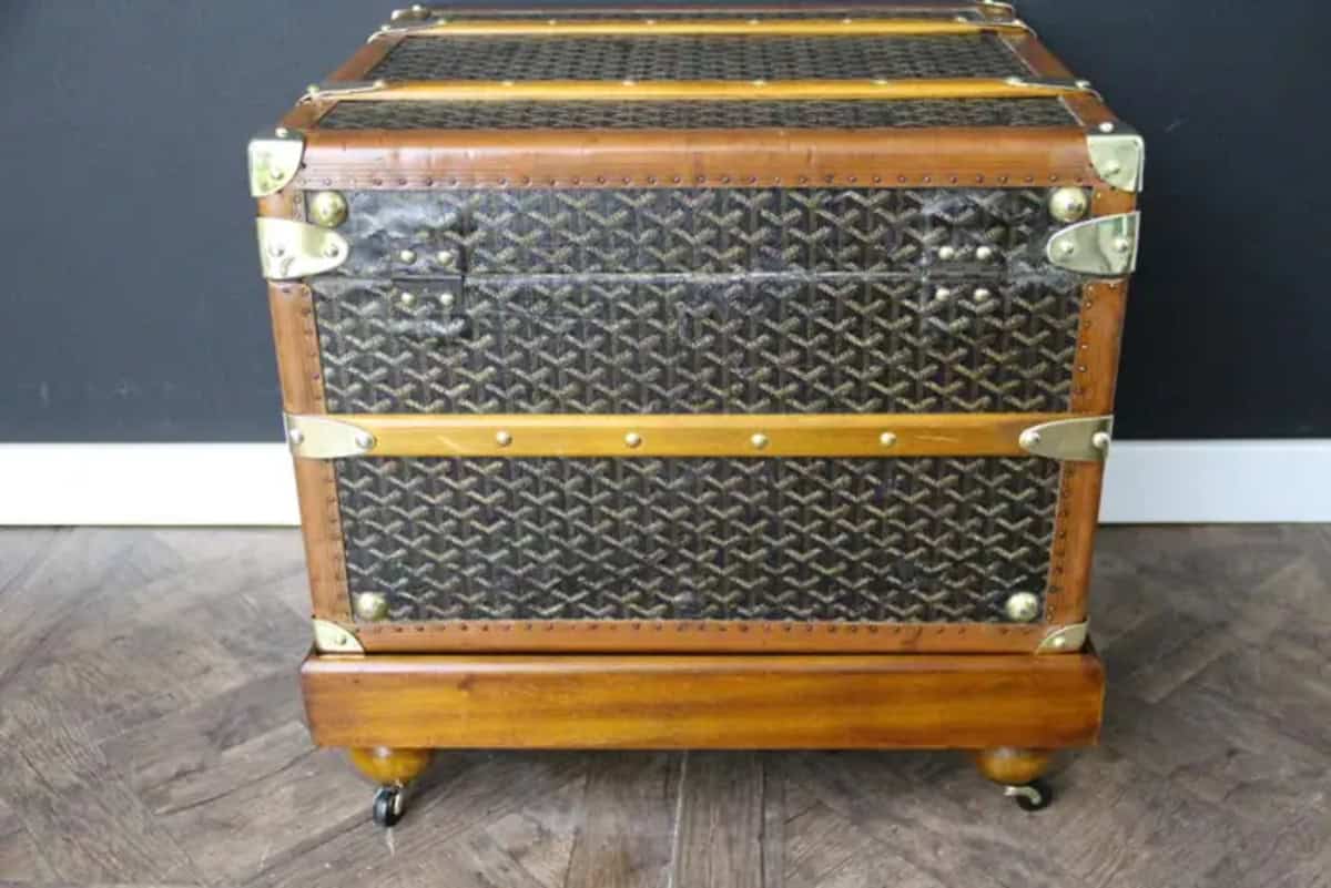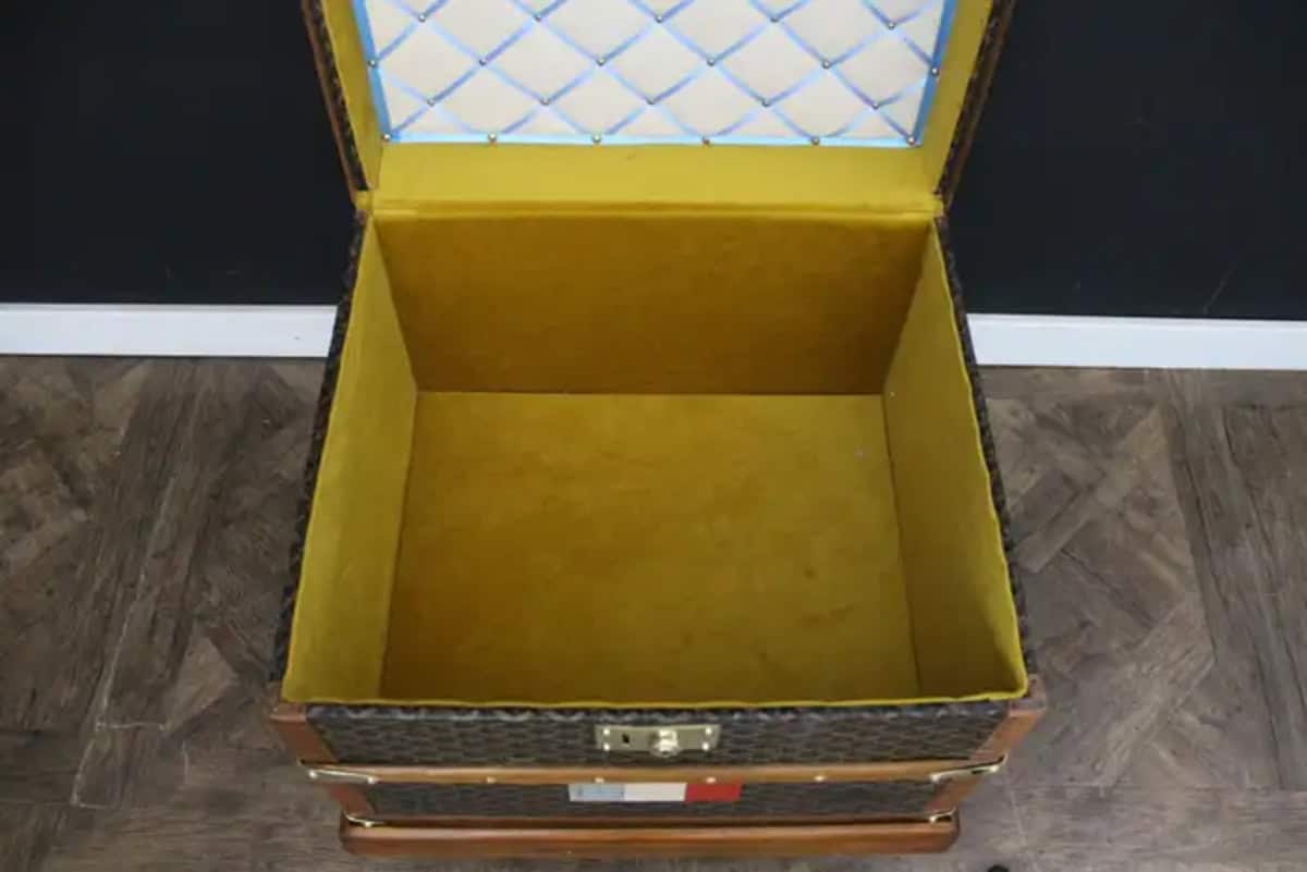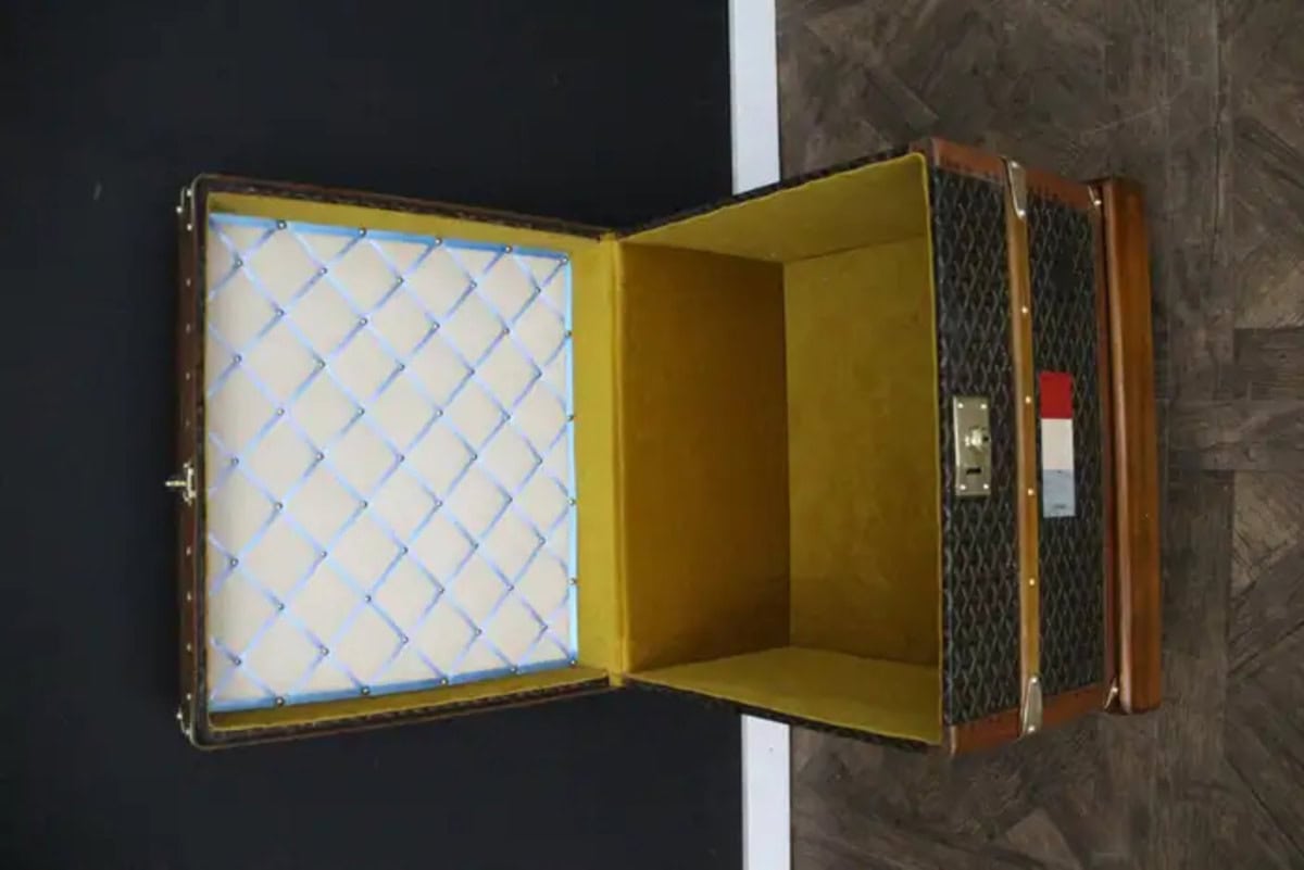 L’intérieur de la malle ainsi que le sous le couvercle sont parfaitement propres, ce qui est très pratique pour l’entreposage. Son support en bois sur mesure a été fabriqué par un ébéniste professionnel pour ajouter une touche chic supplémentaire. Ce support est muni de roulettes en dessous. Veuillez noter que sans son support en bois, cette malle à chapeau Goyard ne mesure que 35 cm de haut. Pour un usage courant, cette malle Goyard pourrait se transformer en une très belle table de chevet, table d’appoint ou bout de canapé. Les malles Goyard ajoutent toujours une touche française très élégante à tous les styles d’intérieurs. Ils sont si chics !