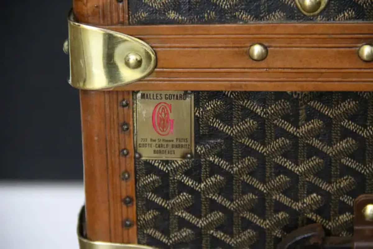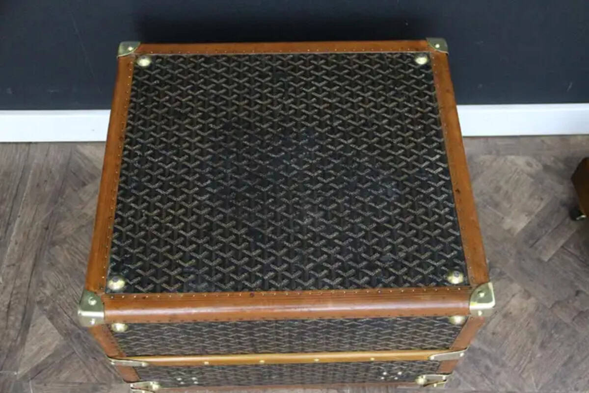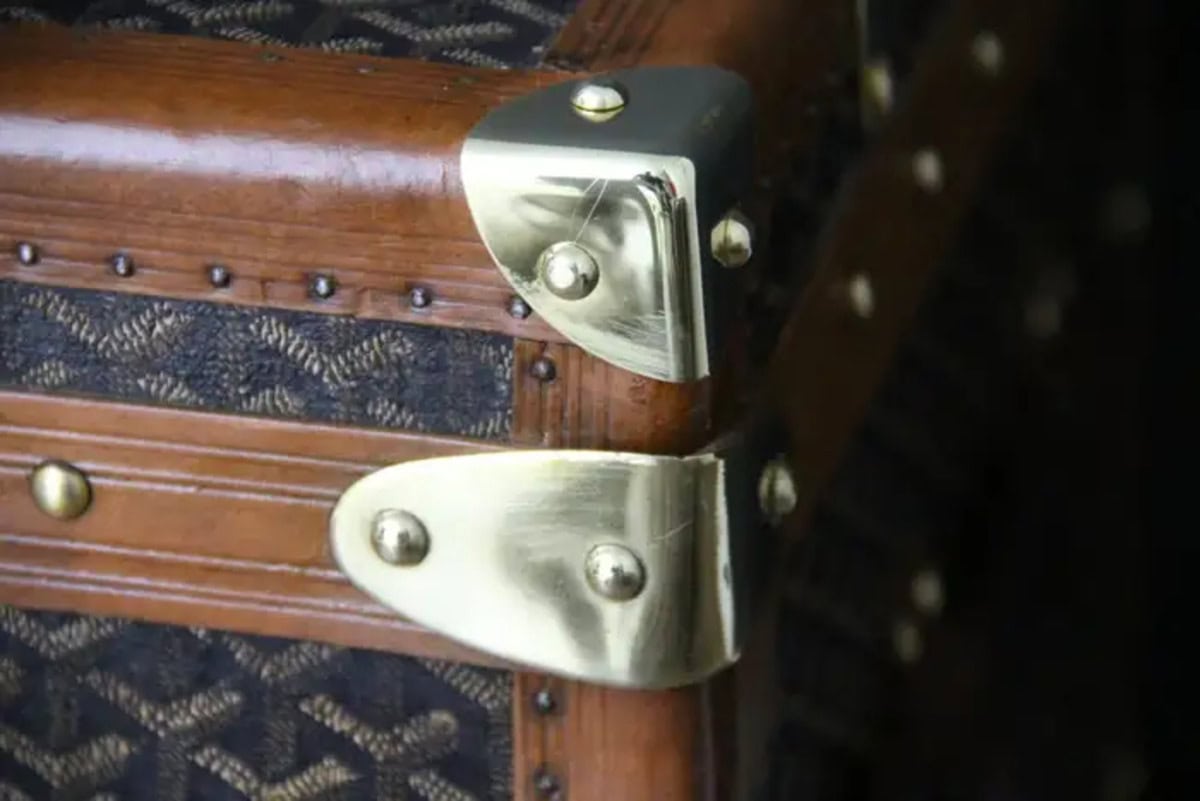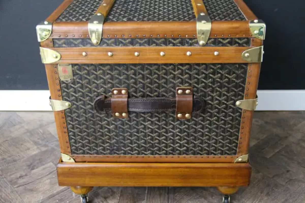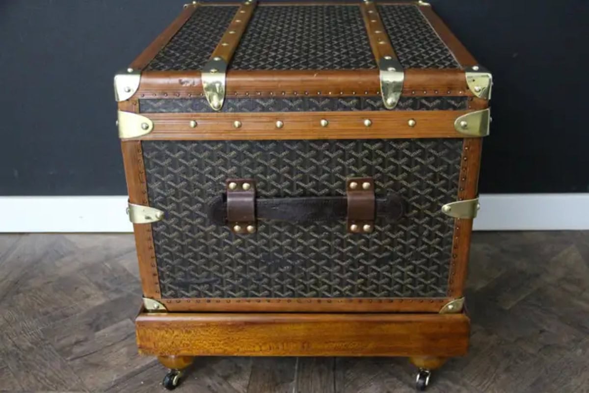 L’intérieur de la malle ainsi que le sous le couvercle sont parfaitement propres, ce qui est très pratique pour l’entreposage. Son support en bois sur mesure a été fabriqué par un ébéniste professionnel pour ajouter une touche chic supplémentaire. Ce support est muni de roulettes en dessous. Veuillez noter que sans son support en bois, cette malle à chapeau Goyard ne mesure que 35 cm de haut. Pour un usage courant, cette malle Goyard pourrait se transformer en une très belle table de chevet, table d’appoint ou bout de canapé. Les malles Goyard ajoutent toujours une touche française très élégante à tous les styles d’intérieurs. Ils sont si chics !