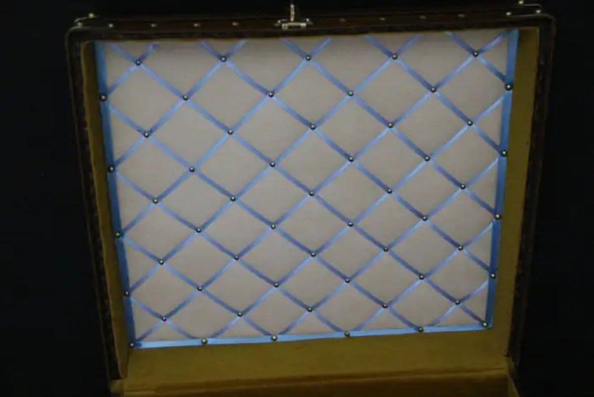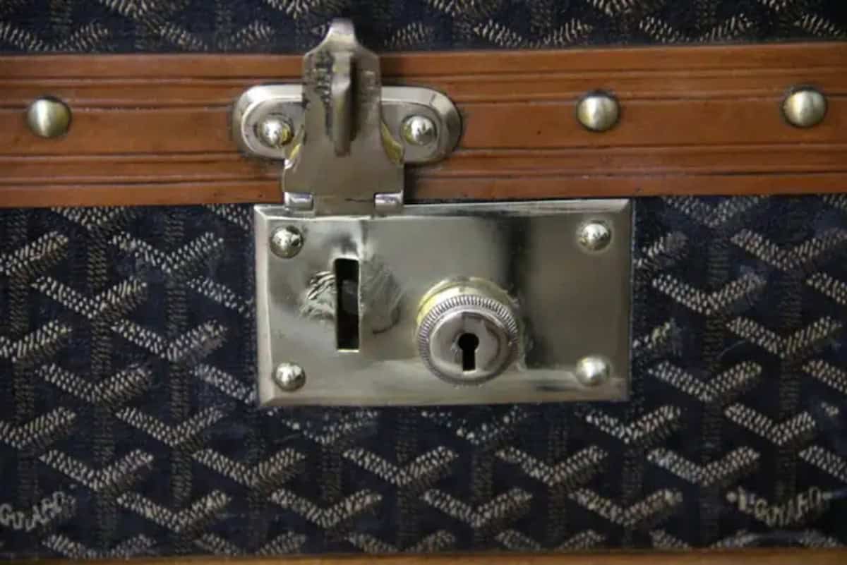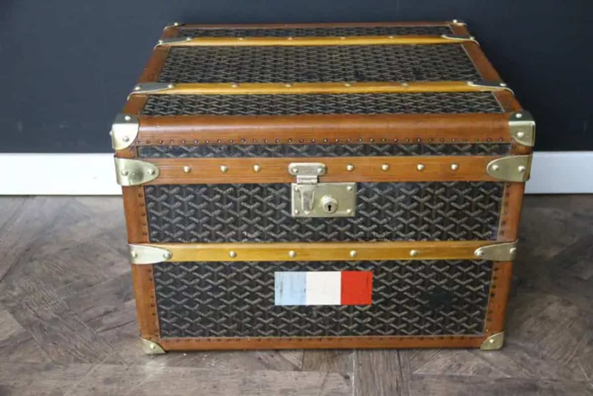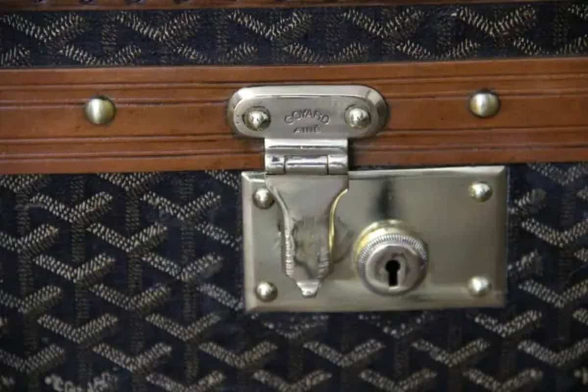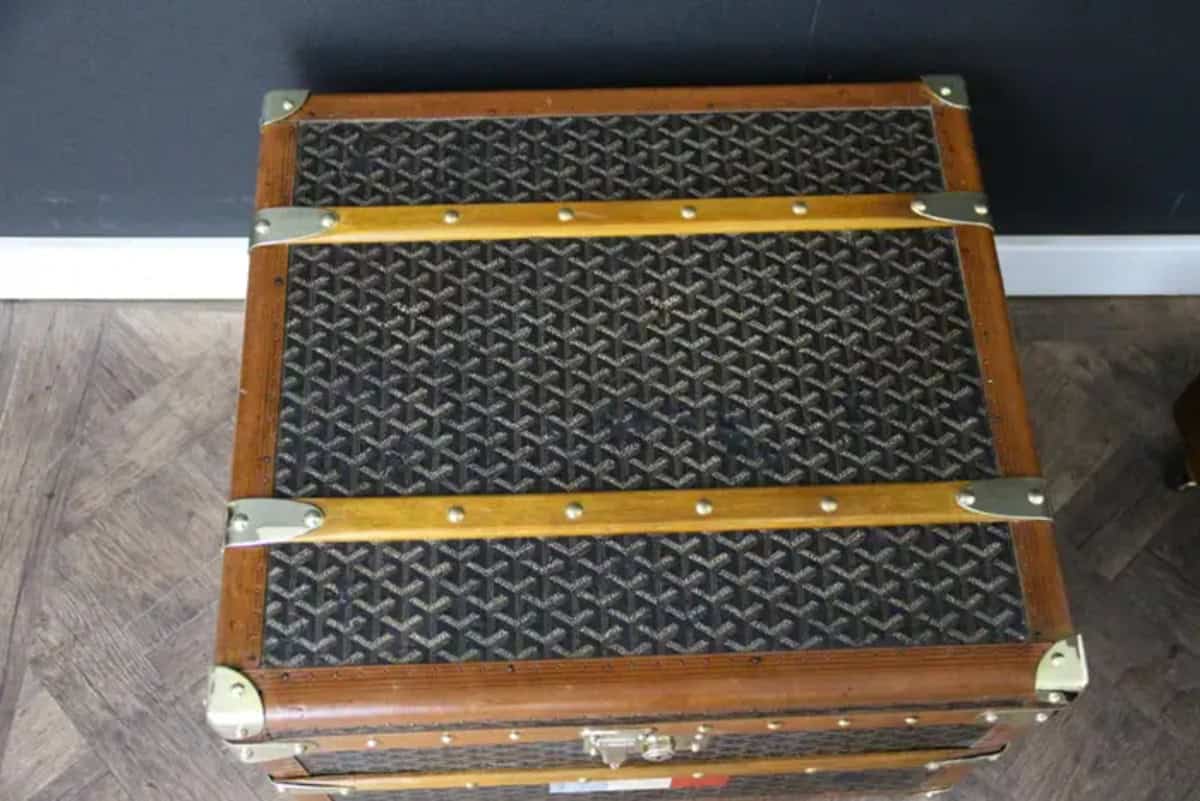 L’intérieur de la malle ainsi que le sous le couvercle sont parfaitement propres, ce qui est très pratique pour l’entreposage. Son support en bois sur mesure a été fabriqué par un ébéniste professionnel pour ajouter une touche chic supplémentaire. Ce support est muni de roulettes en dessous. Veuillez noter que sans son support en bois, cette malle à chapeau Goyard ne mesure que 35 cm de haut. Pour un usage courant, cette malle Goyard pourrait se transformer en une très belle table de chevet, table d’appoint ou bout de canapé. Les malles Goyard ajoutent toujours une touche française très élégante à tous les styles d’intérieurs. Ils sont si chics !