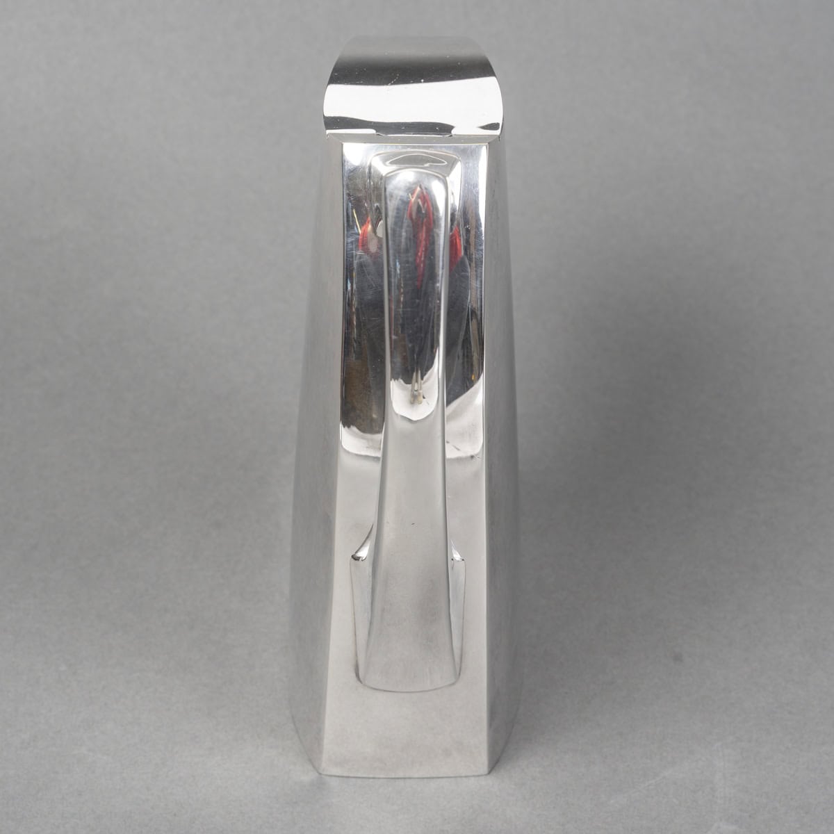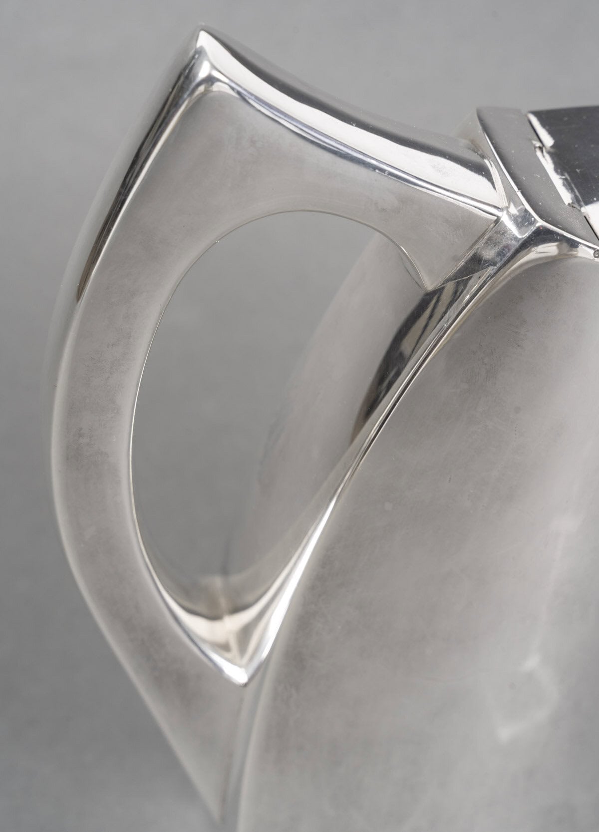 La silhouette, épurée et géométrique, évoque à la fois la rigueur architecturale et les volumes futuristes chers à Pierre Cardin. Le large manche angulaire et le bec verseur effilé s’intègrent dans un mouvement continu, sans rupture de ligne. L’ensemble, d’un poli miroir, témoigne d’une exécution artisanale de haute qualité par l’atelier milanais de G. Silva, orfèvre reconnu pour sa collaboration avec de grands créateurs de mode et de design.