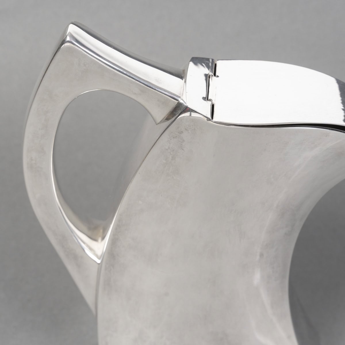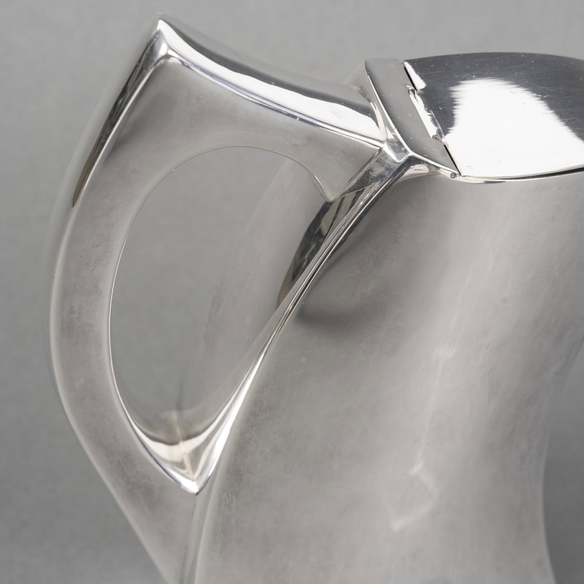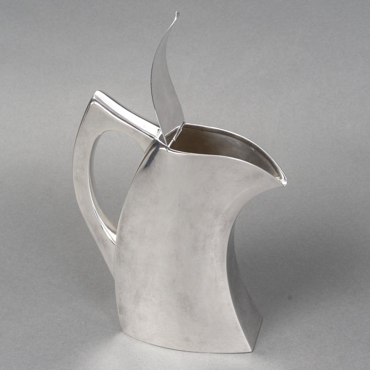 Élégante verseuse couverte en argent massif, au corps galbé formant une ligne dynamique et tendue, caractéristique du goût sculptural des années 1970.