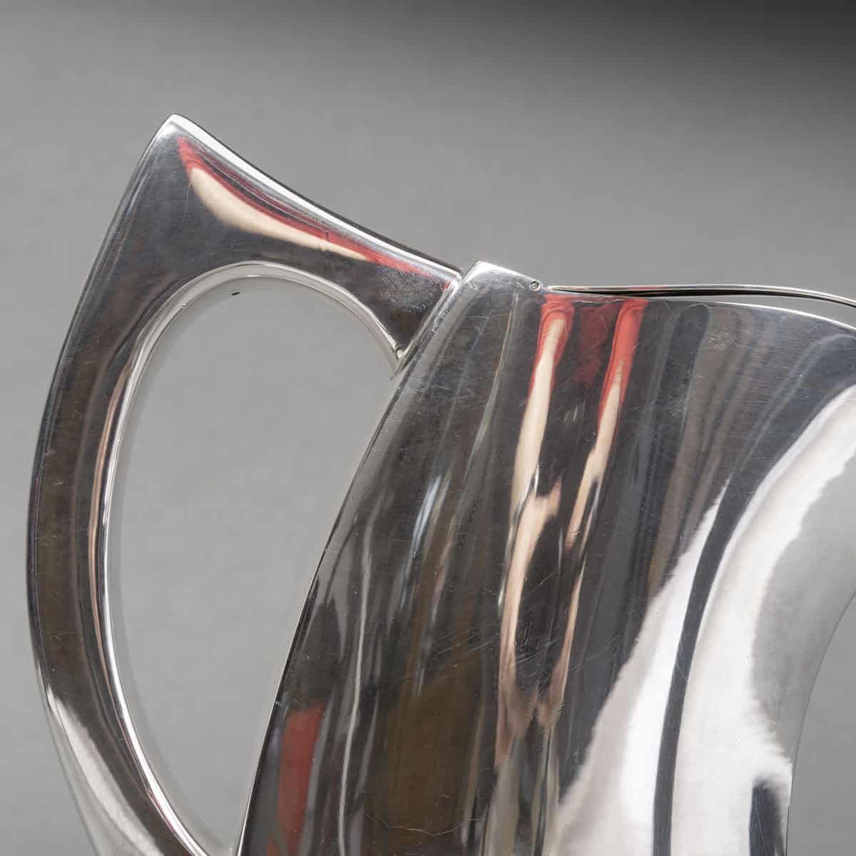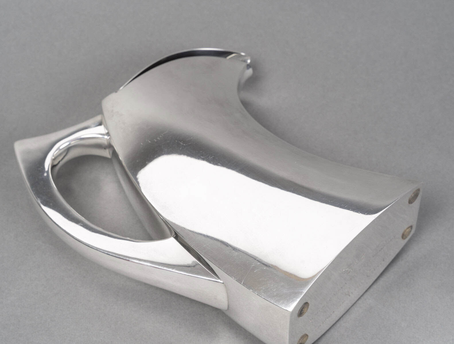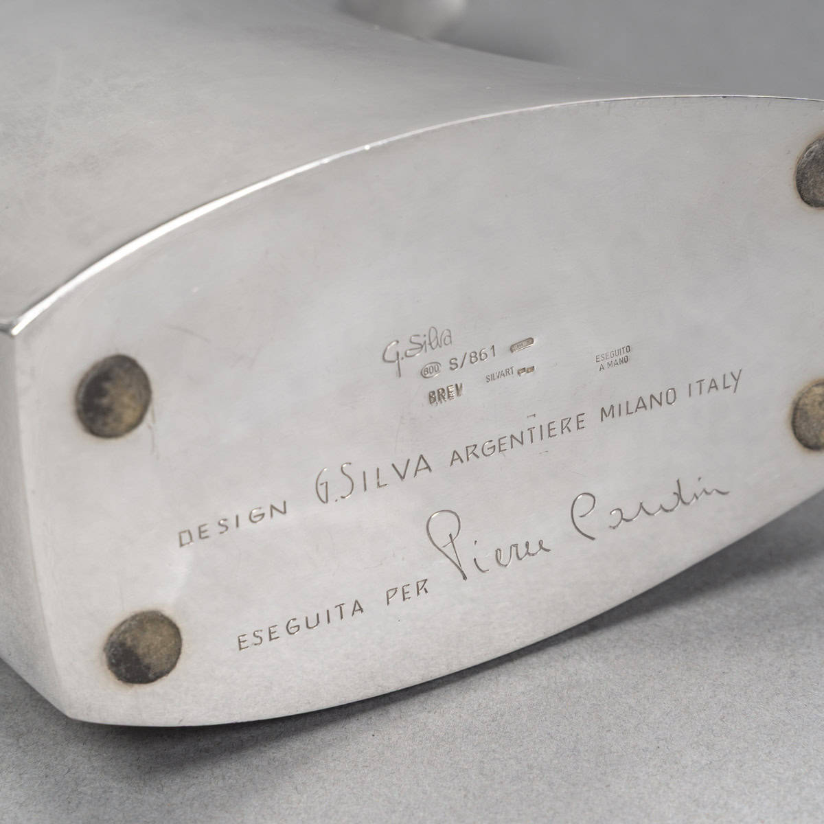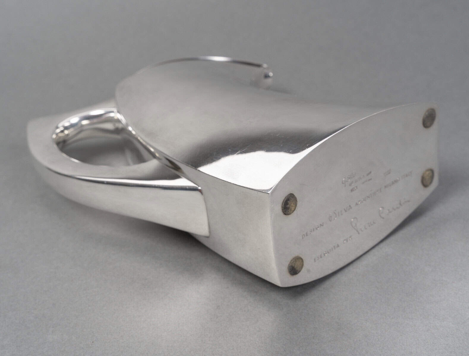 La silhouette, épurée et géométrique, évoque à la fois la rigueur architecturale et les volumes futuristes chers à Pierre Cardin. Le large manche angulaire et le bec verseur effilé s’intègrent dans un mouvement continu, sans rupture de ligne. L’ensemble, d’un poli miroir, témoigne d’une exécution artisanale de haute qualité par l’atelier milanais de G. Silva, orfèvre reconnu pour sa collaboration avec de grands créateurs de mode et de design.