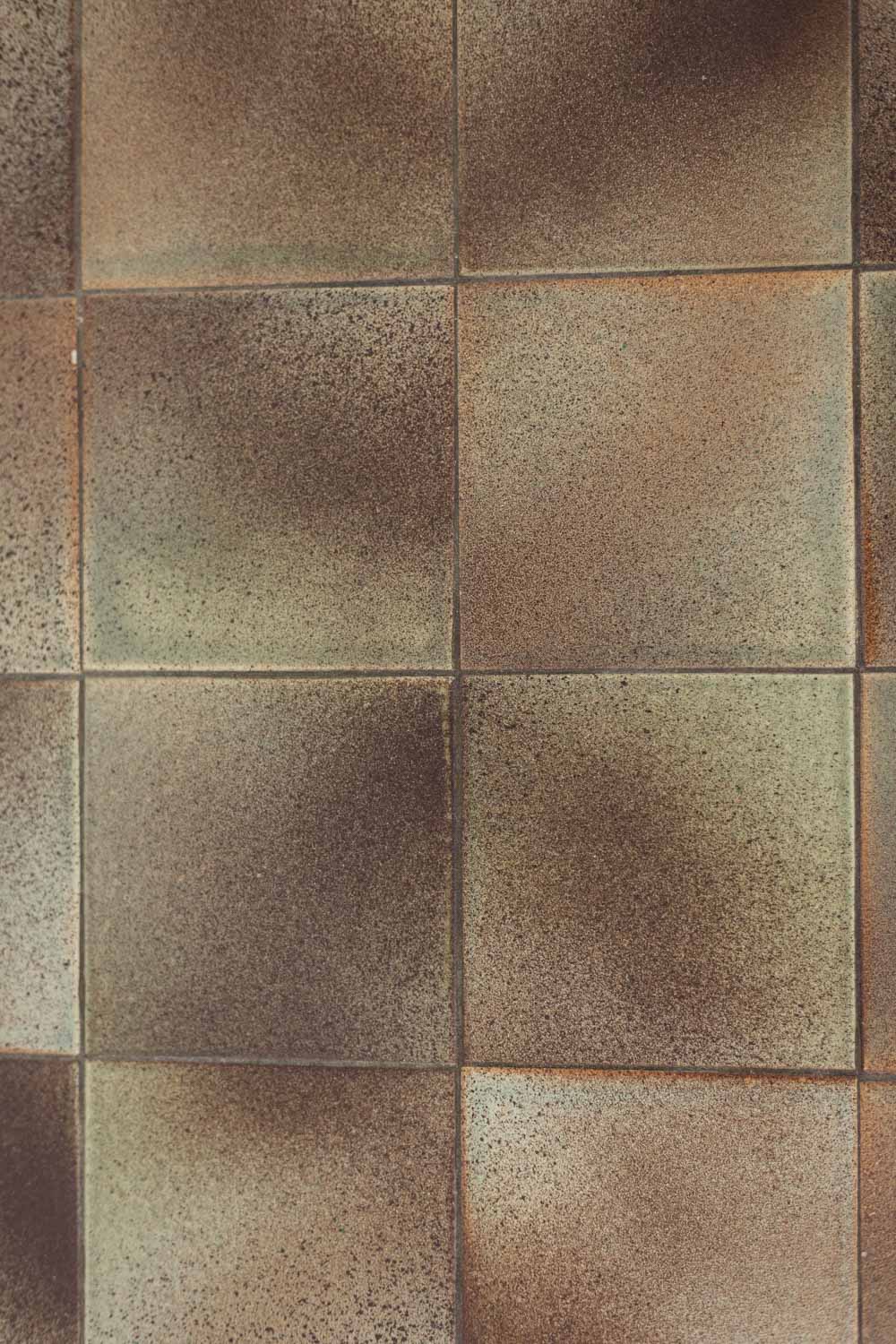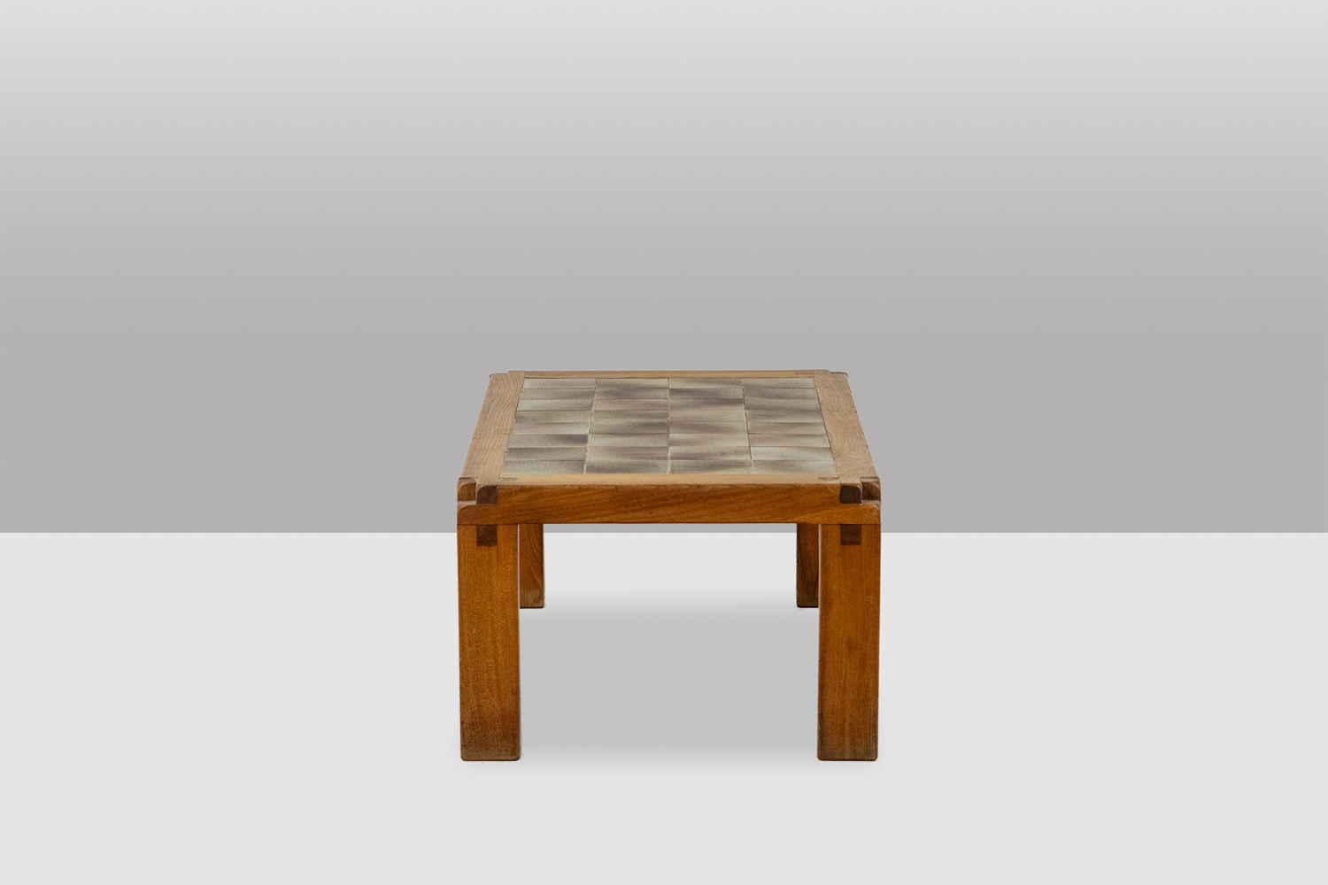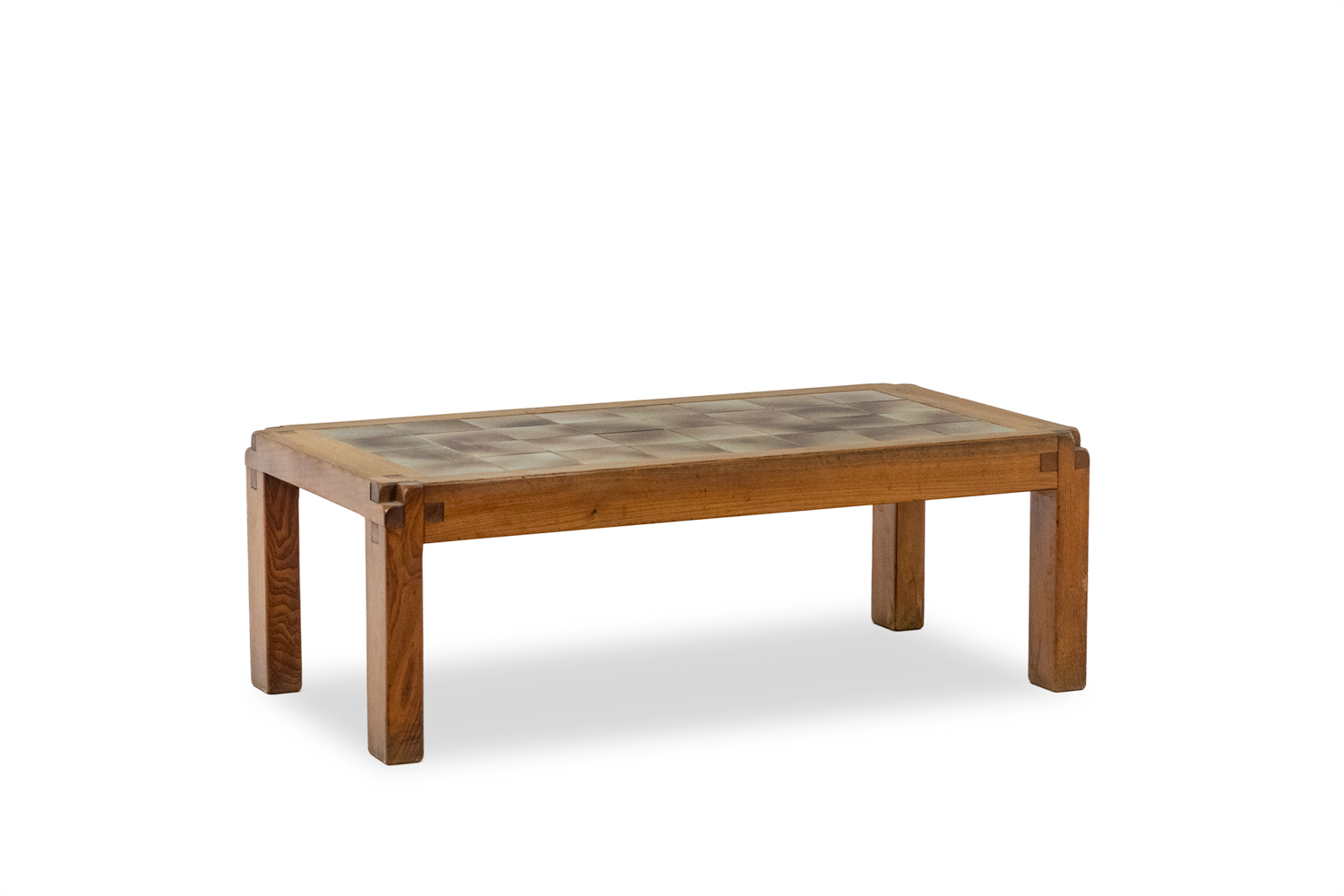 Table basse de forme rectangulaire, en orme blond massif et plateau de céramique. Assemblage à queue droite du piètement bois. Carreaux de céramique dans un camaïeu de beige et de brun.