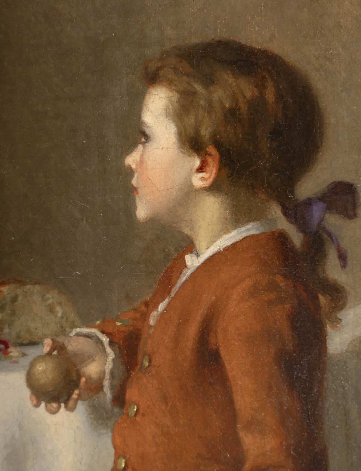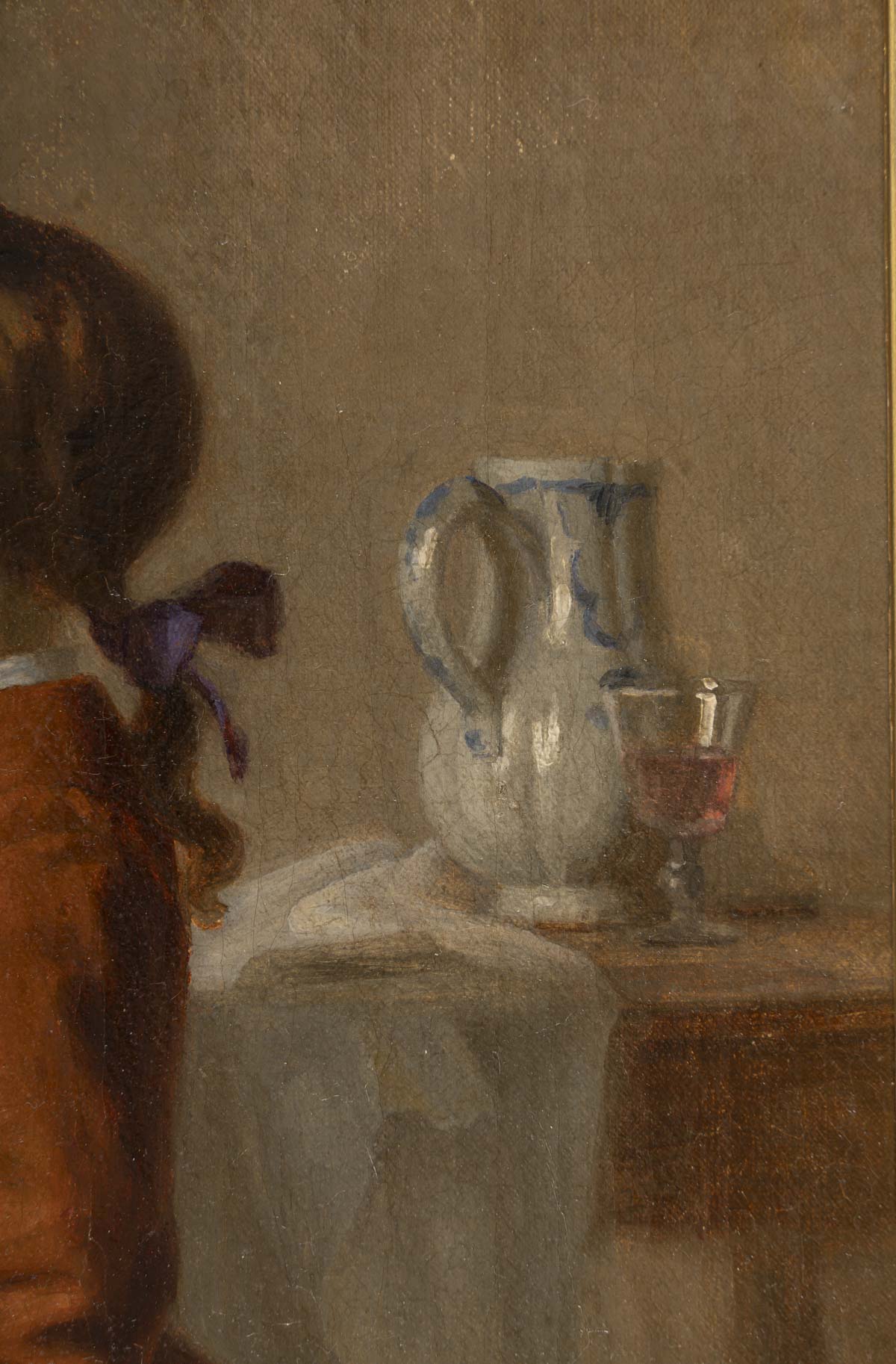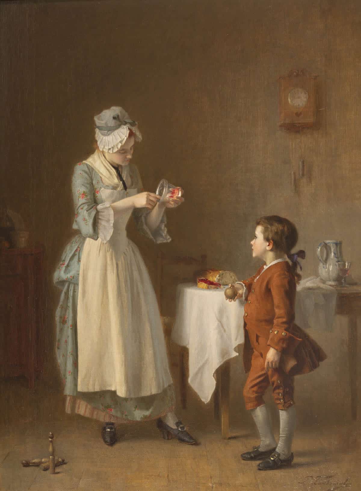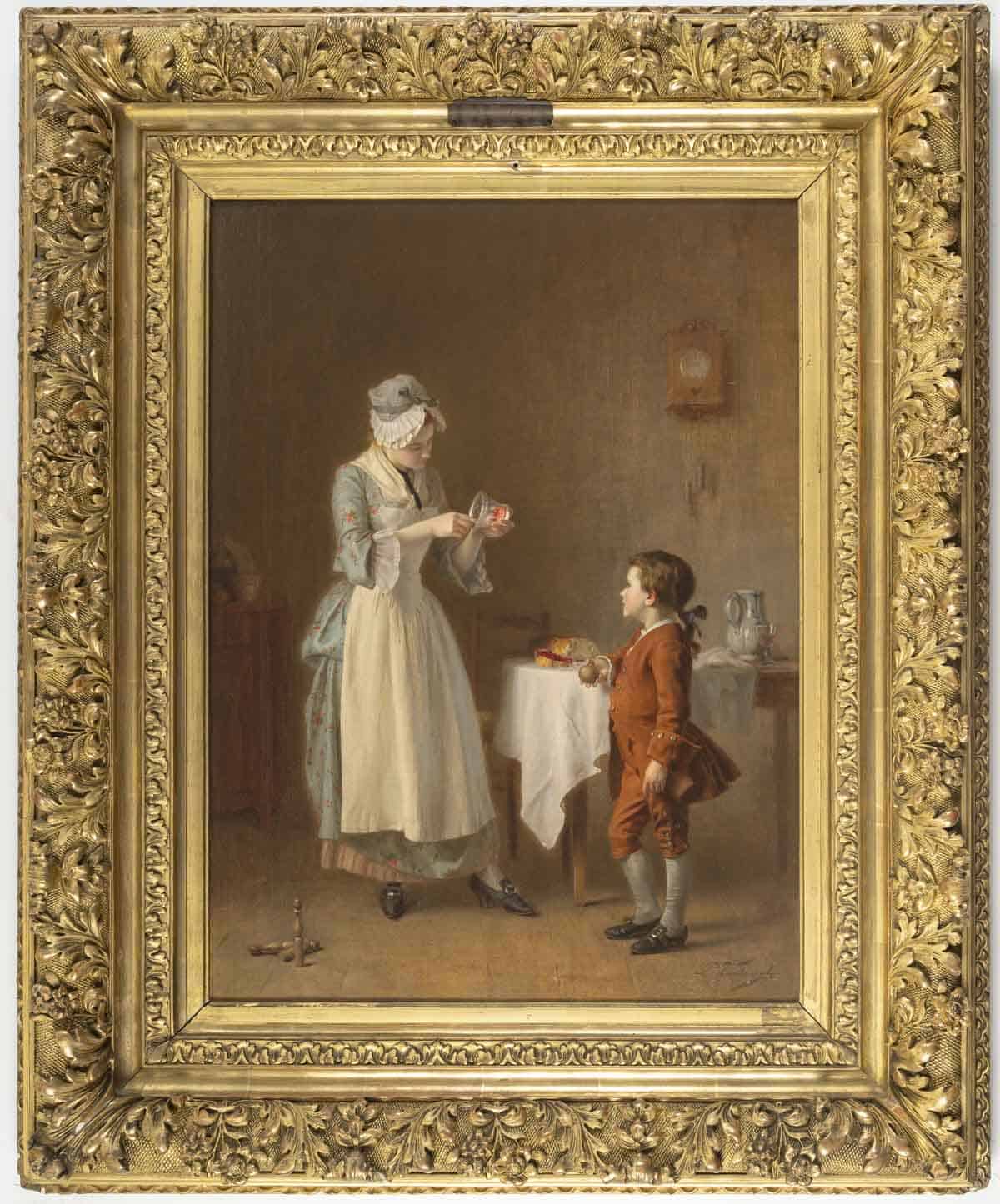 Pierre Joseph TOUSSAINT (1822-1888) La tartine Huile sur toîle signée en bas à droite 59 x 43 cm hors cadre et 74 x 58 cm Beau cadre en bois sculpté et doré Dans l’esprit de Chardin, voici une scène pleine de tendresse entre une mère et son fils. La mère porte avec élégance une robe bleue à fleurs et un tablier blanc, elle s’applique à remplir la cuillière de confiture pour garnir un peu plus la tartine posée sur la table. Le jeune garçon vêtu d’un habit rouge, les cheveux attachés par un catogan, tient dans sa main sa boulle de jeu,il regarde la tartine avec gourmandise. La pièce est feutrée, meublée d’un buffet, d’une pendule accrochée au mur, d’une table recouverte d’une nappe blanche sur laquelle est posée une cruche en céramique bleue. Pierre Joseph Toussaint est né à Bruxelles en 1822. À l’âge de quatorze ans, il entre à l’Académie de Bruxelles, où il a été formé dans un style traditionnel flamand juqu’en 1850. Quelques années plus tard, il a été invité à exposer lors de salons importants à Bruxelles, Gand et Anvers. Il a principalement peint des scènes de genre.