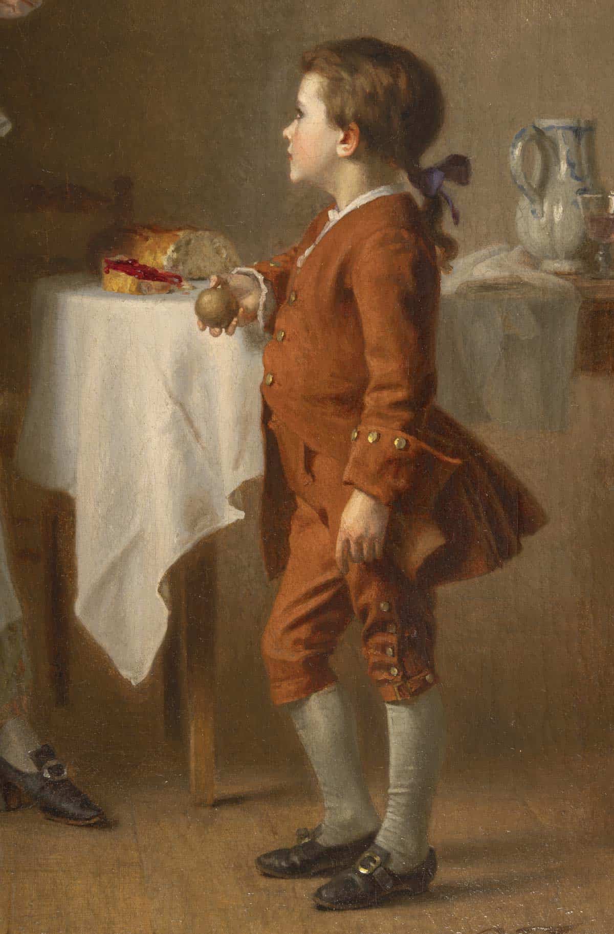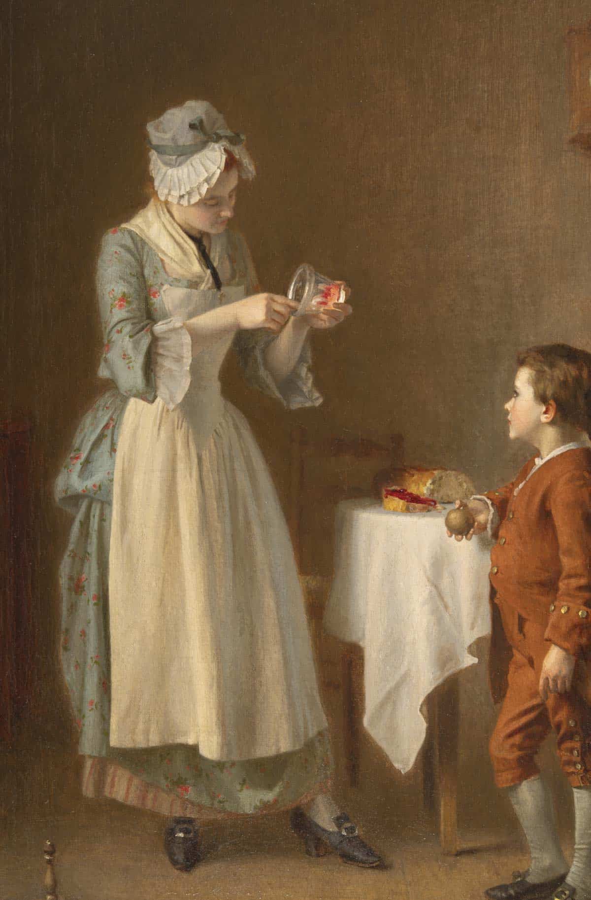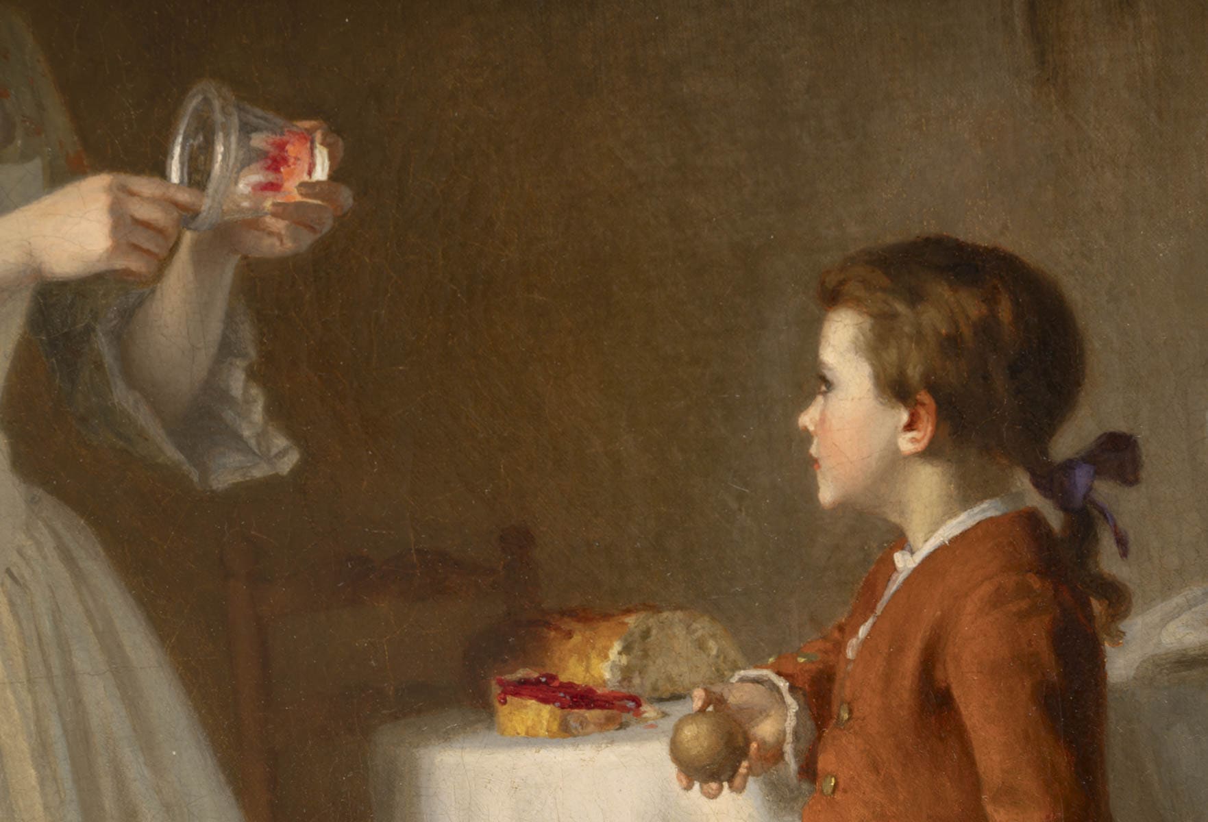 Pierre Joseph TOUSSAINT (1822-1888) La tartine Huile sur toîle signée en bas à droite 59 x 43 cm hors cadre et 74 x 58 cm Beau cadre en bois sculpté et doré Dans l’esprit de Chardin, voici une scène pleine de tendresse entre une mère et son fils. La mère porte avec élégance une robe bleue à fleurs et un tablier blanc, elle s’applique à remplir la cuillière de confiture pour garnir un peu plus la tartine posée sur la table. Le jeune garçon vêtu d’un habit rouge, les cheveux attachés par un catogan, tient dans sa main sa boulle de jeu,il regarde la tartine avec gourmandise. La pièce est feutrée, meublée d’un buffet, d’une pendule accrochée au mur, d’une table recouverte d’une nappe blanche sur laquelle est posée une cruche en céramique bleue. Pierre Joseph Toussaint est né à Bruxelles en 1822. À l’âge de quatorze ans, il entre à l’Académie de Bruxelles, où il a été formé dans un style traditionnel flamand juqu’en 1850. Quelques années plus tard, il a été invité à exposer lors de salons importants à Bruxelles, Gand et Anvers. Il a principalement peint des scènes de genre.