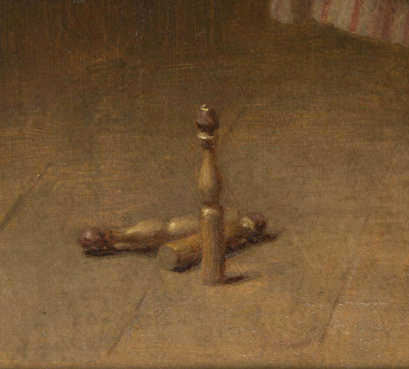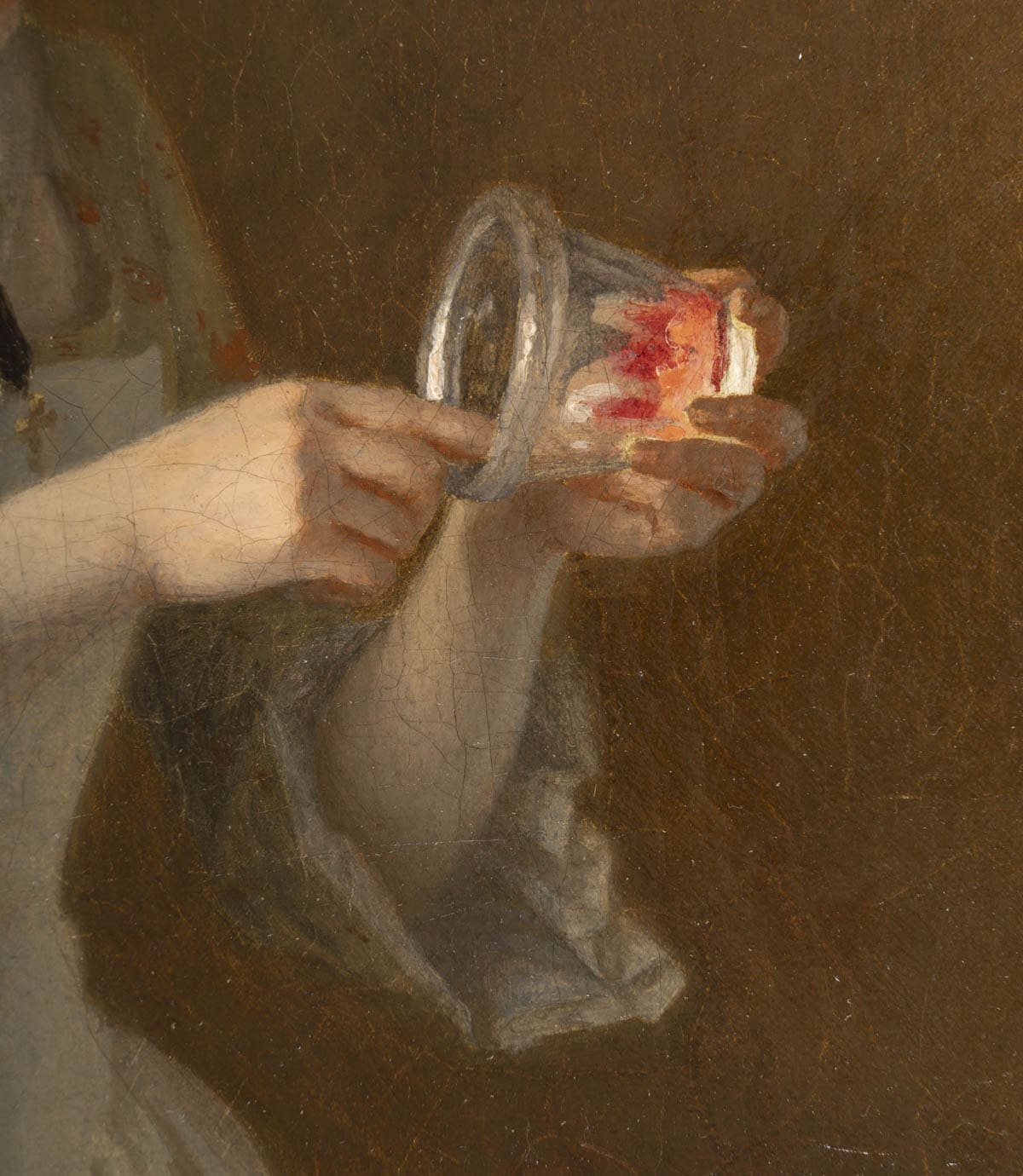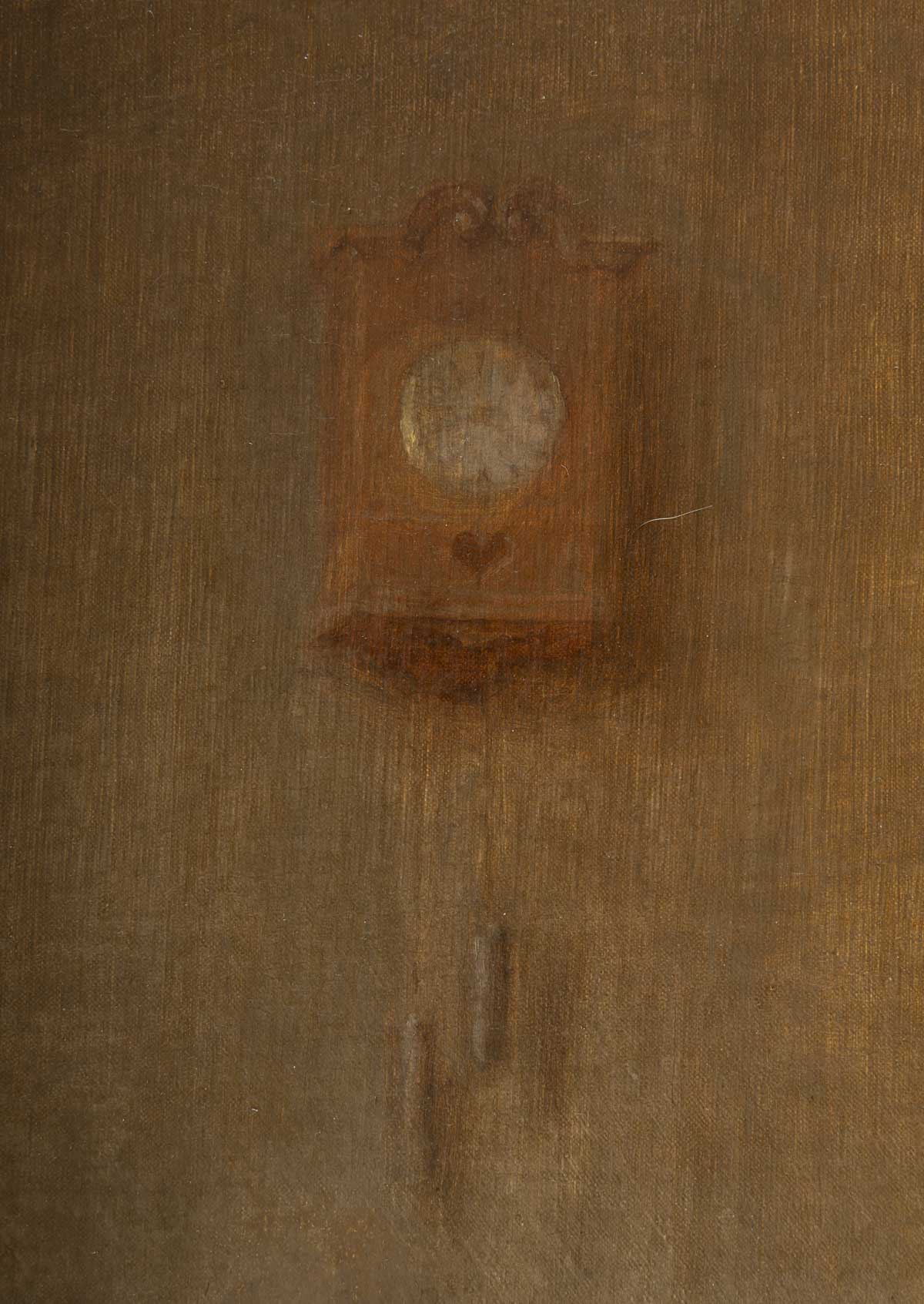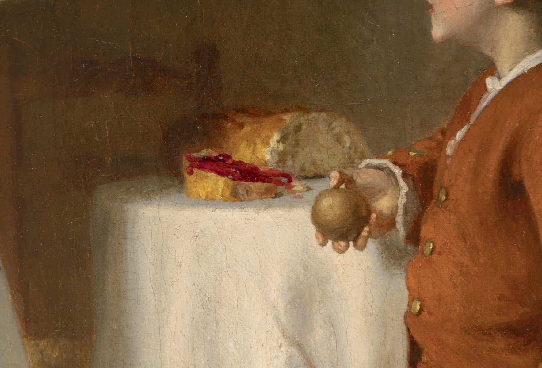 Pierre Joseph TOUSSAINT (1822-1888) La tartine Huile sur toîle signée en bas à droite 59 x 43 cm hors cadre et 74 x 58 cm Beau cadre en bois sculpté et doré Dans l’esprit de Chardin, voici une scène pleine de tendresse entre une mère et son fils. La mère porte avec élégance une robe bleue à fleurs et un tablier blanc, elle s’applique à remplir la cuillière de confiture pour garnir un peu plus la tartine posée sur la table. Le jeune garçon vêtu d’un habit rouge, les cheveux attachés par un catogan, tient dans sa main sa boulle de jeu,il regarde la tartine avec gourmandise. La pièce est feutrée, meublée d’un buffet, d’une pendule accrochée au mur, d’une table recouverte d’une nappe blanche sur laquelle est posée une cruche en céramique bleue. Pierre Joseph Toussaint est né à Bruxelles en 1822. À l’âge de quatorze ans, il entre à l’Académie de Bruxelles, où il a été formé dans un style traditionnel flamand juqu’en 1850. Quelques années plus tard, il a été invité à exposer lors de salons importants à Bruxelles, Gand et Anvers. Il a principalement peint des scènes de genre.