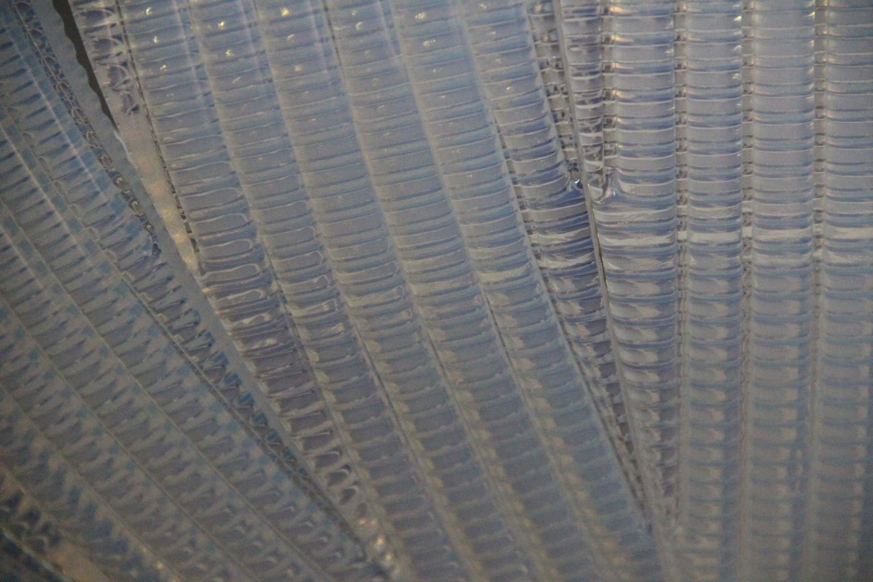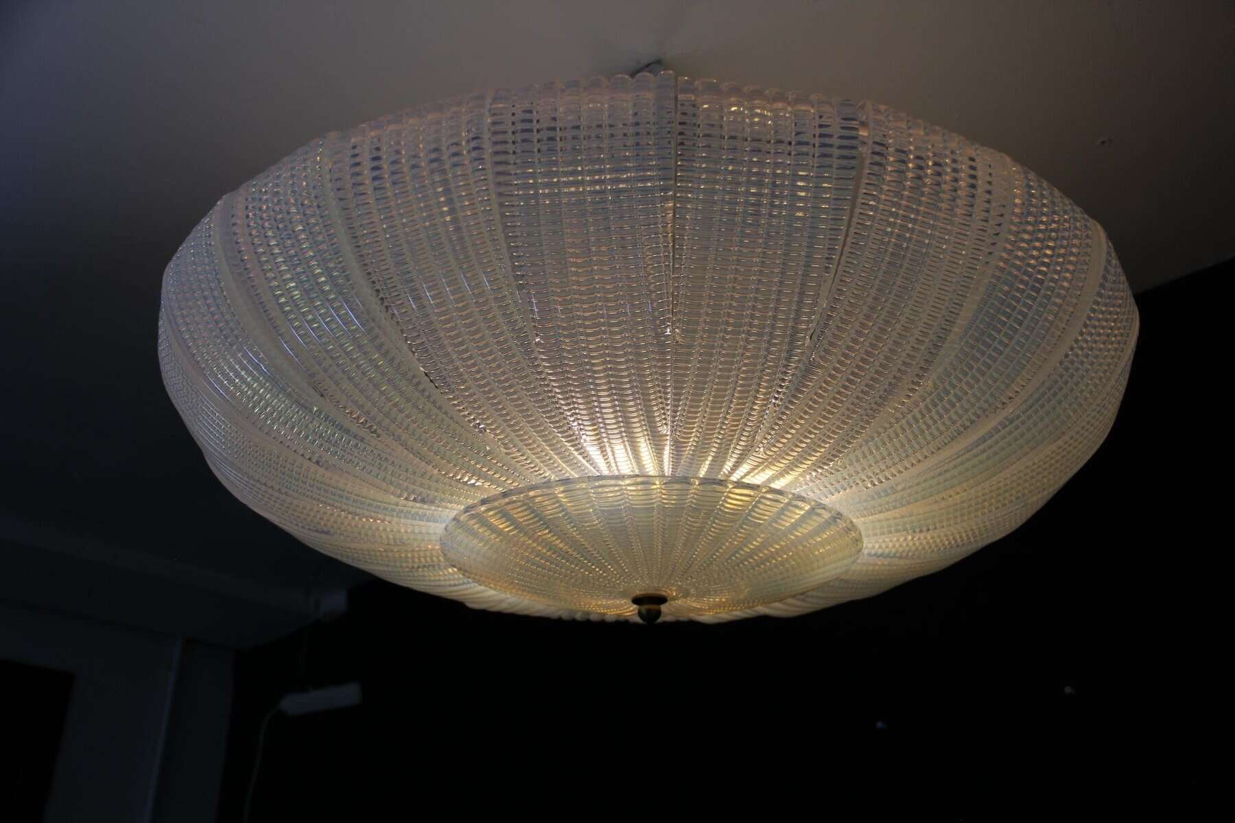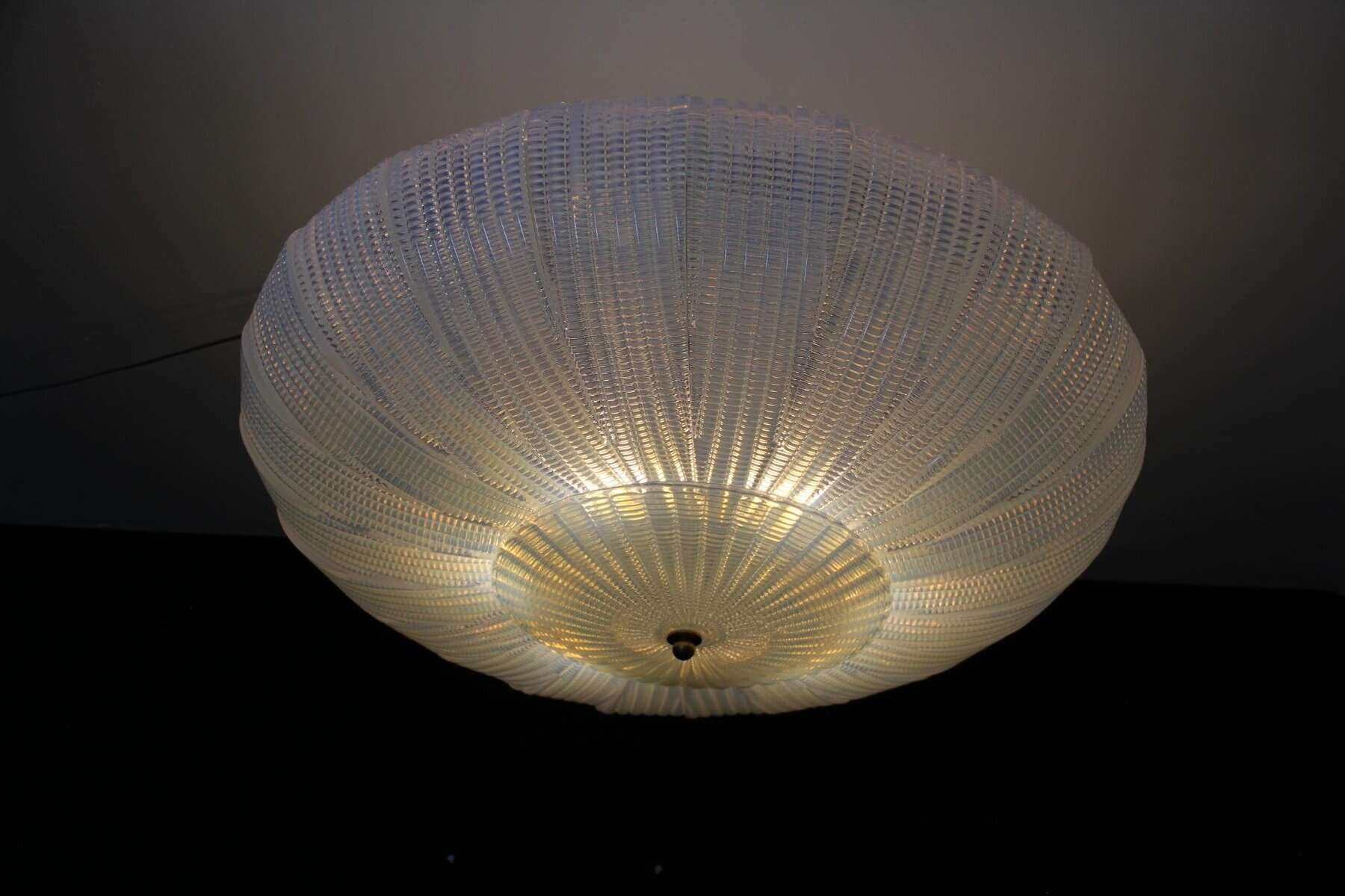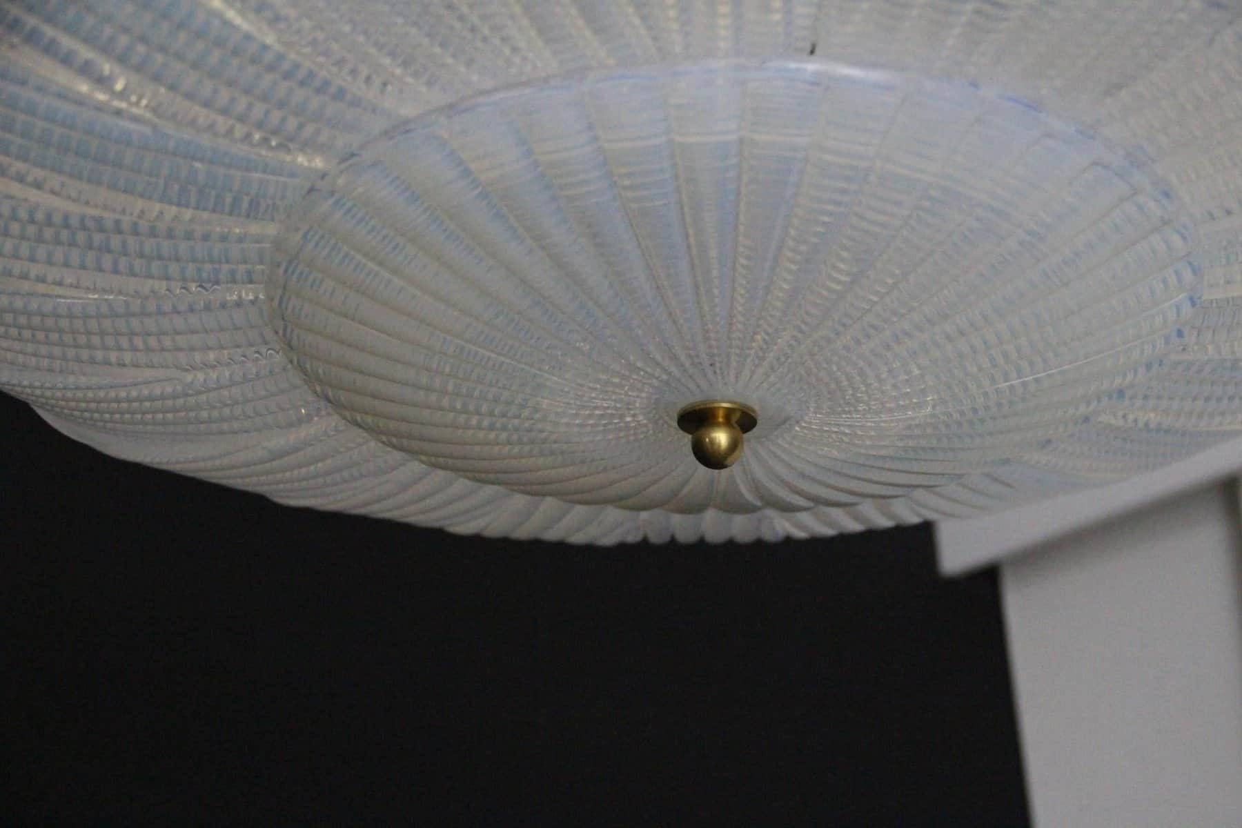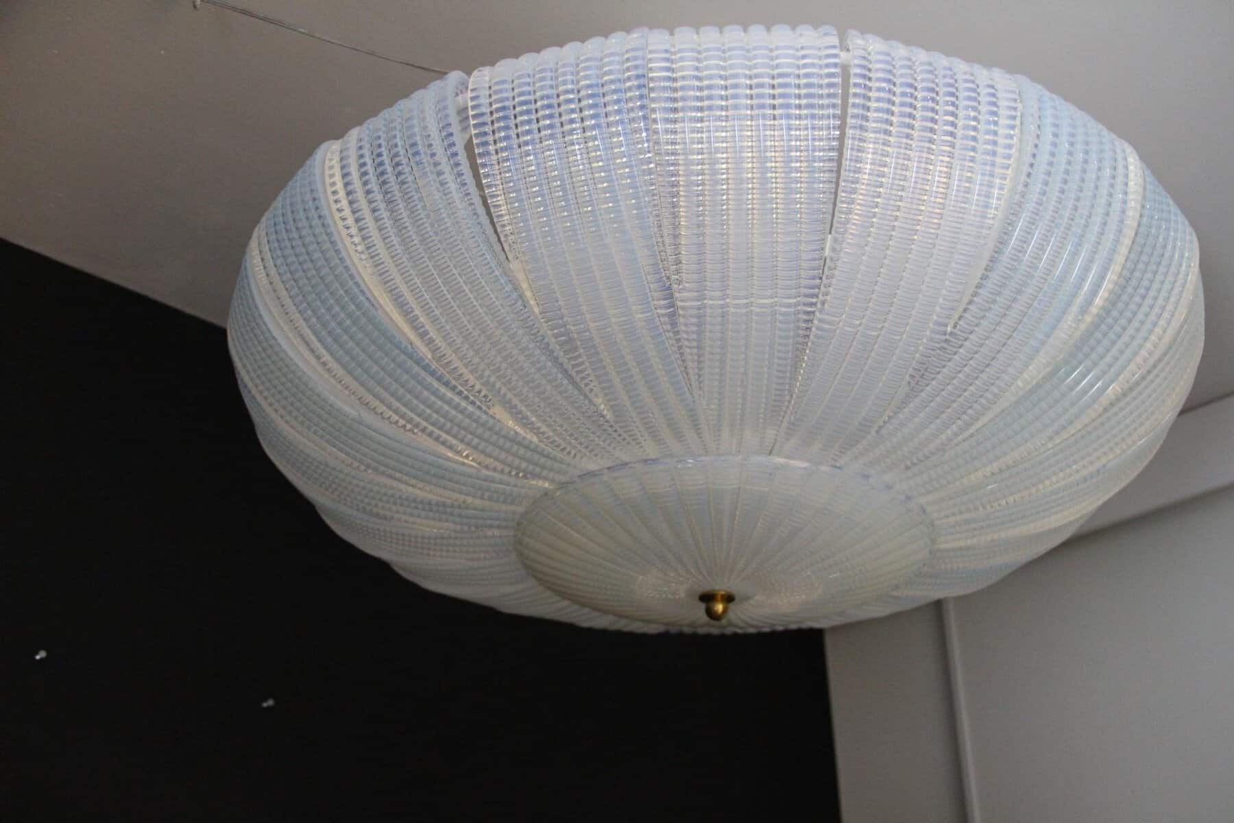 Ce magnifique lustre encastré dans le style du milieu du siècle ou de l’art déco présente un verre travaillé irisé soufflé à la main. Il est composé de 22 panneaux en verre texturé de Murano, soufflés à la main, qui ressemblent à la courbe de feuilles dont les extrémités élancées se rejoignent au milieu et reposent sur le dôme central circulaire. Chaque pièce de verre est travaillée et a été fabriquée à la main individuellement à Murano . Elles présentent différentes nuances d’irisation en fonction des couleurs et des lumières environnantes, et leurs couleurs sont inhabituelles et absolument magnifiques. Il donne une lumière très agréable et chaleureuse. Il nécessite 6 ampoules et est câblé pour les États-Unis et l’Europe. Il peut être accroché directement au plafond ou être suspendu a une chaine. Sur demande, nous pouvons vous fournir une chaîne peinte en blanc et un baldaquin assorti pour la rallonger. Sans chaîne de suspension, sa hauteur n’est que de 25 cm + crochet de suspension de 5 cm.