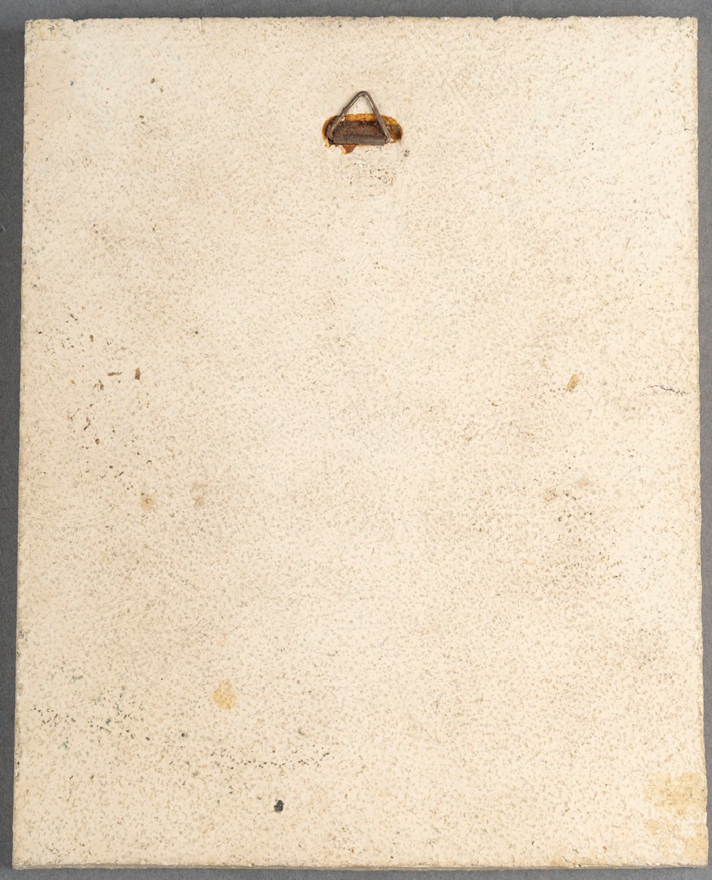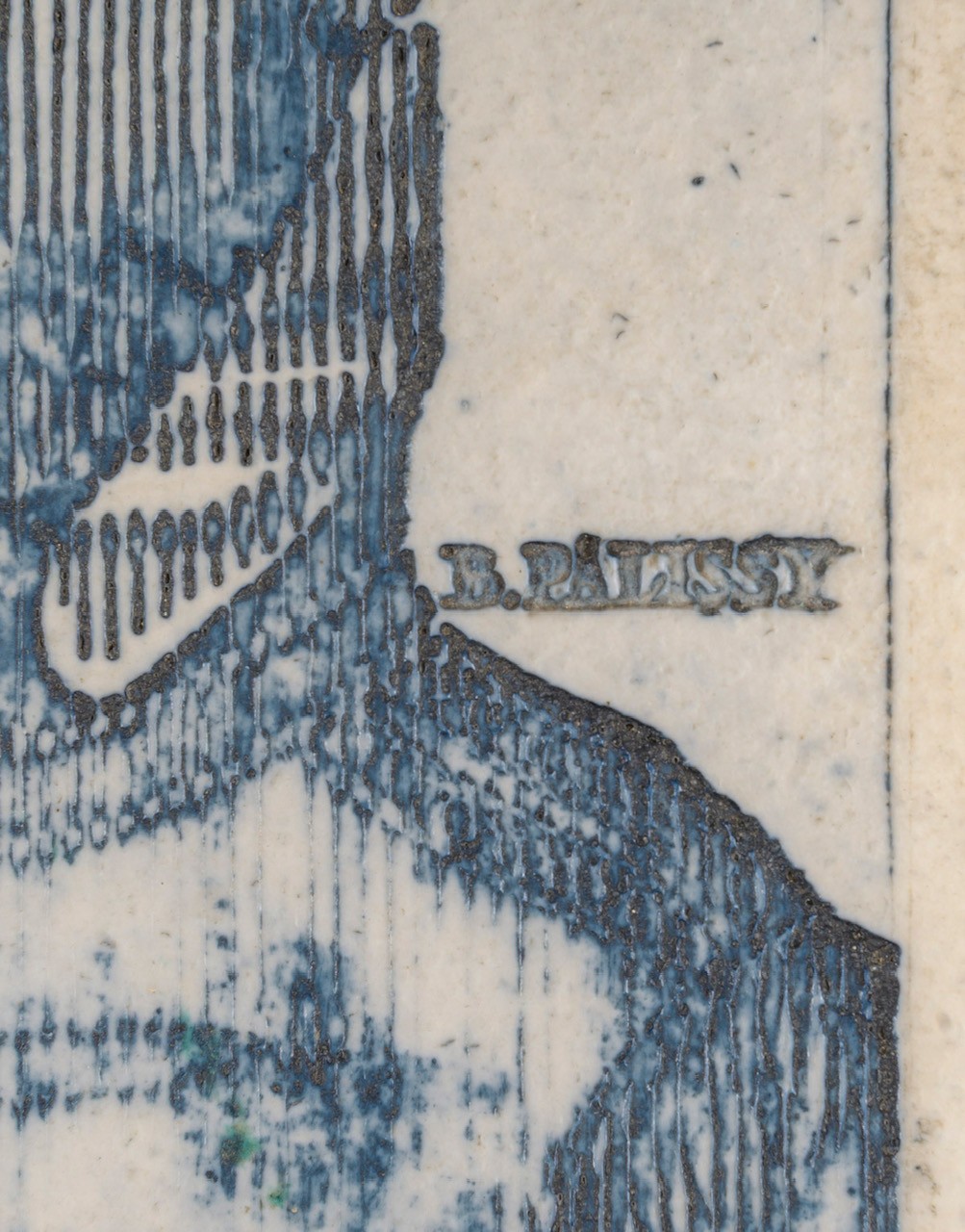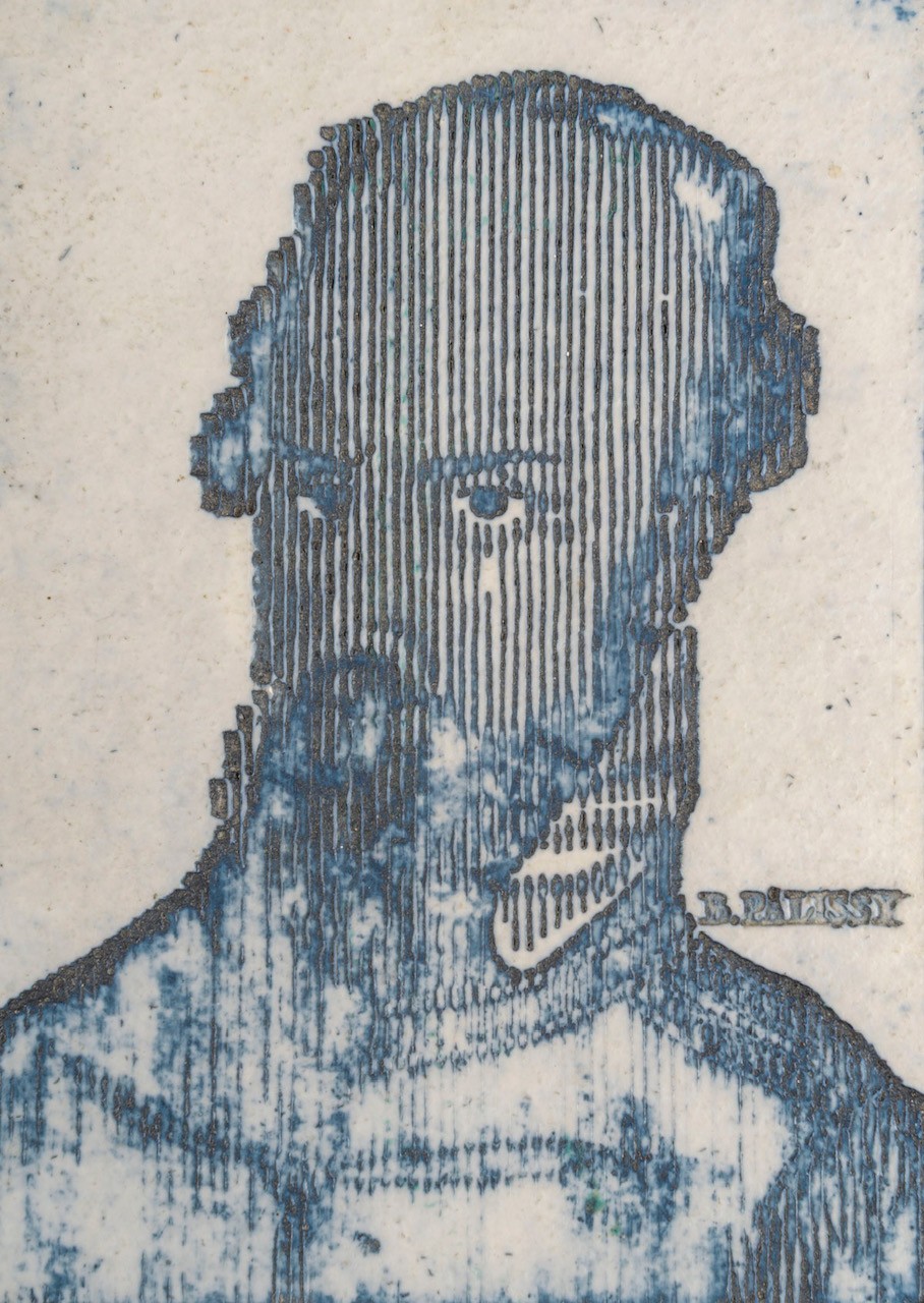 Plaque rectangulaire « Hommage à Bernard Palissy » en grès partiellement émaillé bleu.