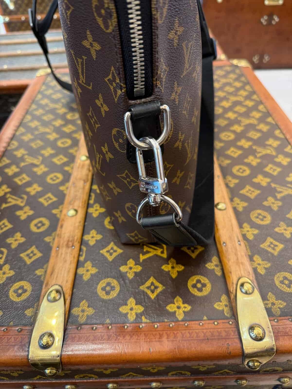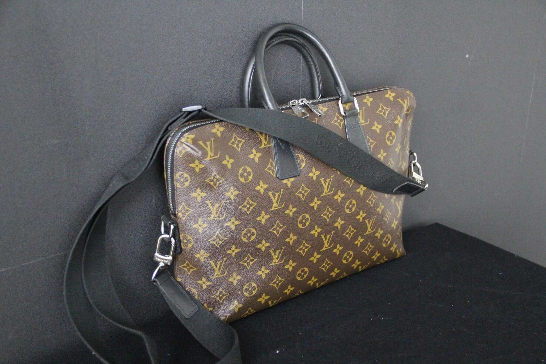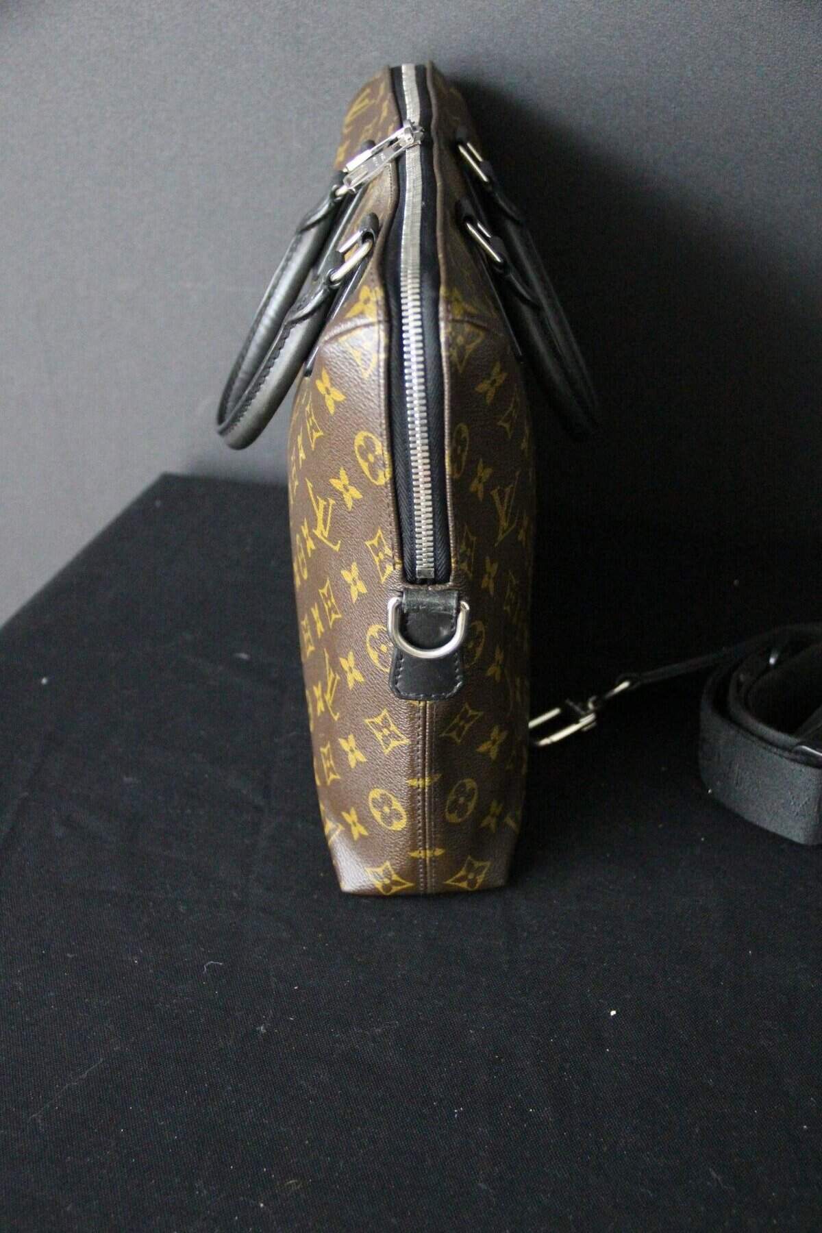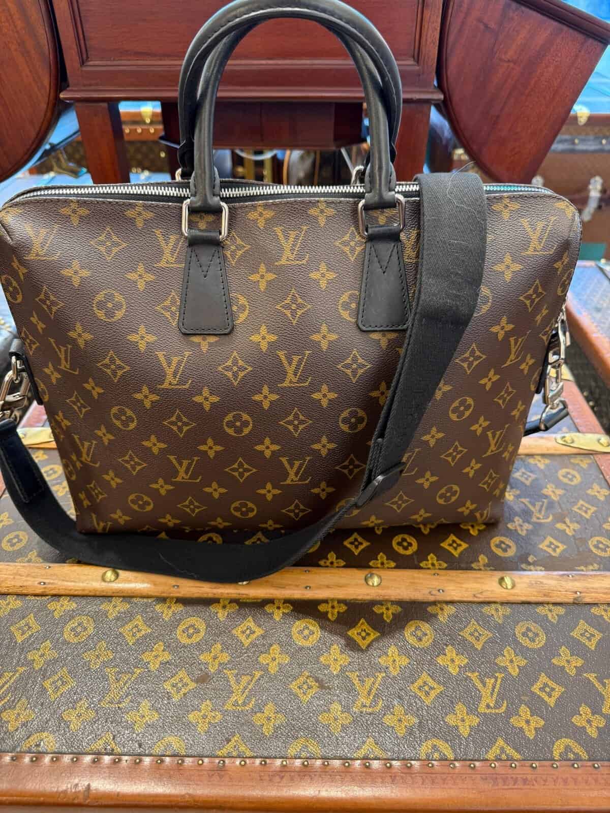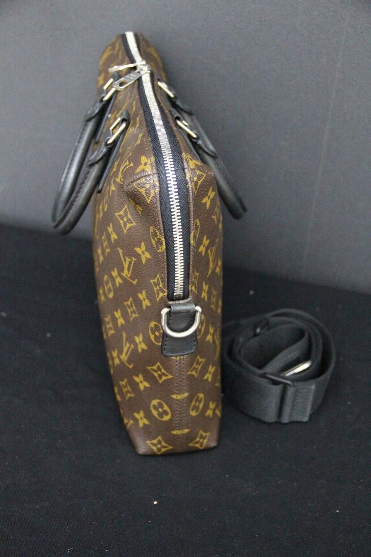 Affirmez votre style professionnel avec ce porte-documents Voyage PM Louis Vuitton élégant, confectionné dans la toile Monogram Macassar emblématique. Ce porte-documents élégant et structuré allie à la perfection l’héritage intemporel de Louis Vuitton à des détails contemporains. Confectionné dans la toile Monogram marron emblématique de la maison, il est rehaussé de finitions en cuir noir lisse et de poignées roulées pour une esthétique raffinée et masculine. Les finitions palladium, notamment la double fermeture à glissière et les anneaux en D sur les côtés, renforcent son charme raffiné. La bandoulière amovible et réglable en toile noire permet de la porter de différentes manières (à la main, à l’épaule ou en bandoulière), ce qui la rend idéale pour les voyages d’affaires ou une utilisation quotidienne au bureau. L’intérieur spacieux, zippé sur tout le pourtour, est doublé d’une toile brune riche et organisée de manière judicieuse avec de multiples poches plates et emplacements pour stylos, offrant ainsi suffisamment d’espace pour les documents, un ordinateur portable et les objets essentiels du quotidien. À l’intérieur, on trouve une étiquette en cuir noir estampillée Louis Vuitton ainsi qu’un code date dans une poche intérieure. La silhouette structurée assure une présentation professionnelle tout en conservant une légèreté pratique. Très bon état . La toile extérieure est propre et éclatante, avec une structure impeccable. Les garnitures et les poignées en cuir présentent une usure minimale. La doublure intérieure est propre et bien entretenue, sans tache ni odeur. Les ferrures sont brillantes, en bon état, avec quelques traces d’usure légères. Une pièce intemporelle et fonctionnelle de Louis Vuitton, parfaite pour les collectionneurs avertis ou les professionnels à la recherche d’un luxe discret. Cette mallette Vuitton est un sac léger et souple. Assez spacieuse pour contenir un ordinateur portable de 16 pouces dans son compartiment intérieur rembourré, elle est dotée d’une bandoulière amovible et réglable pour être portée à l’épaule ou en bandoulière. Son design étroit permet également de la porter comme une pochette. Ses dimensions sont les suivantes : 40 cm x 7 cm et 27 cm de hauteur + ses poignées.