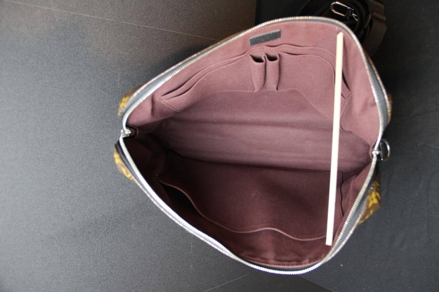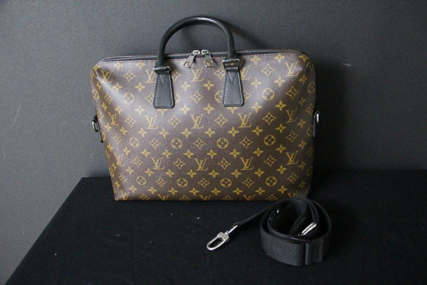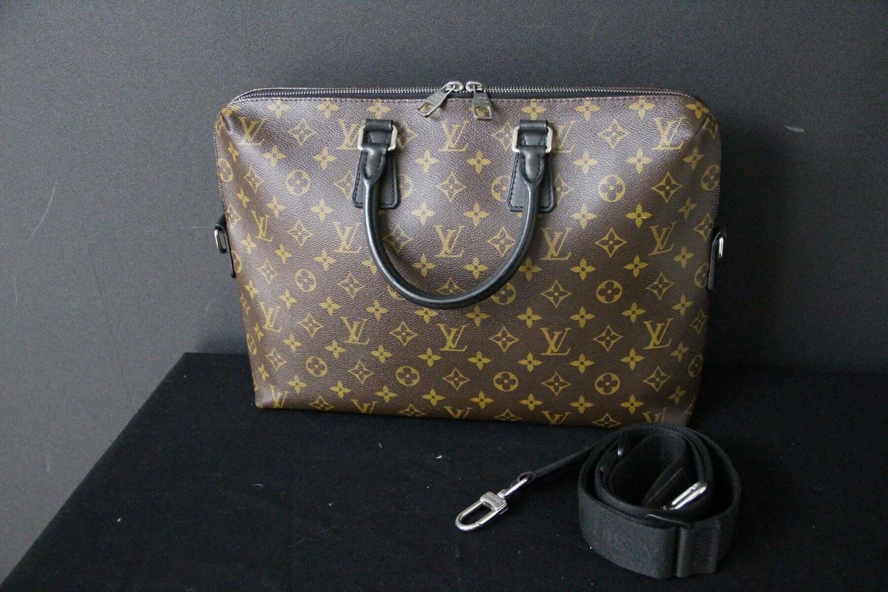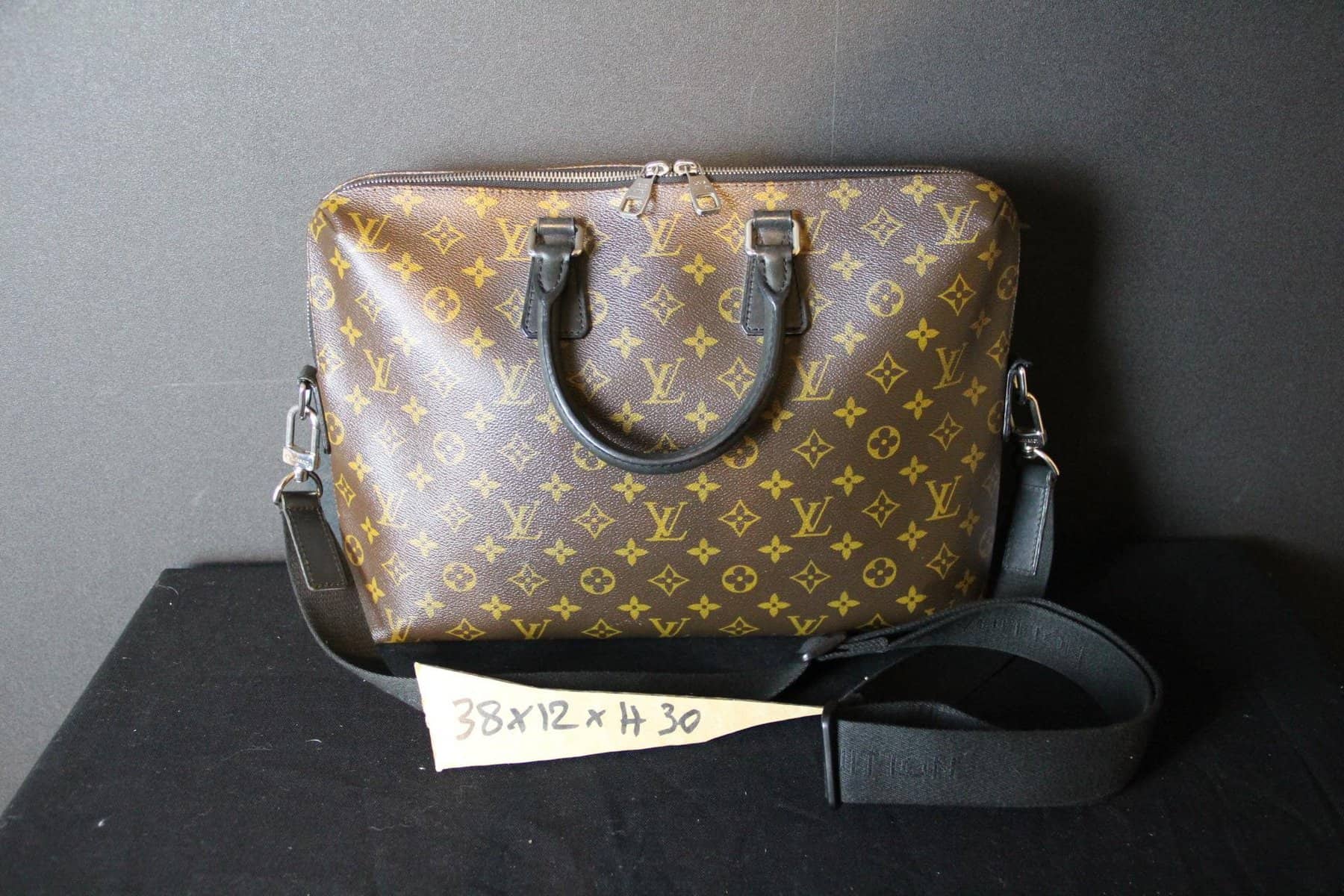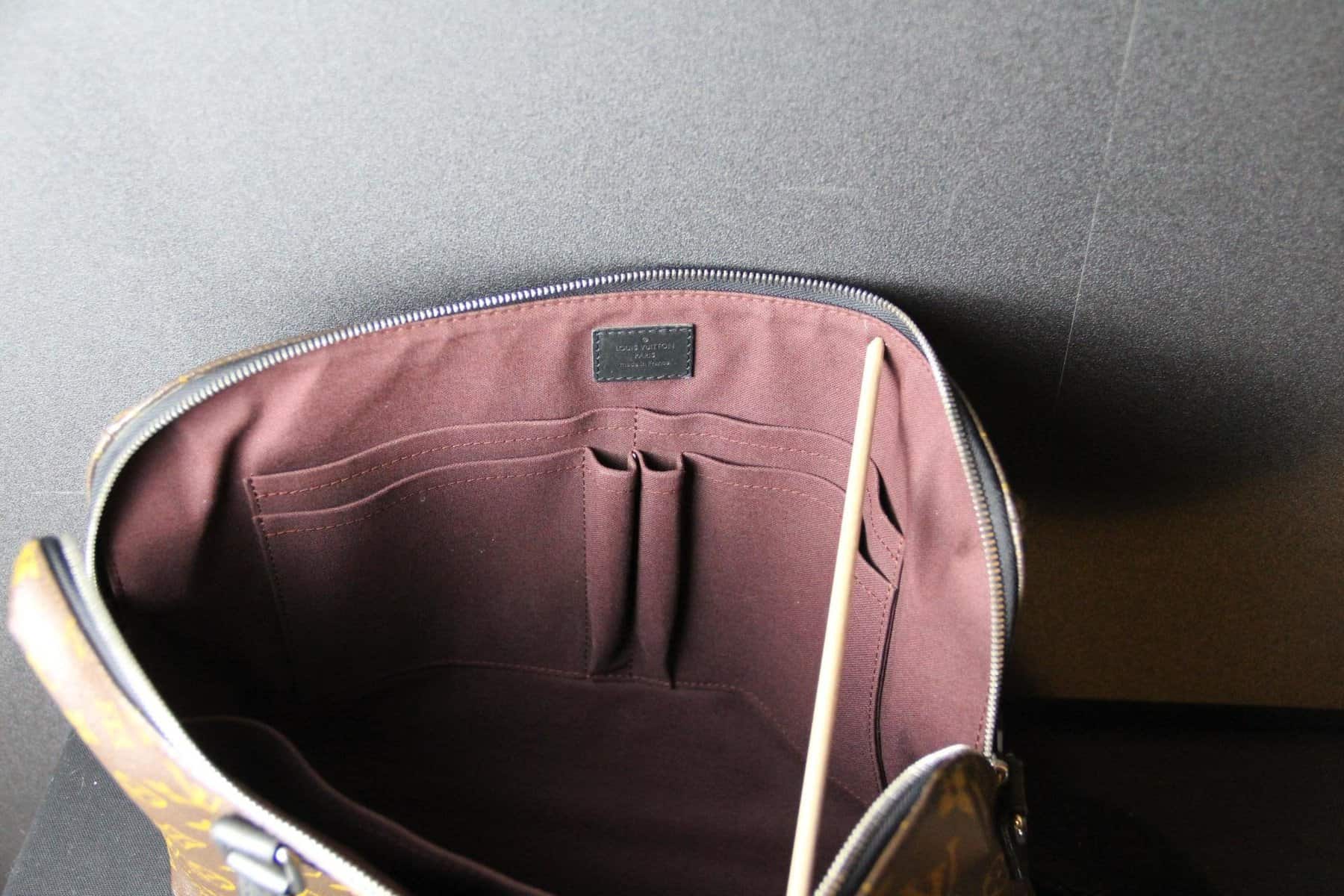 Affirmez votre style professionnel avec ce porte-documents Voyage PM Louis Vuitton élégant, confectionné dans la toile Monogram Macassar emblématique. Ce porte-documents élégant et structuré allie à la perfection l’héritage intemporel de Louis Vuitton à des détails contemporains. Confectionné dans la toile Monogram marron emblématique de la maison, il est rehaussé de finitions en cuir noir lisse et de poignées roulées pour une esthétique raffinée et masculine. Les finitions palladium, notamment la double fermeture à glissière et les anneaux en D sur les côtés, renforcent son charme raffiné. La bandoulière amovible et réglable en toile noire permet de la porter de différentes manières (à la main, à l’épaule ou en bandoulière), ce qui la rend idéale pour les voyages d’affaires ou une utilisation quotidienne au bureau. L’intérieur spacieux, zippé sur tout le pourtour, est doublé d’une toile brune riche et organisée de manière judicieuse avec de multiples poches plates et emplacements pour stylos, offrant ainsi suffisamment d’espace pour les documents, un ordinateur portable et les objets essentiels du quotidien. À l’intérieur, on trouve une étiquette en cuir noir estampillée Louis Vuitton ainsi qu’un code date dans une poche intérieure. La silhouette structurée assure une présentation professionnelle tout en conservant une légèreté pratique. Très bon état . La toile extérieure est propre et éclatante, avec une structure impeccable. Les garnitures et les poignées en cuir présentent une usure minimale. La doublure intérieure est propre et bien entretenue, sans tache ni odeur. Les ferrures sont brillantes, en bon état, avec quelques traces d’usure légères. Une pièce intemporelle et fonctionnelle de Louis Vuitton, parfaite pour les collectionneurs avertis ou les professionnels à la recherche d’un luxe discret. Cette mallette Vuitton est un sac léger et souple. Assez spacieuse pour contenir un ordinateur portable de 16 pouces dans son compartiment intérieur rembourré, elle est dotée d’une bandoulière amovible et réglable pour être portée à l’épaule ou en bandoulière. Son design étroit permet également de la porter comme une pochette. Ses dimensions sont les suivantes : 40 cm x 7 cm et 27 cm de hauteur + ses poignées.