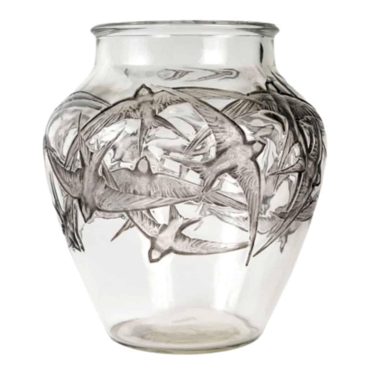 Vase « Hirondelles » en verre blanc moulé pressé et rehaussé avec une patine grise