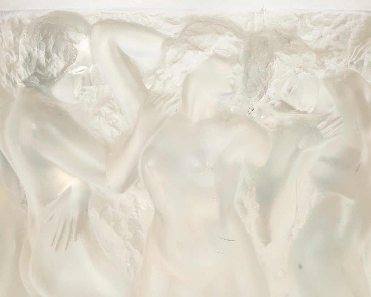 René Lalique a été inspiré par la représentation du corps féminin tout au long de sa carrière. Les Bacchantes correspondent aux Ménades de la mythologie grecque. Ici, les jeunes prêtresses de Bacchus forment une ronde de nus sculpturaux en bas-relief à la sensualité troublante et dansent pour célébrer le dieu du vin, de la vigne et des excès.