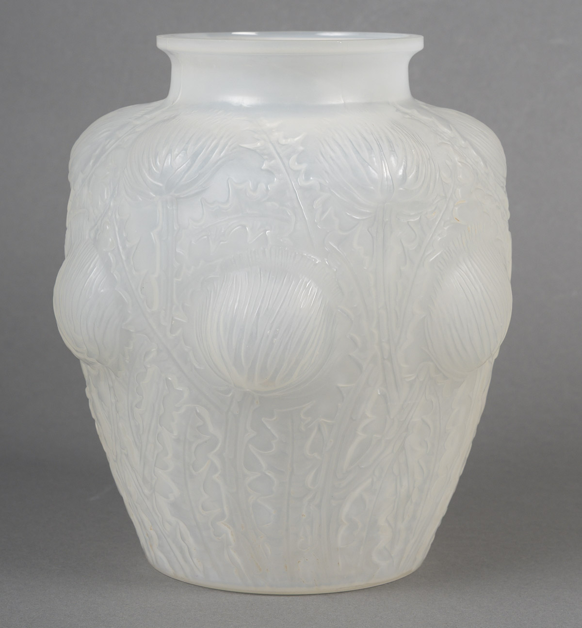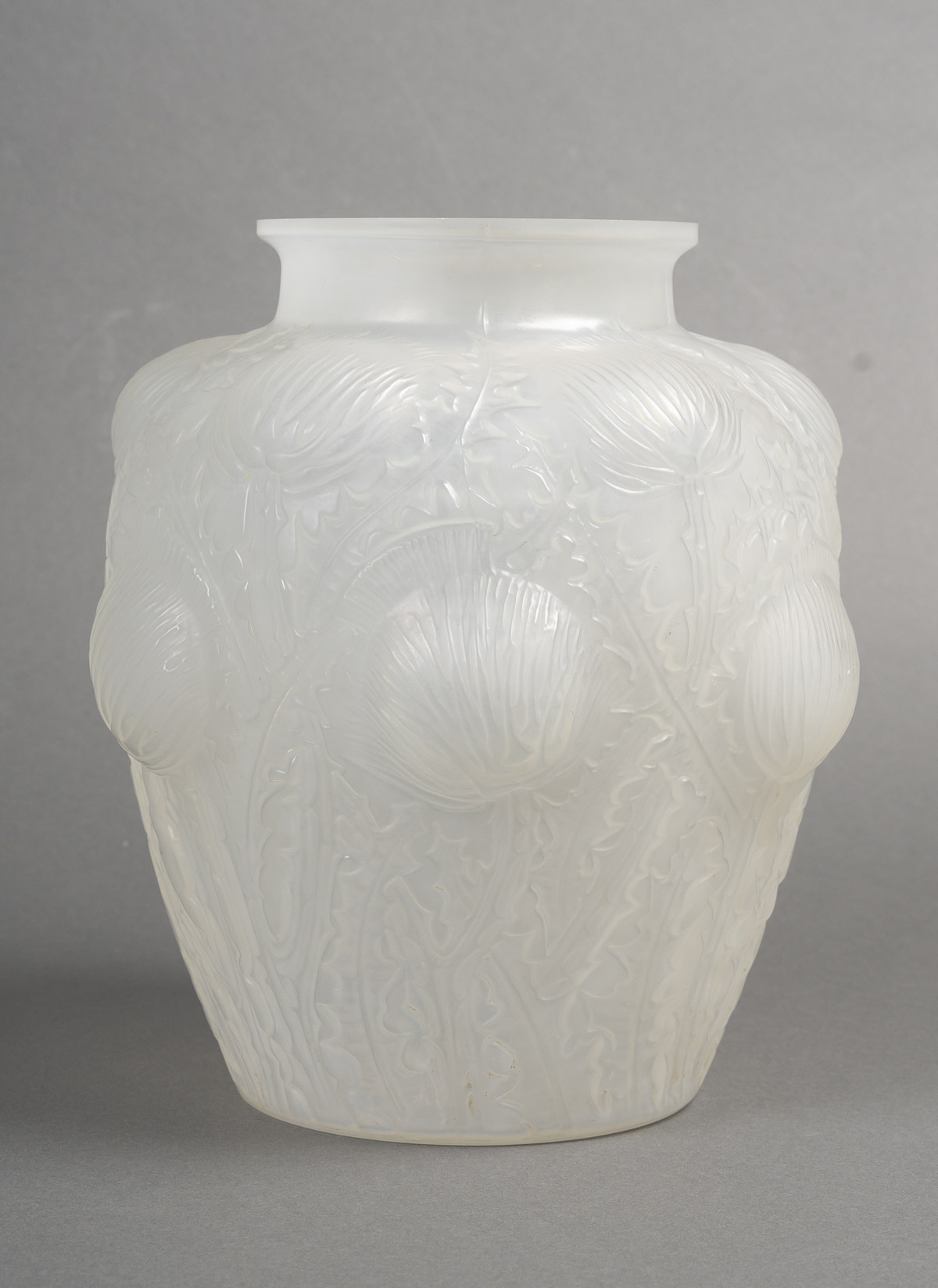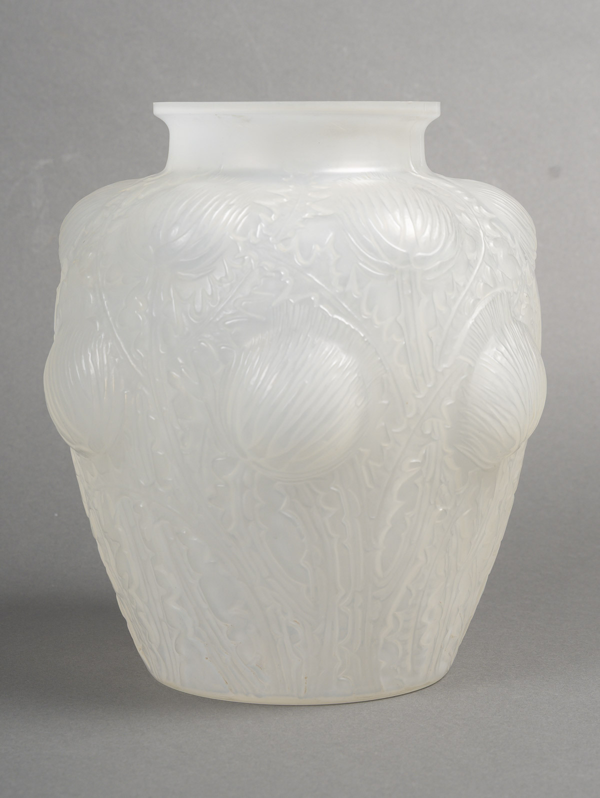 Vase “Domrémy” dit aussi « aux Chardons » créé le 16 novembre 1926 modèle en verre blanc soufflé, moulé, patiné opalescent et couleur (opaque).