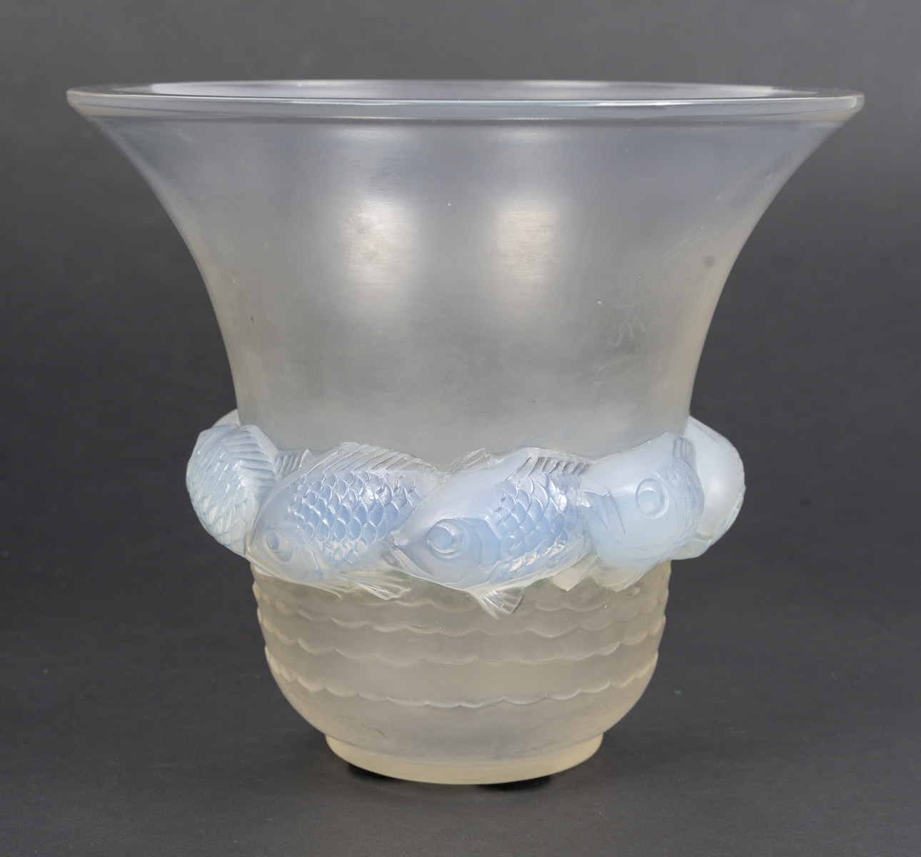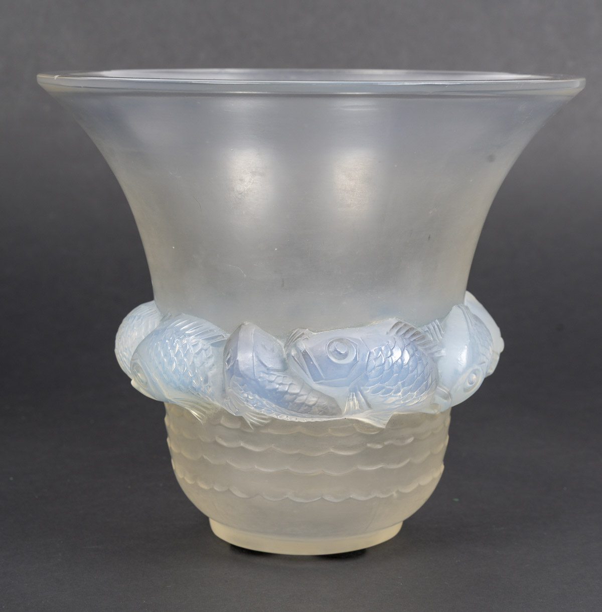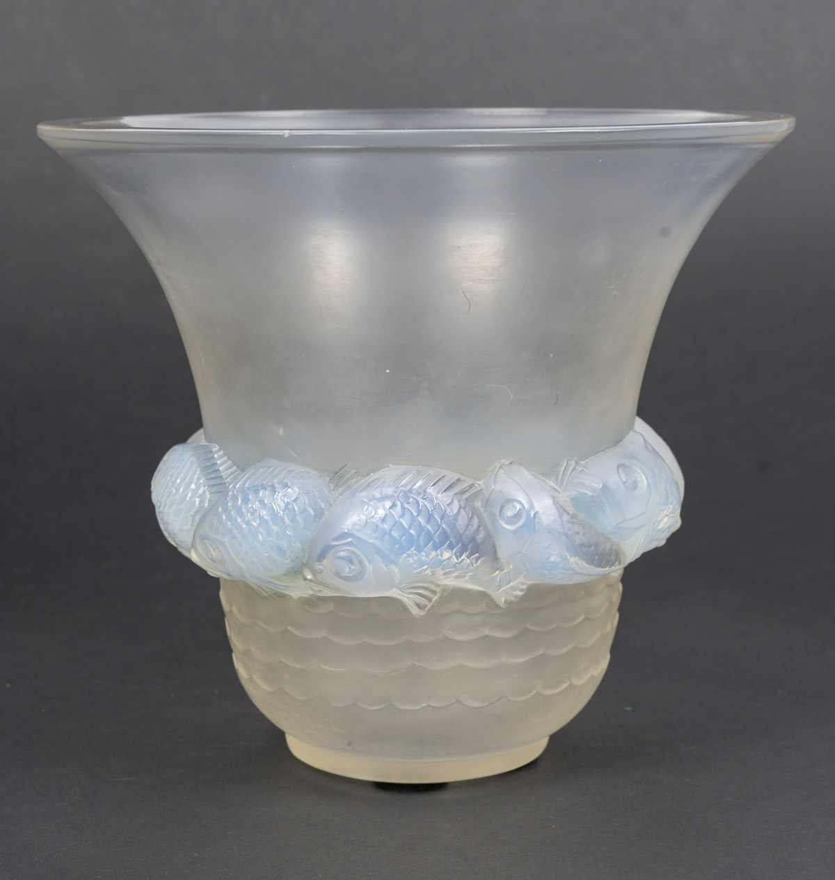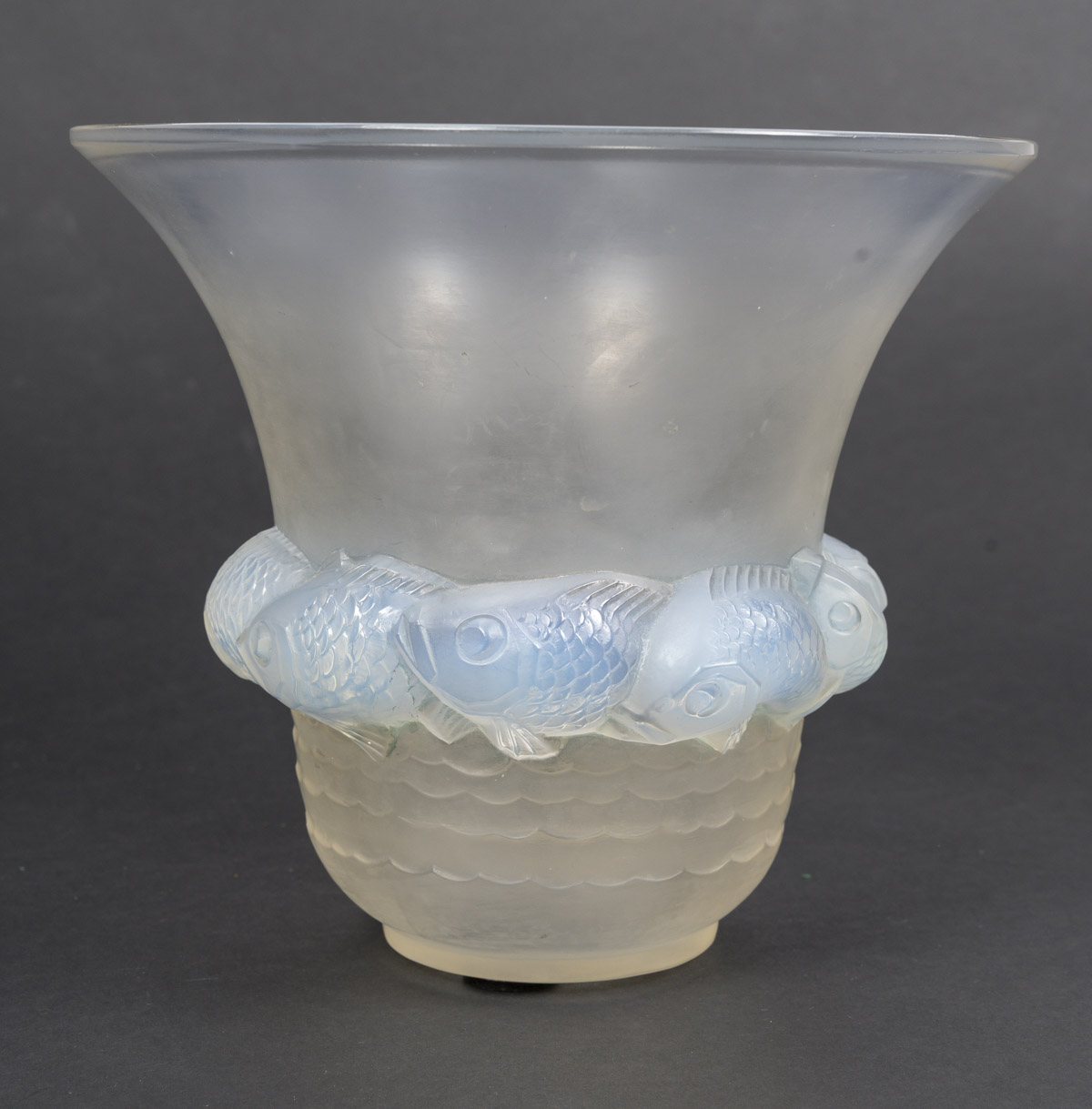 Vase PIRIAC, en verre blanc moulé pressé patiné, opalescent décoré d’une ronde de poissons.