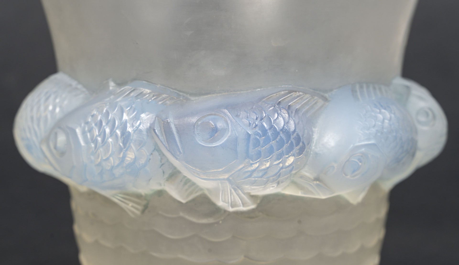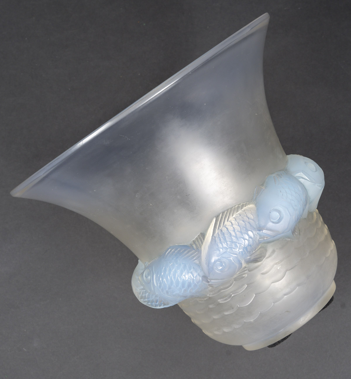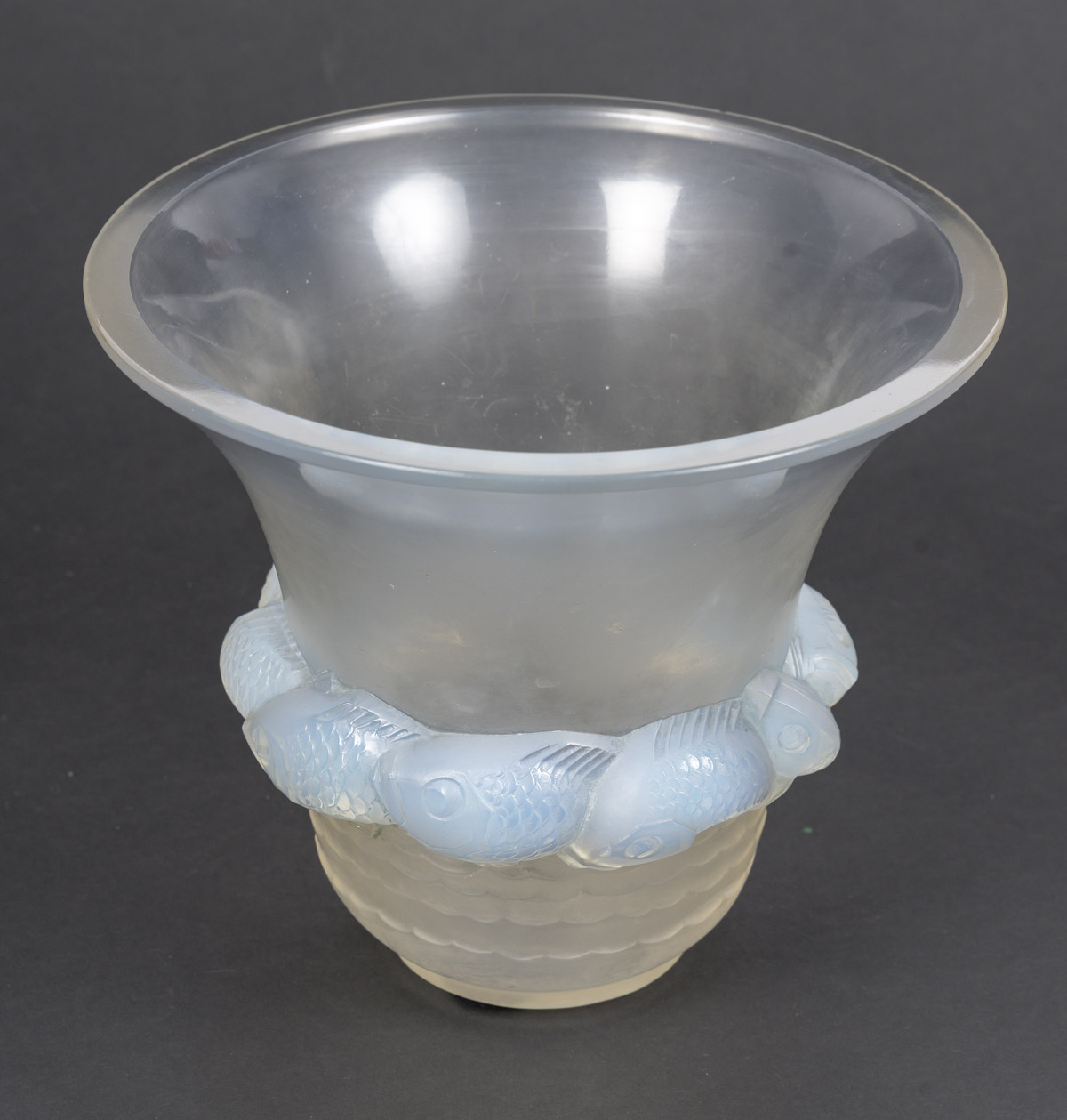Vase PIRIAC, en verre blanc moulé pressé patiné, opalescent décoré d’une ronde de poissons.
