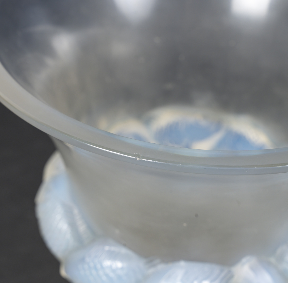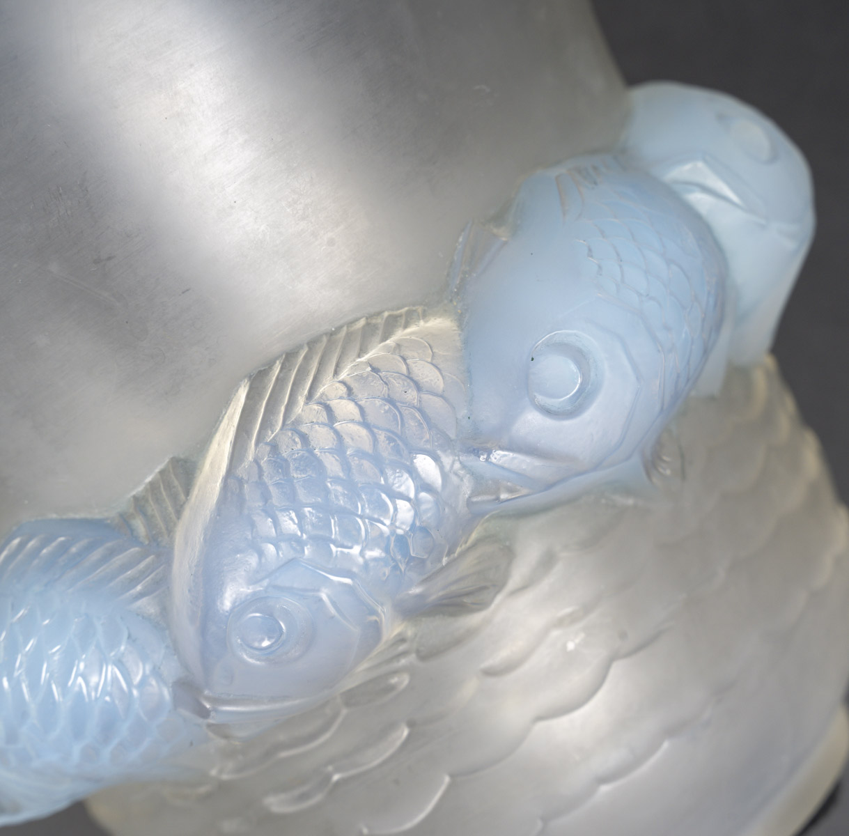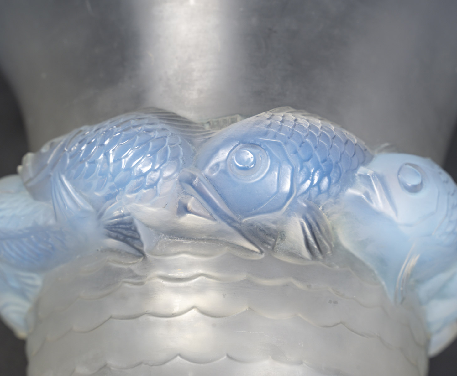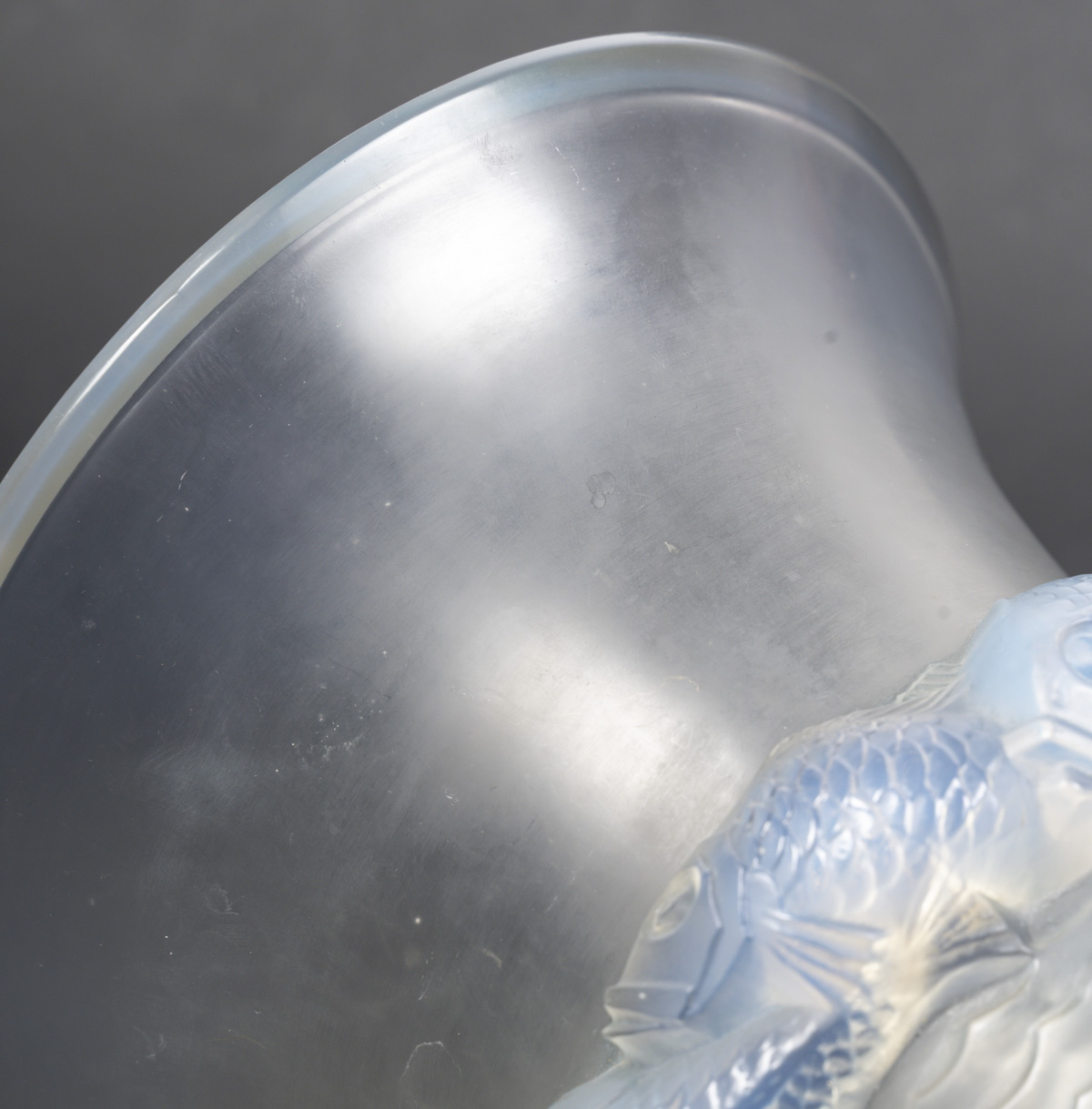 Vase PIRIAC, en verre blanc moulé pressé patiné, opalescent décoré d’une ronde de poissons.