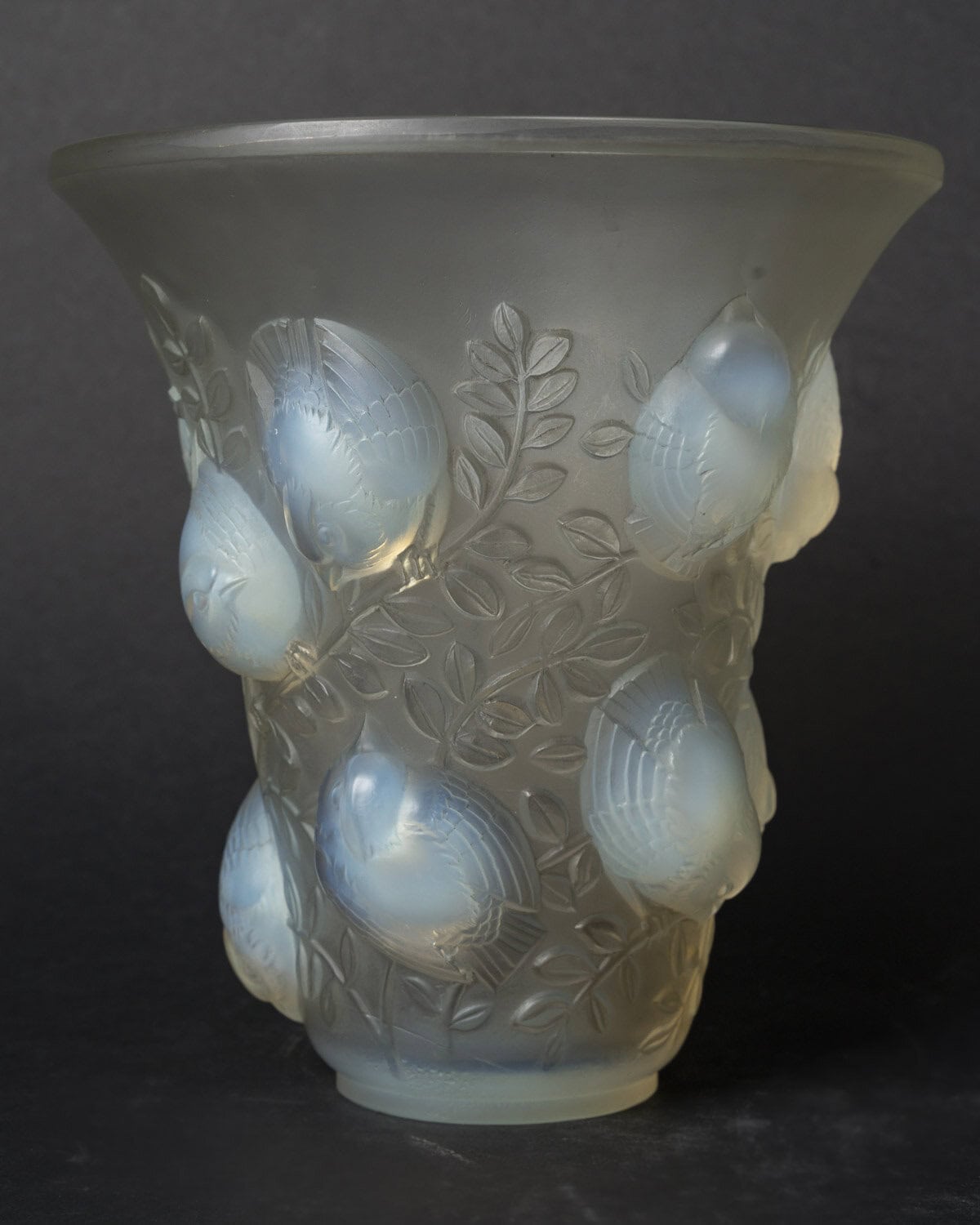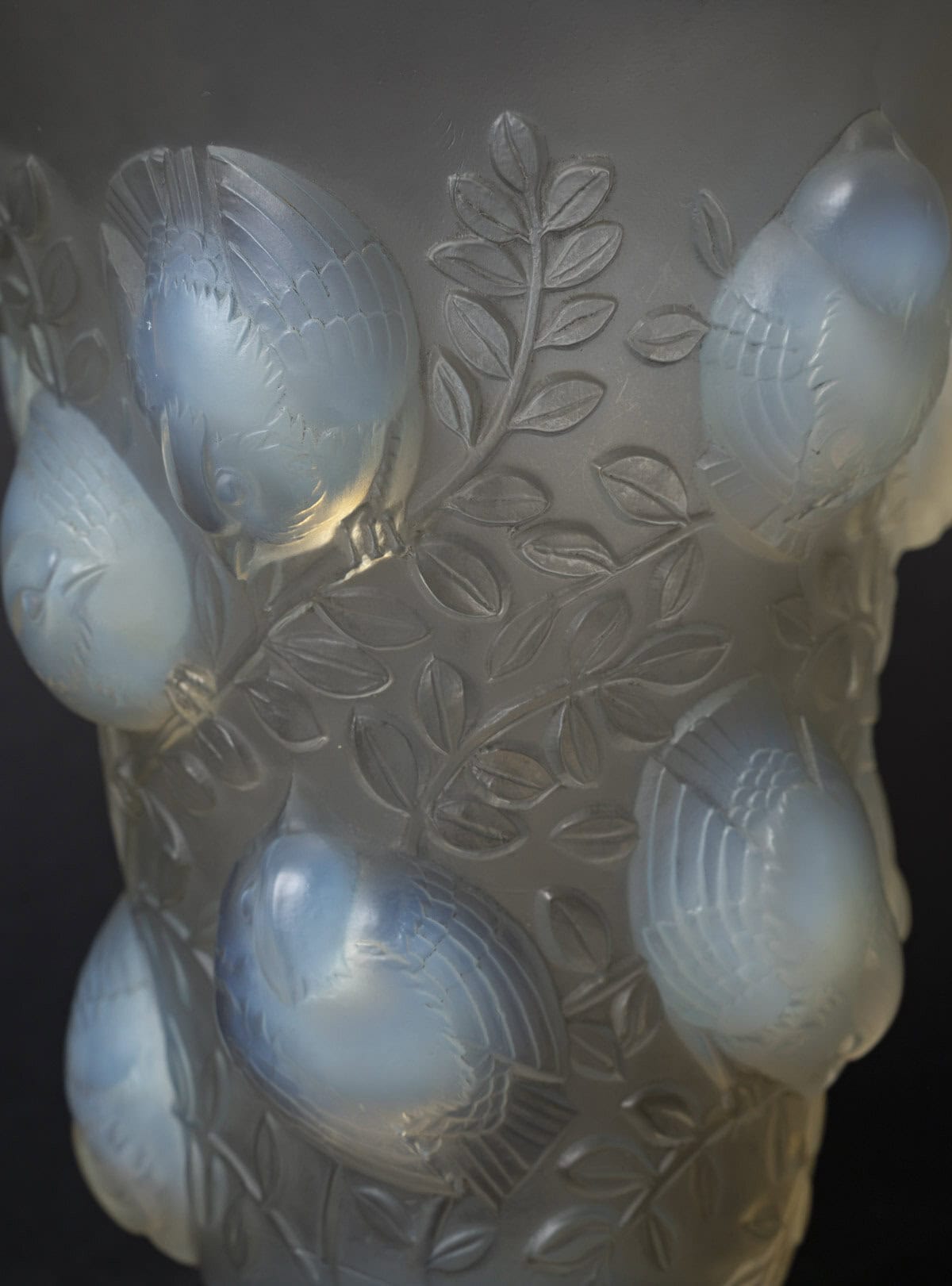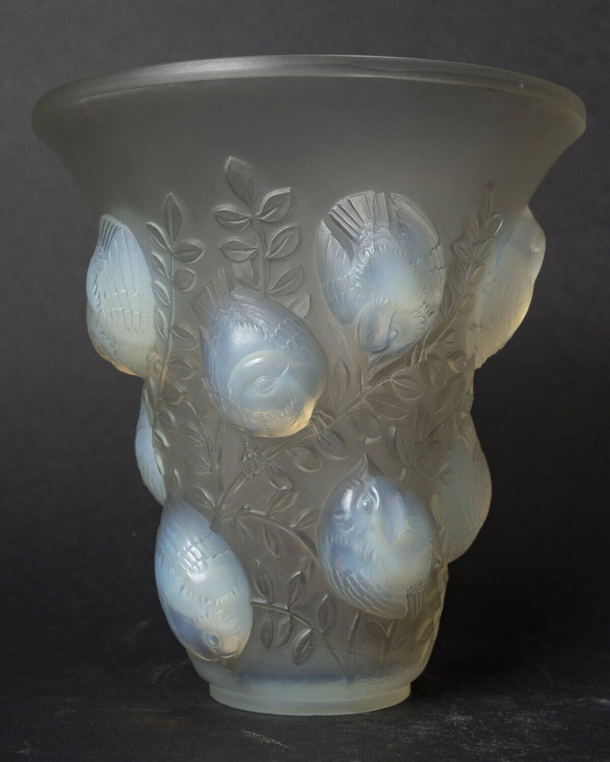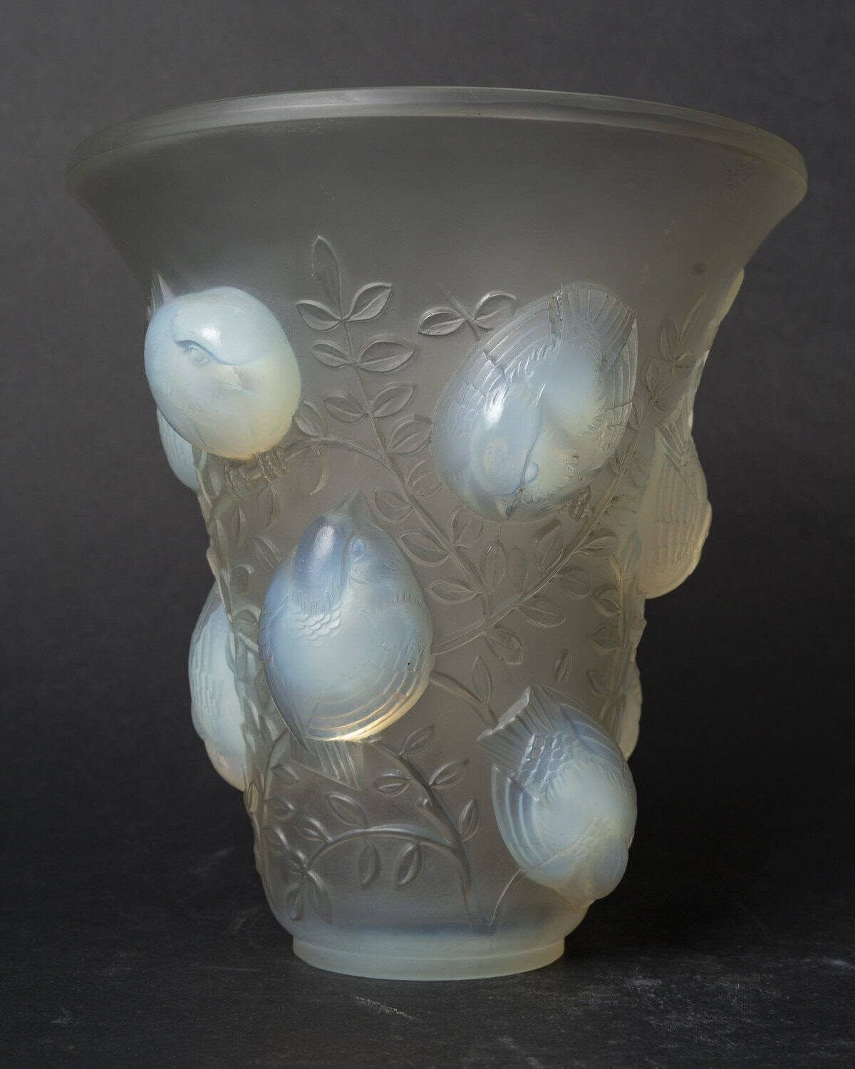Vase en verre blanc moulé et pressé opalescent représentant des moineaux sur leur branche. Modèle créé le 4 octobre 1930
