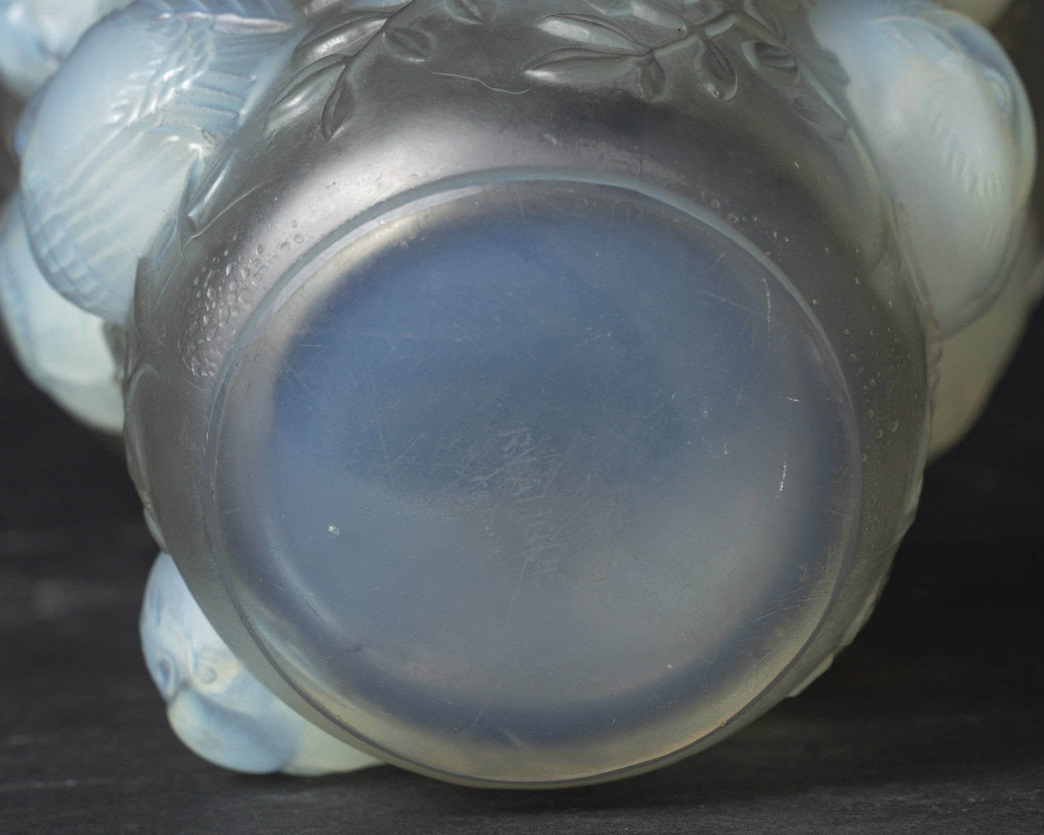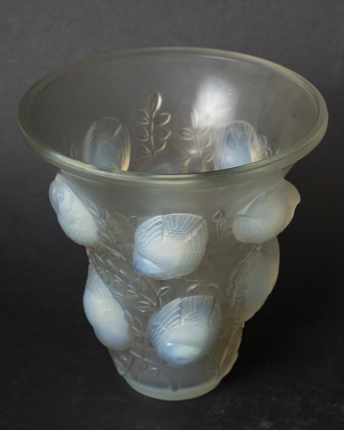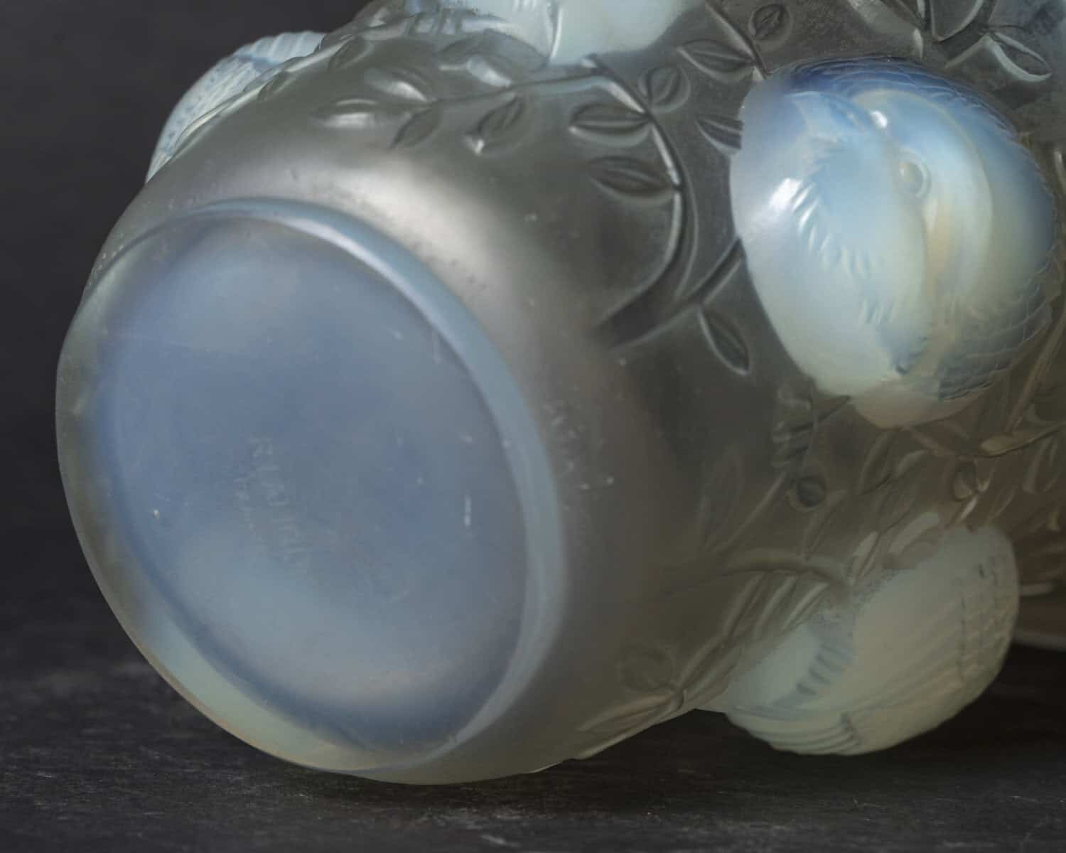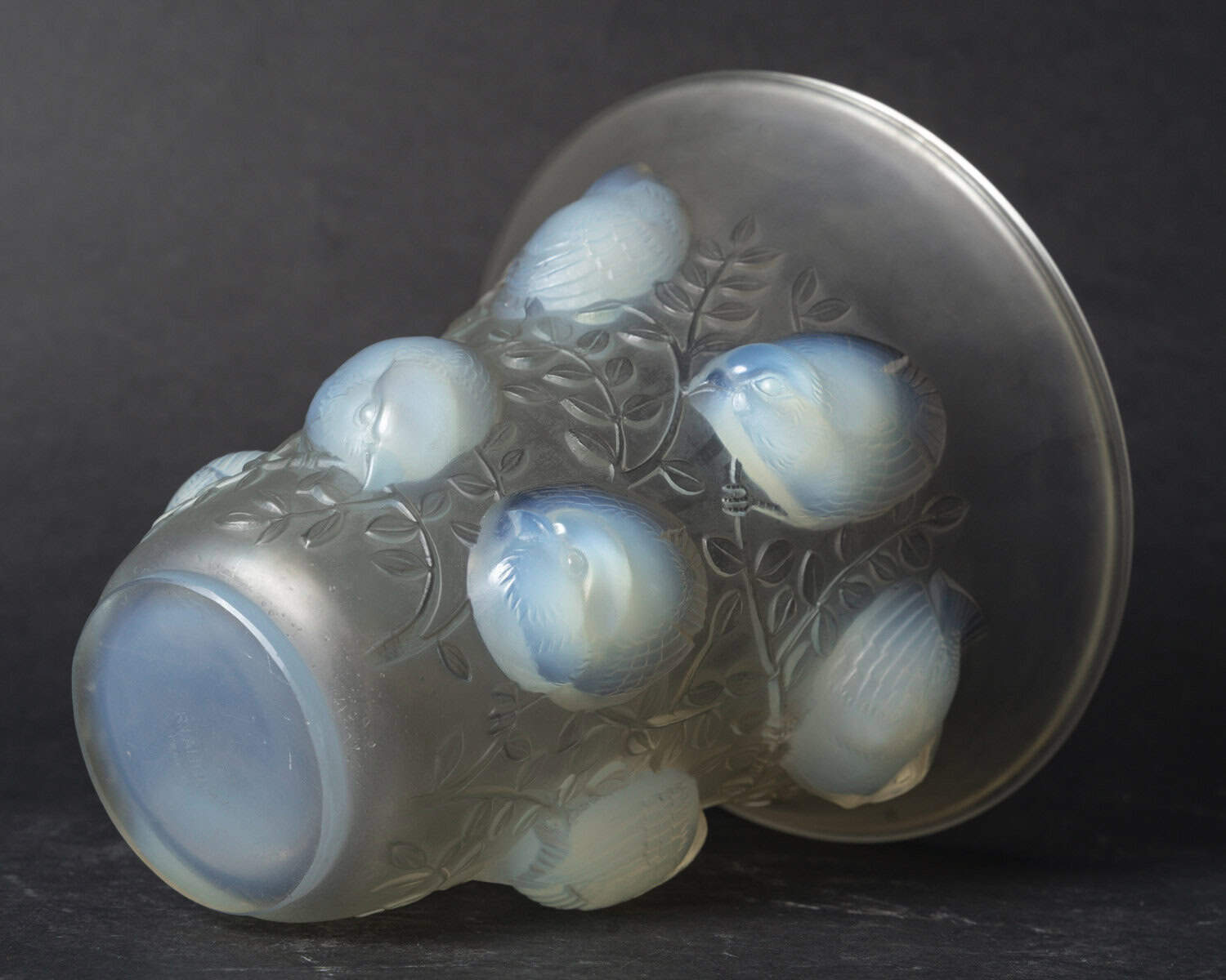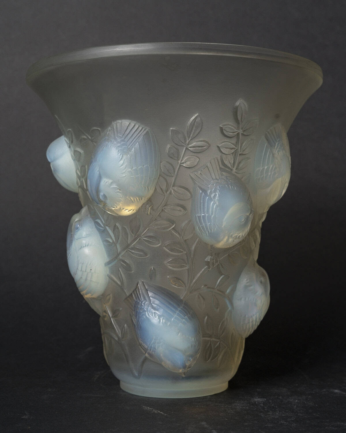 Vase en verre blanc moulé et pressé opalescent représentant des moineaux sur leur branche. Modèle créé le 4 octobre 1930